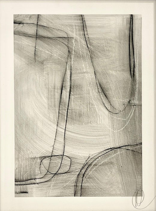 In dieser Komposition überlagern sich schwungvolle Bögen mit subtilen strukturellen Formen, die eine Spannung zwischen fließender Bewegung und ruhiger architektonischer Ordnung erzeugen. Schichten aus Graphit, Holzkohle und durchscheinenden Lavierungen bilden eine strukturierte Oberfläche, die sowohl Bewegung als auch Zurückhaltung erkennen lässt. Die monochromatische Palette verstärkt die skulpturale Qualität der Zeichnung und ermöglicht es dem Betrachter, sich auf die Nuancen von Duncans Zeichen und die wechselnde Tiefe innerhalb der Komposition zu konzentrieren.
