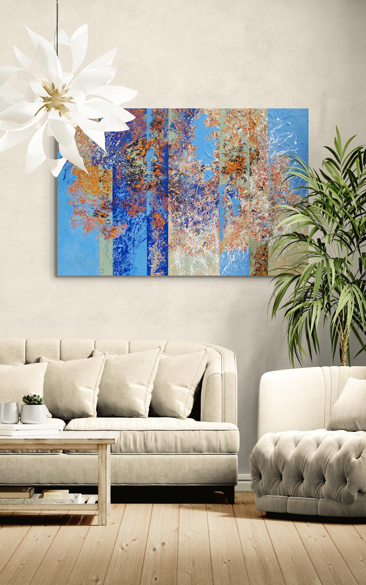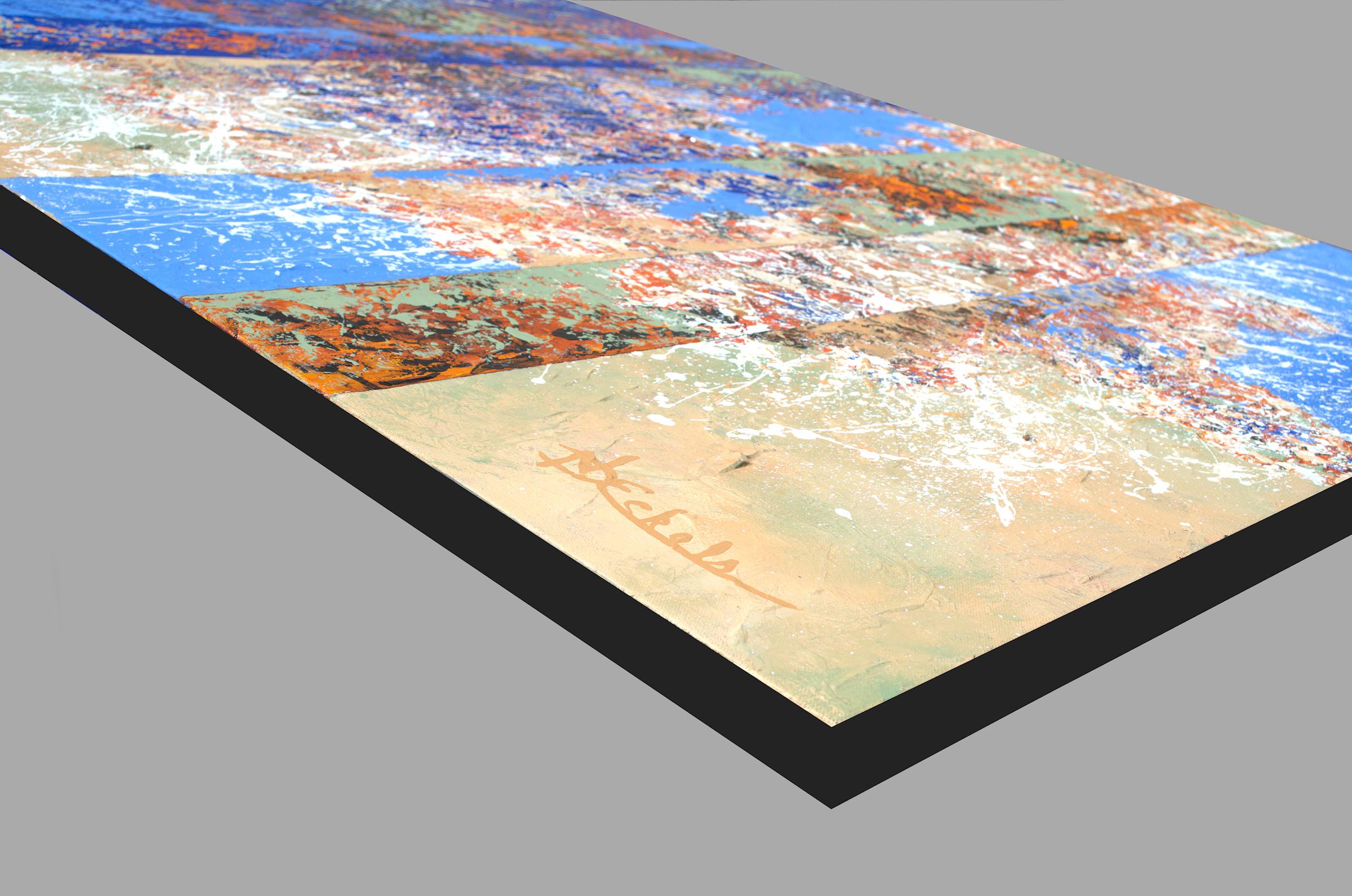 Nancy Eckels"Calm and Chaos" mixed media abstract with textural blues, orange, and reds2025