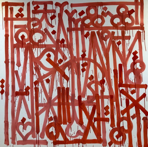 Auf den ersten Blick wirken Retnas Drucke und Gemälde wie eine unentdeckte antike Schrift: eine Reihe hypnotischer Symbole - komplex, schön und fesselnd. Aber er hat ein originelles Alphabet geschaffen, das Einflüsse der alten Inka- und ägyptischen Hieroglyphen, des Arabischen, der asiatischen Kalligrafie, des Graffiti, der Schwarzschrift, der römischen Schrift und der hebräischen Schrift miteinander verbindet.