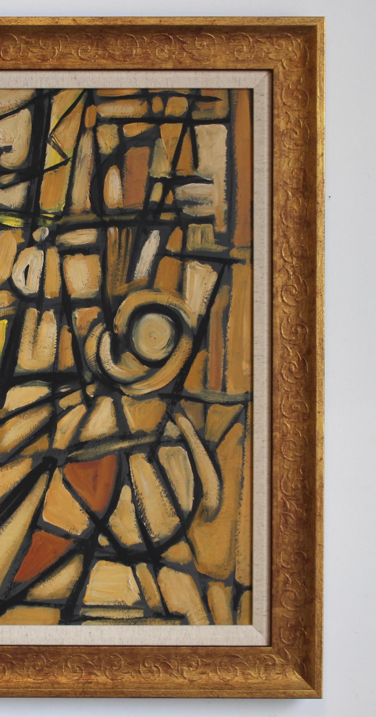 "Die Vanguard-Serie Nr. XIII: A Collection of Postwar European Abstractions", Öl auf Karton, von STM (ca. 1950-70er Jahre). Diese Sammlung vereint lebendige, abstrakte Kompositionen, die von einer lose verbundenen Gruppe von Künstlern geschaffen wurden, von denen man annimmt, dass sie zwischen den 1950er und 1970er Jahren aktiv waren, und zwar auf der Grundlage von Materialien, Techniken und Provenienz. Die Gemälde dieser Serie spiegeln den anhaltenden Einfluss des Modernismus des frühen 20. Jahrhunderts wider. Kubistische Strukturen, gebrochene Perspektiven und kühne Farbfelder verweisen auf das Erbe von Picasso, Braque und Gris, während die rohe Energie und der Erfindungsreichtum von einer Generation sprechen, die entschlossen war, nach dem Krieg ihren eigenen künstlerischen Weg zu gehen. Sie sind auffallend modern und doch reich an historischer Resonanz. Diese Kunstwerke wurden in den letzten Jahren aus längst vergessenen Verstecken ausgegraben und schonend konserviert. Ihr Charme liegt nicht nur in ihrer ästhetischen Kraft, sondern auch in ihrem Geheimnis - jedes einzelne ist ein Fragment einer künstlerischen Bewegung, die nie einen Namen hatte, deren Geist aber in diesen fesselnden Werken weiterlebt. Jeder einzelne lädt zu Neugier, Gesprächen und einer tieferen Auseinandersetzung mit dem anhaltenden Einfluss der Moderne in all ihren vielfältigen Formen ein. Das Gemälde befindet sich in einem guten Gesamtzustand und wurde mit einem von einem Spezialisten für Kunstrestaurierung entwickelten Verfahren leicht konserviert. Signiert unten links: "STM". Es ist neu gerahmt und mit einem Leineneinband versehen. Bitte genießen Sie die vielen Fotos zu dieser Auflistung.