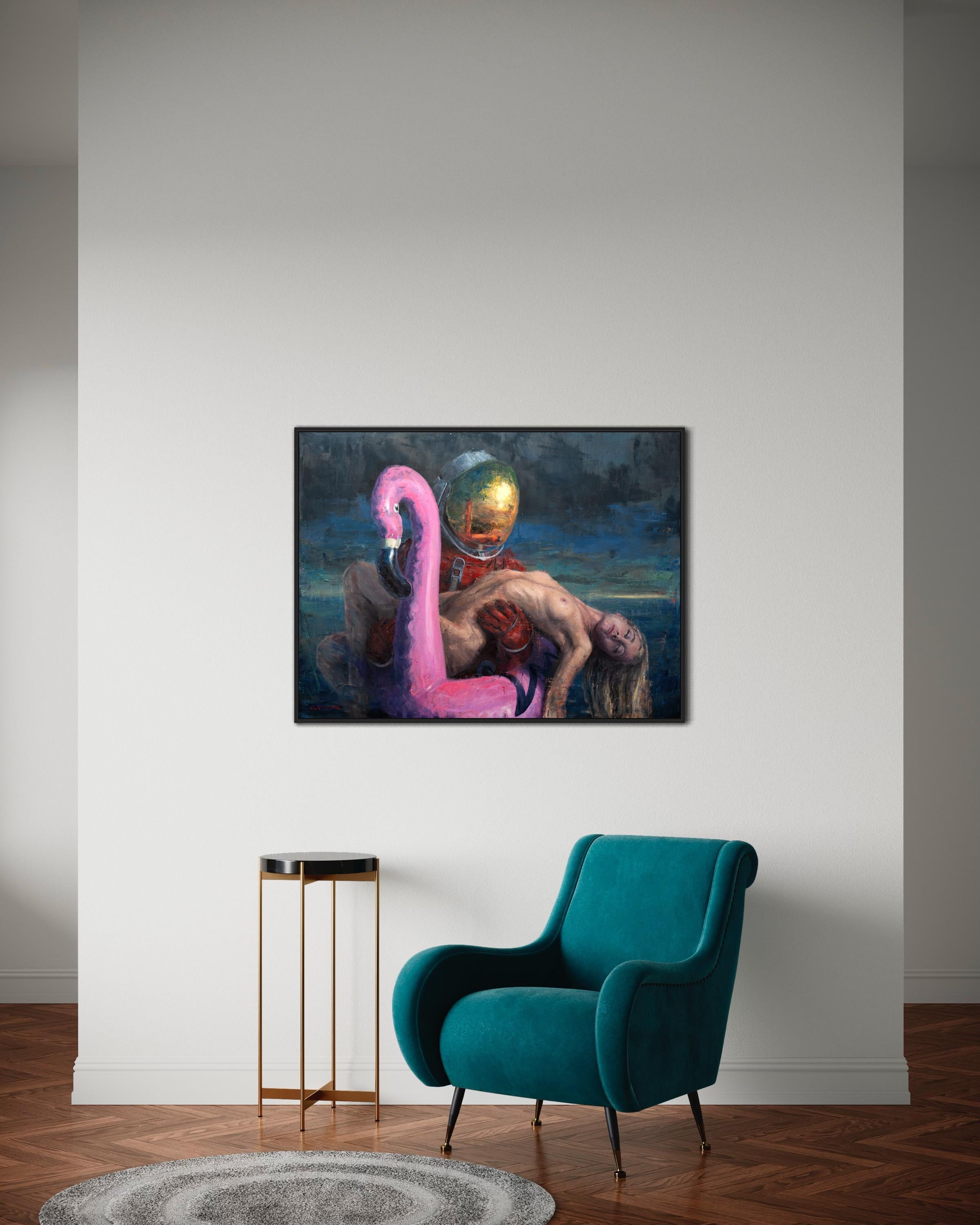 In "You Are Not Alone Anymore", Andreas Claussens Öl auf Leinwand aus dem Jahr 2023, mit den Maßen 35,43 x 47,24 x 1,18 cm, verbindet der Künstler meisterhaft Surrealismus mit Realismus und fordert die Wahrnehmung des Betrachters mit einer Szene unerwarteter Gesellschaft heraus. Eine nackte weibliche Figur, die mit einer sensiblen Darstellung der menschlichen Form dargestellt ist, liegt in der schützenden Umarmung eines Astronauten. Beide Figuren treiben auf einem aufblasbaren Flamingo, der einen Hauch von Skurrilität verleiht und im Kontrast zum ernsten Bestreben des Astronauten steht. Der Astronaut, in voller Montur und geheimnisvoll hinter einem reflektierenden Visier, suggeriert eine Geschichte der Rettung oder des Schutzes in einer unbestimmten Weite, die durch Claussens dramatisches Hell-Dunkel-Spiel zwischen den Motiven und dem dunklen, atmosphärischen Hintergrund noch unterstrichen wird.