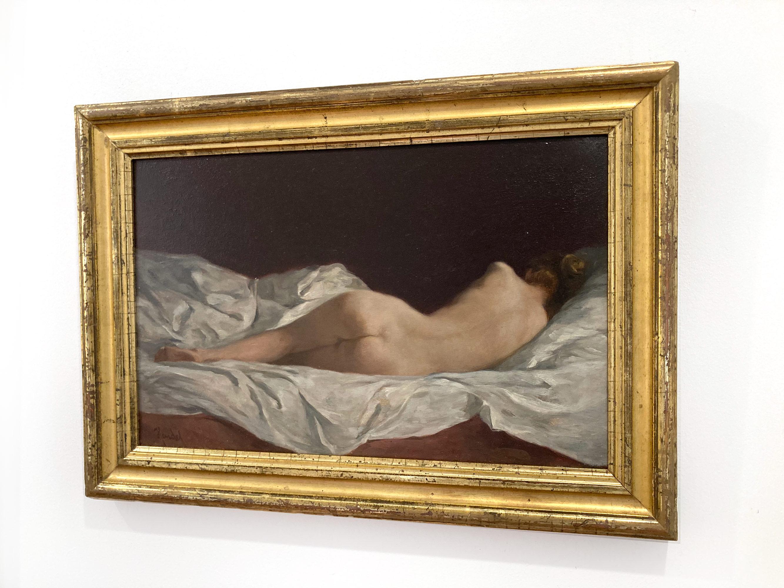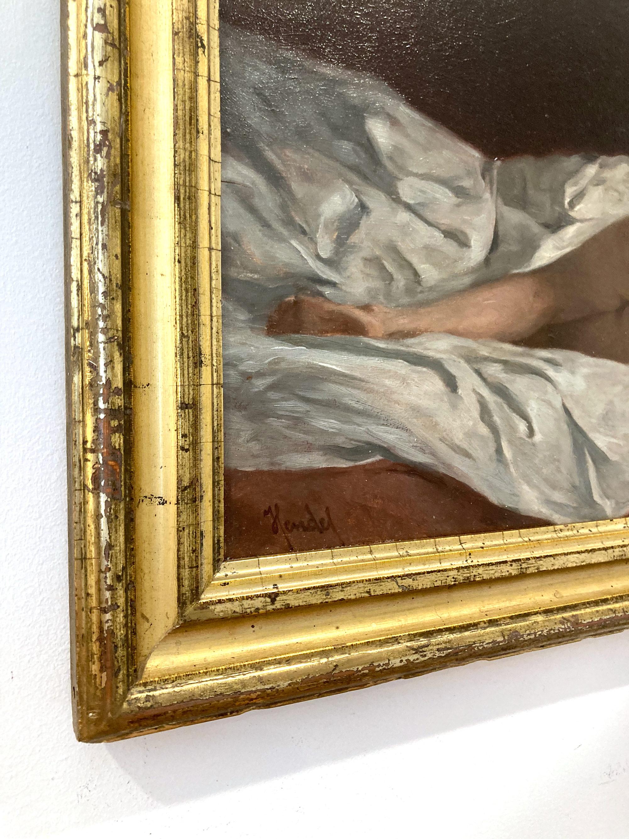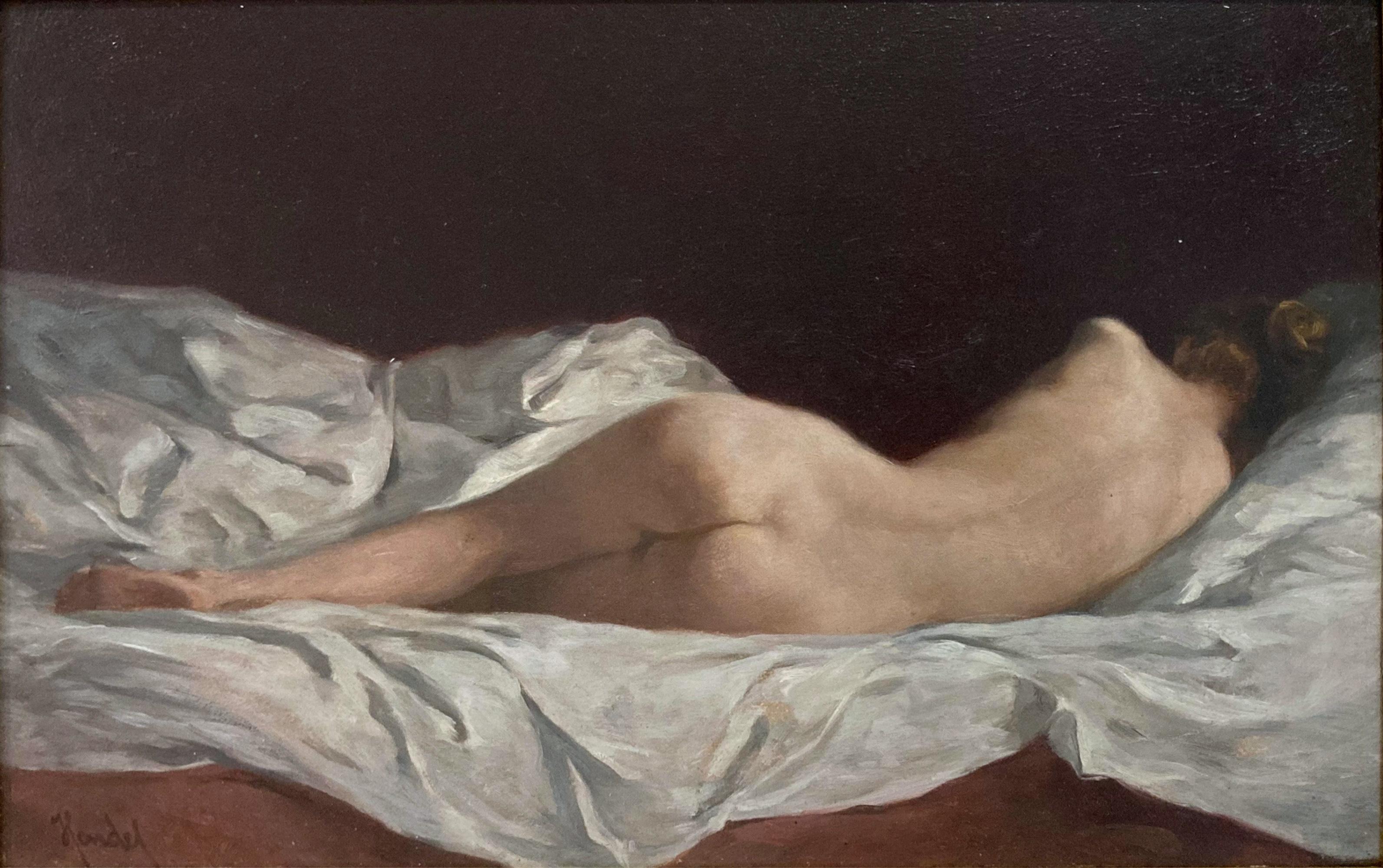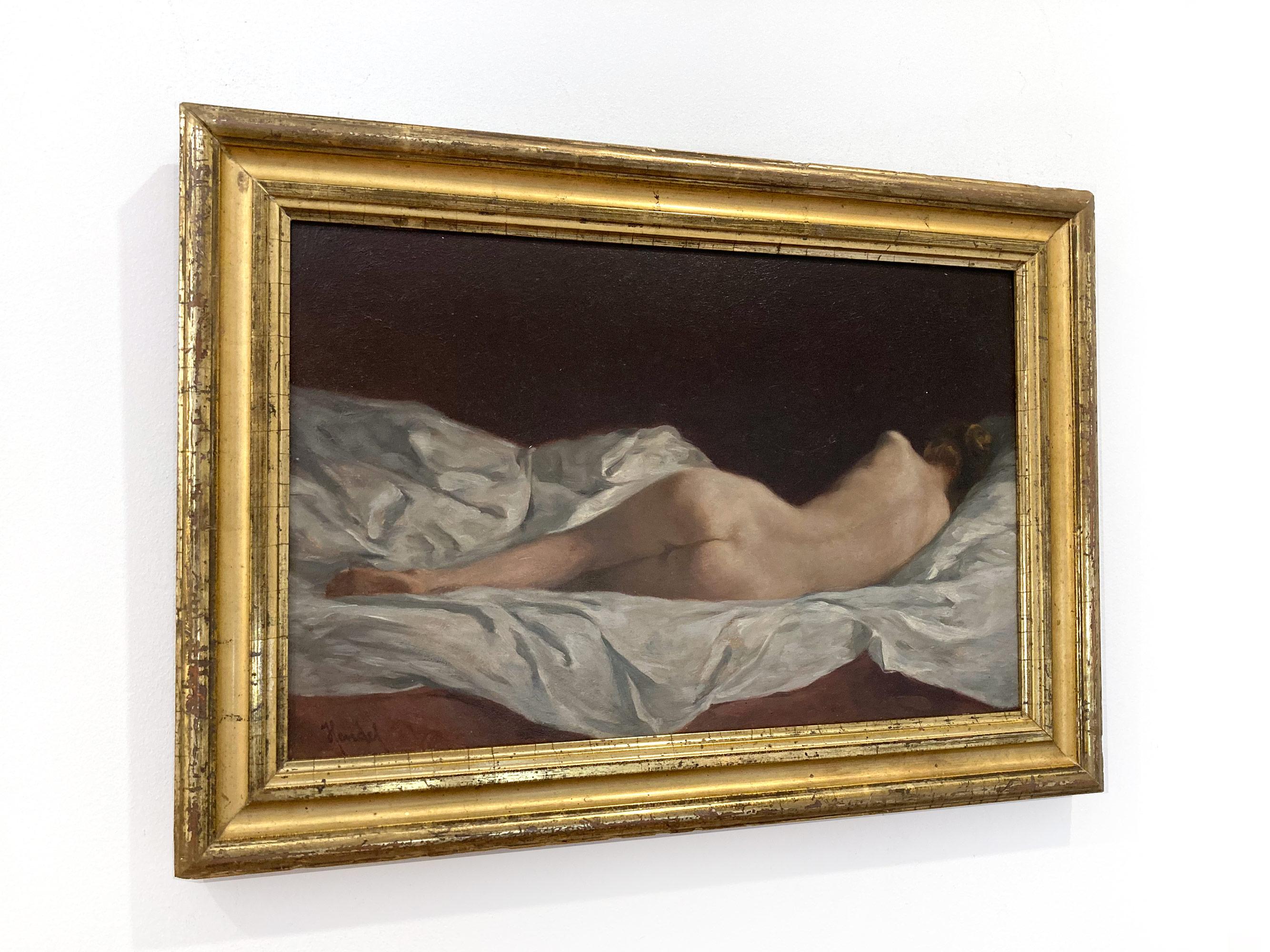 Ein außergewöhnliches Ölgemälde aus dem 19. Jahrhundert, das eine nackte, auf einem Bett liegende Figur mit weißem Vorhang vor einem dunklen Hintergrund zeigt. Diese intime figurative Szene stellt einen weiblichen Akt dar, der wirklich meisterhaft gemalt ist. Dem Künstler gelang es hervorragend, eine Atmosphäre und Emotionen zu schaffen, mit einer sanften Komposition, die sich auf den Rücken der Figur konzentriert. Die Hauttöne sind in weichen, naturalistischen Fleischtönen mit subtilen Glanzlichtern und Schatten wiedergegeben, die die Konturen ihres Rückens, ihrer Hüften und ihrer Beine betonen. Die Blätter sind mit Falten und Knicken strukturiert und in kühlen Grau- und Weißtönen gemalt, die einen scharfen Kontrast zu dem tiefen, fast schwarzen Hintergrund bilden und ein Gefühl von Intimität und Geheimnis vermitteln. Das Werk ist vom Künstler unten links mit "Hendel" signiert und befindet sich in einem antiken Rahmen aus Zitronengold mit sichtbaren Gebrauchsspuren und Patina sowie einem Aufhängungsdraht auf der Rückseite, bereit, ausgestellt zu werden.