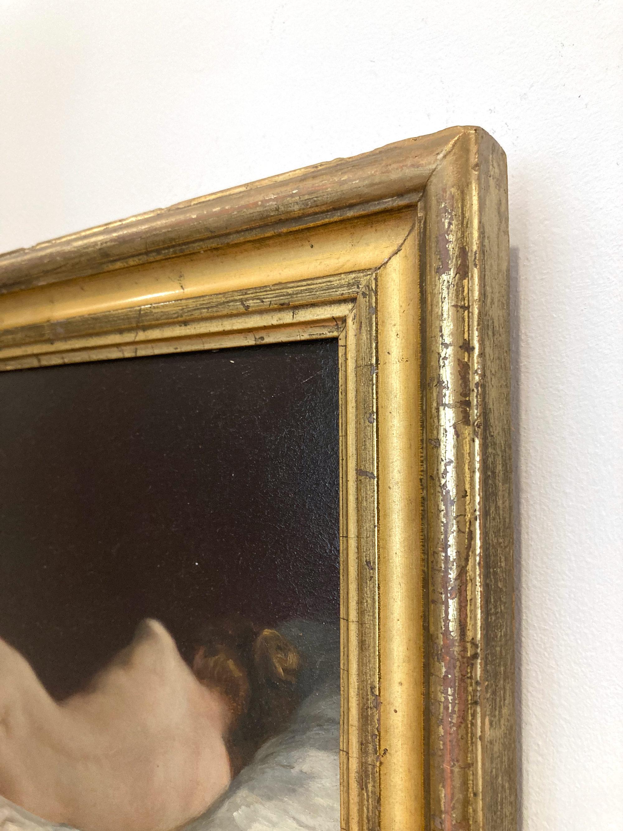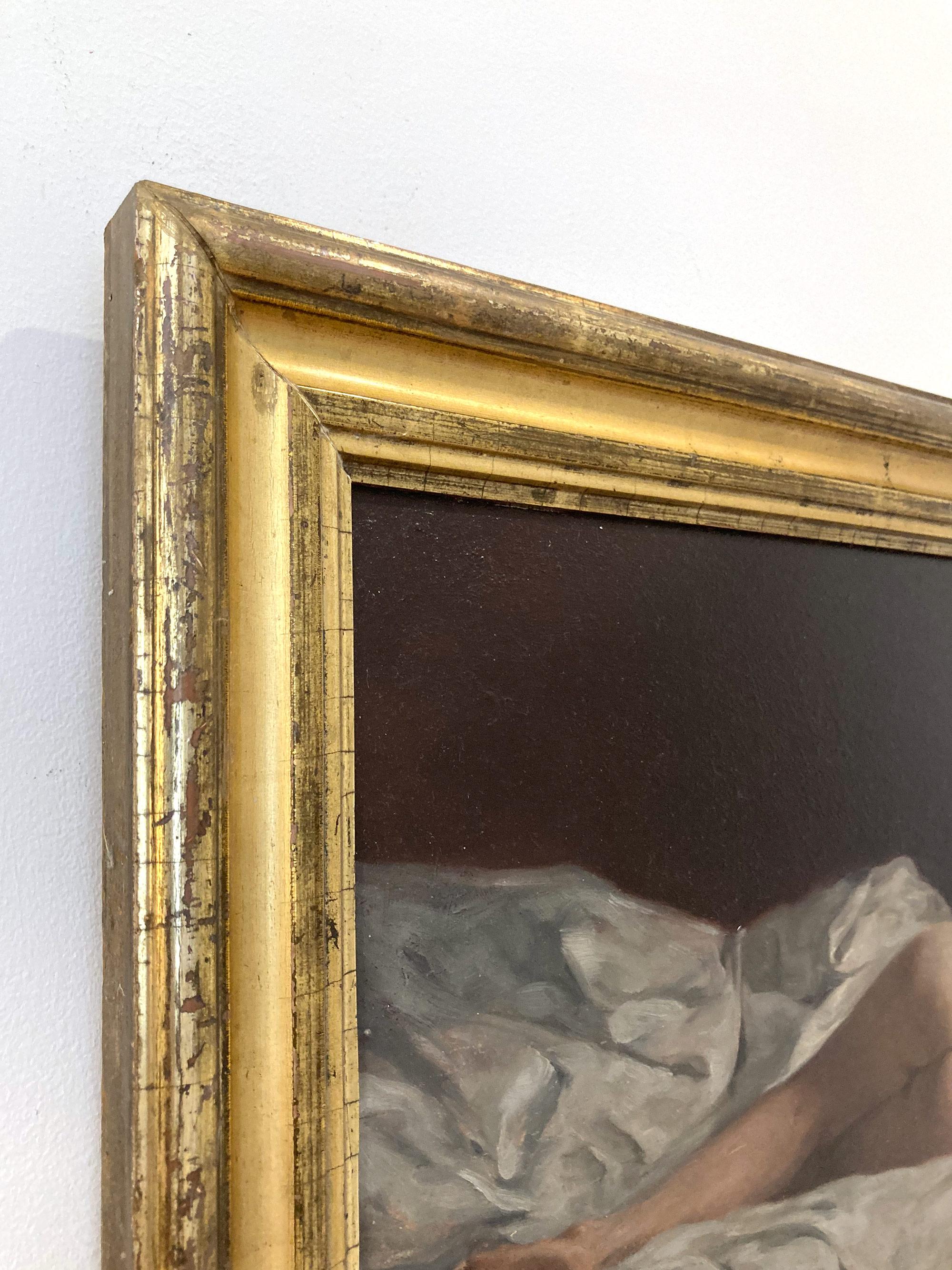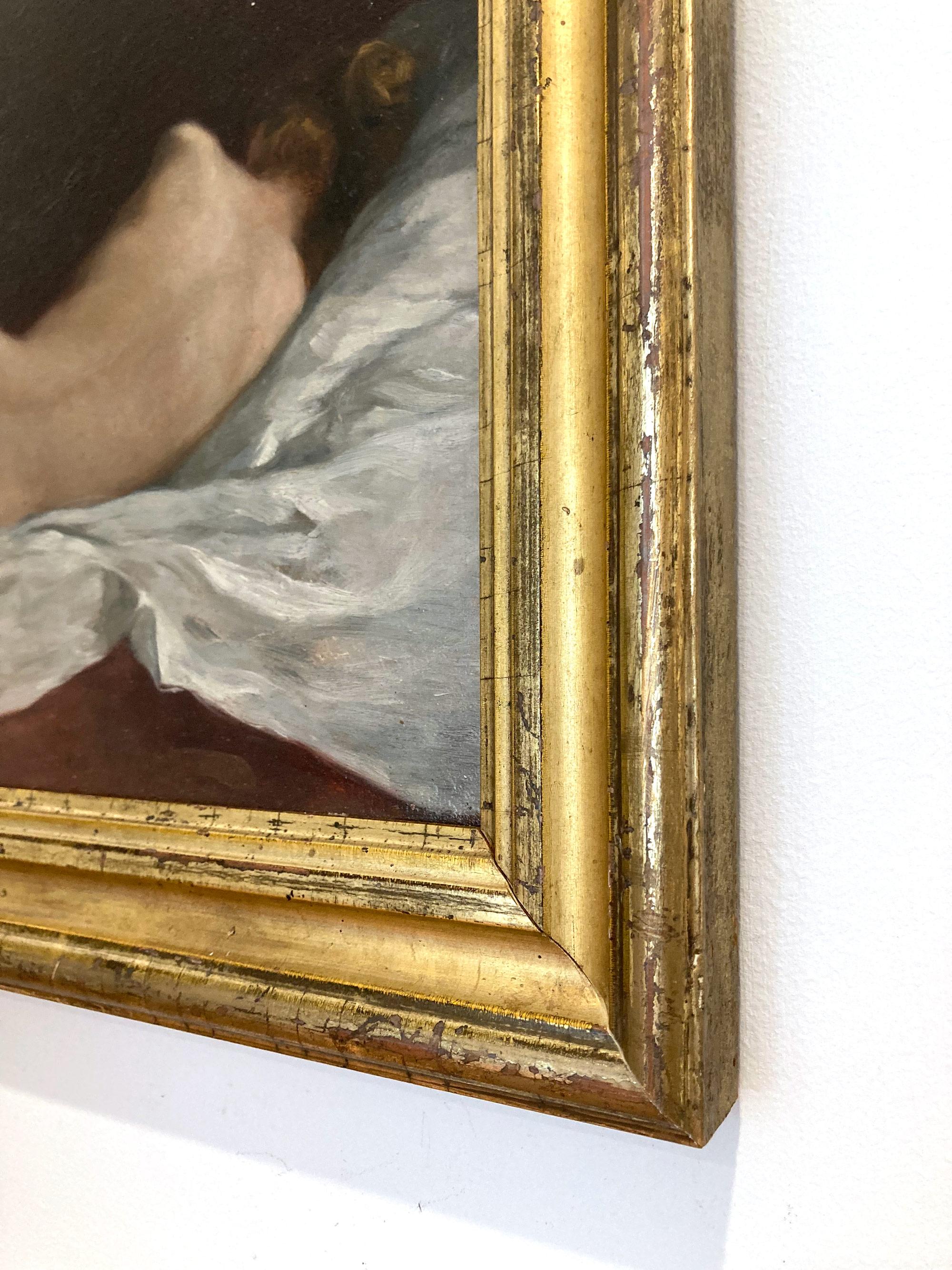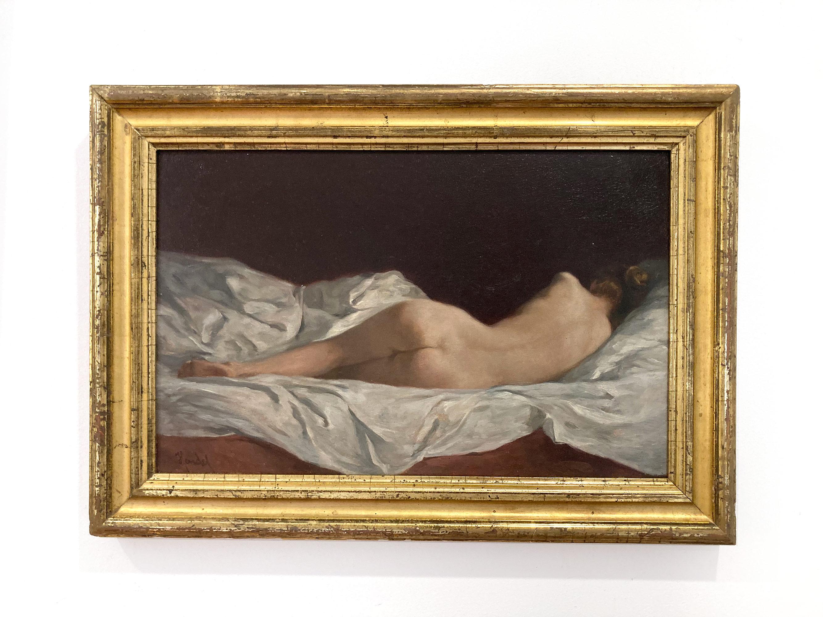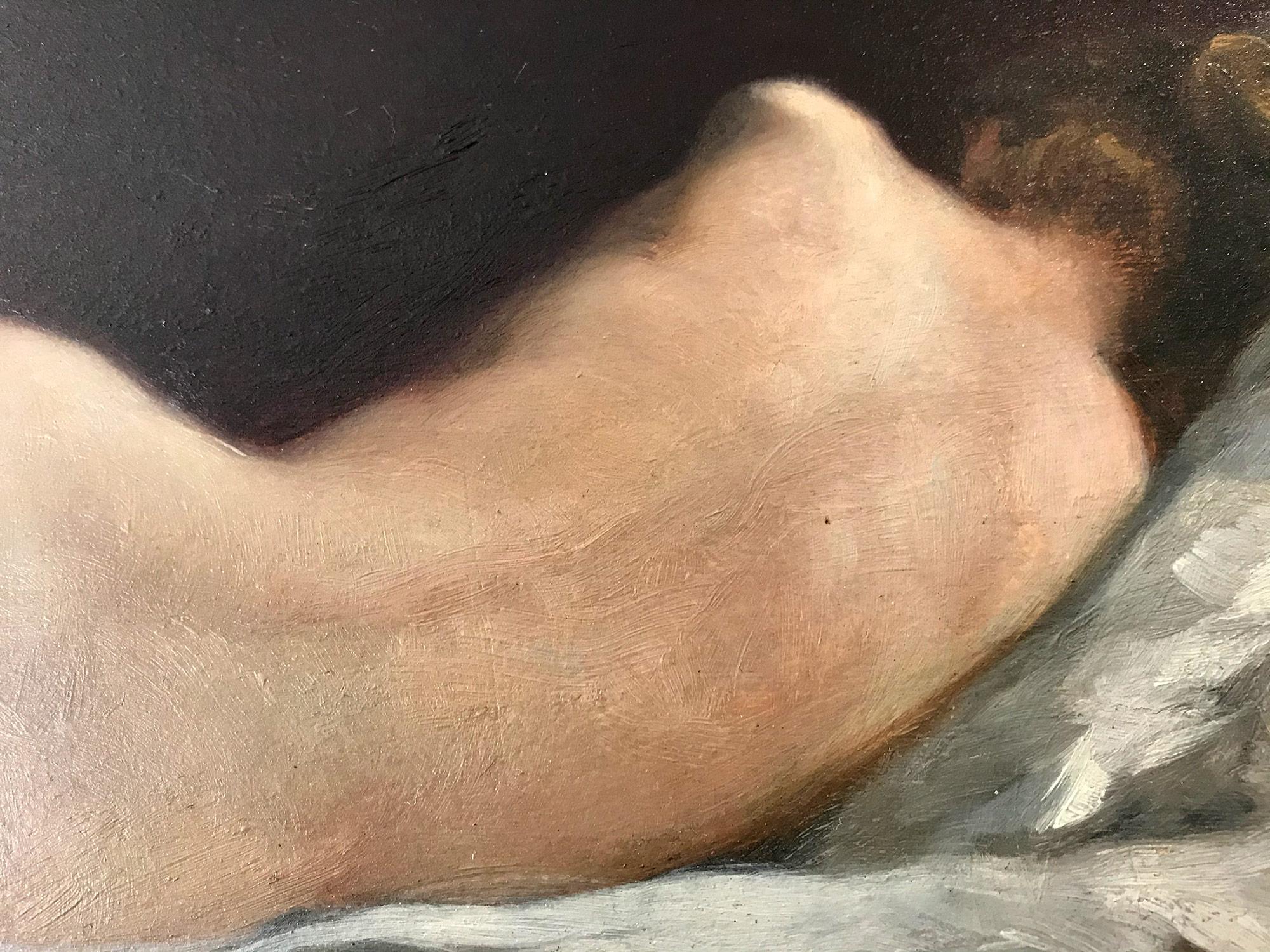Ein außergewöhnliches Ölgemälde aus dem 19. Jahrhundert, das eine nackte, auf einem Bett liegende Figur mit weißem Vorhang vor einem dunklen Hintergrund zeigt. Diese intime figurative Szene stellt einen weiblichen Akt dar, der wirklich meisterhaft gemalt ist. Dem Künstler gelang es hervorragend, eine Atmosphäre und Emotionen zu schaffen, mit einer sanften Komposition, die sich auf den Rücken der Figur konzentriert. Die Hauttöne sind in weichen, naturalistischen Fleischtönen mit subtilen Glanzlichtern und Schatten wiedergegeben, die die Konturen ihres Rückens, ihrer Hüften und ihrer Beine betonen. Die Blätter sind mit Falten und Knicken strukturiert und in kühlen Grau- und Weißtönen gemalt, die einen scharfen Kontrast zu dem tiefen, fast schwarzen Hintergrund bilden und ein Gefühl von Intimität und Geheimnis vermitteln. Das Werk ist vom Künstler unten links mit "Hendel" signiert und befindet sich in einem antiken Rahmen aus Zitronengold mit sichtbaren Gebrauchsspuren und Patina sowie einem Aufhängungsdraht auf der Rückseite, bereit, ausgestellt zu werden.