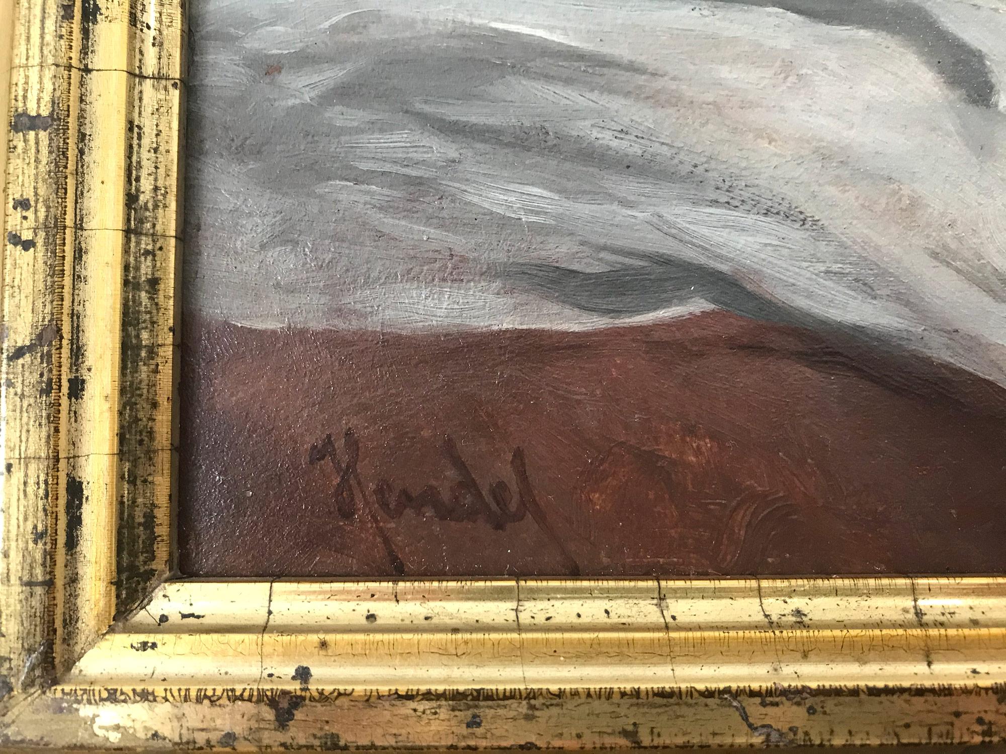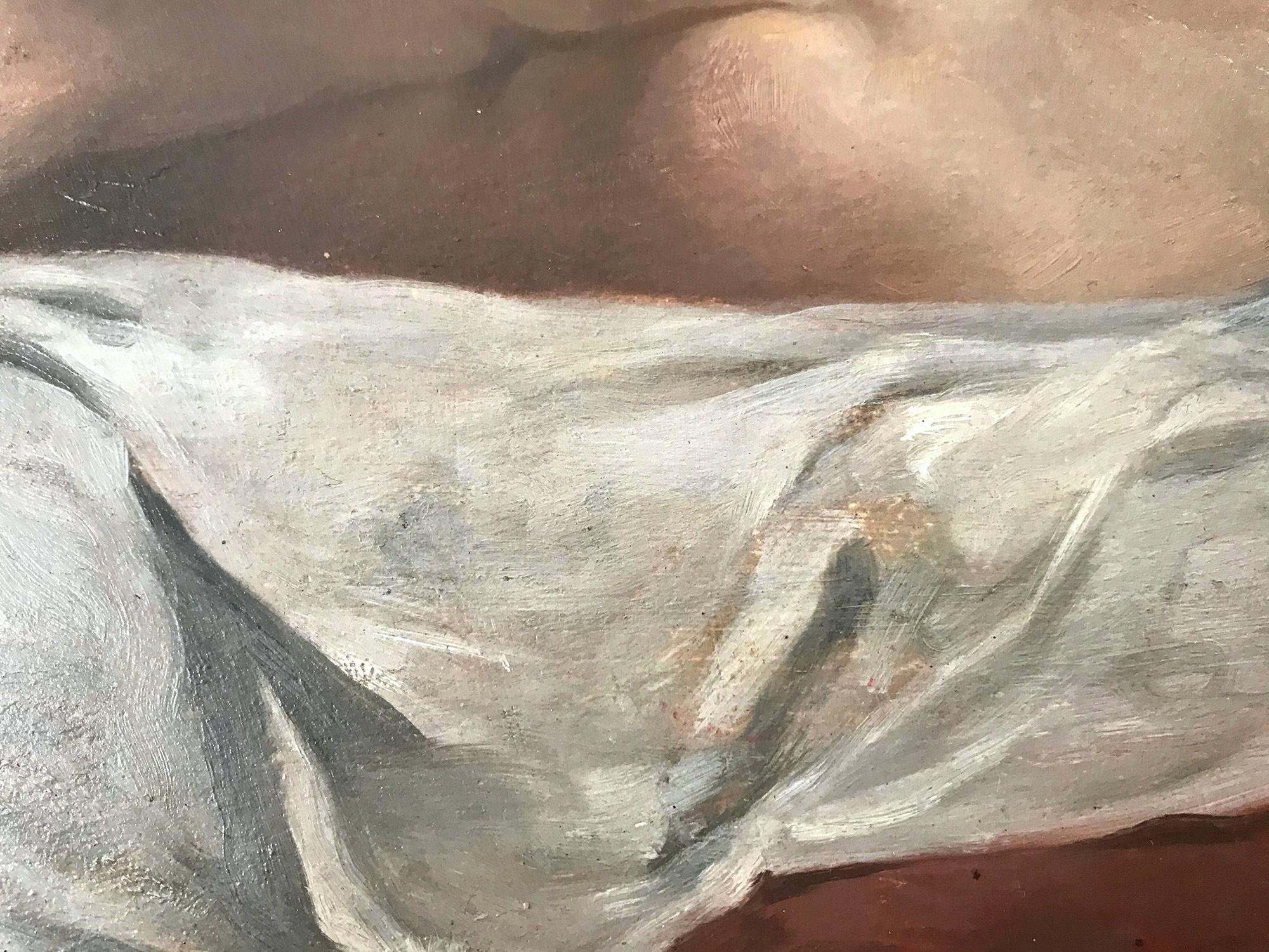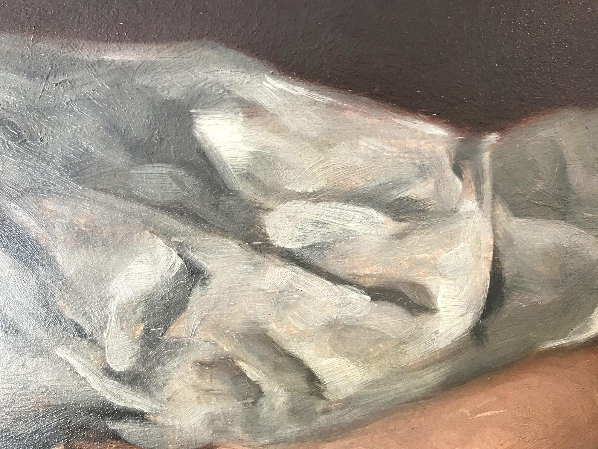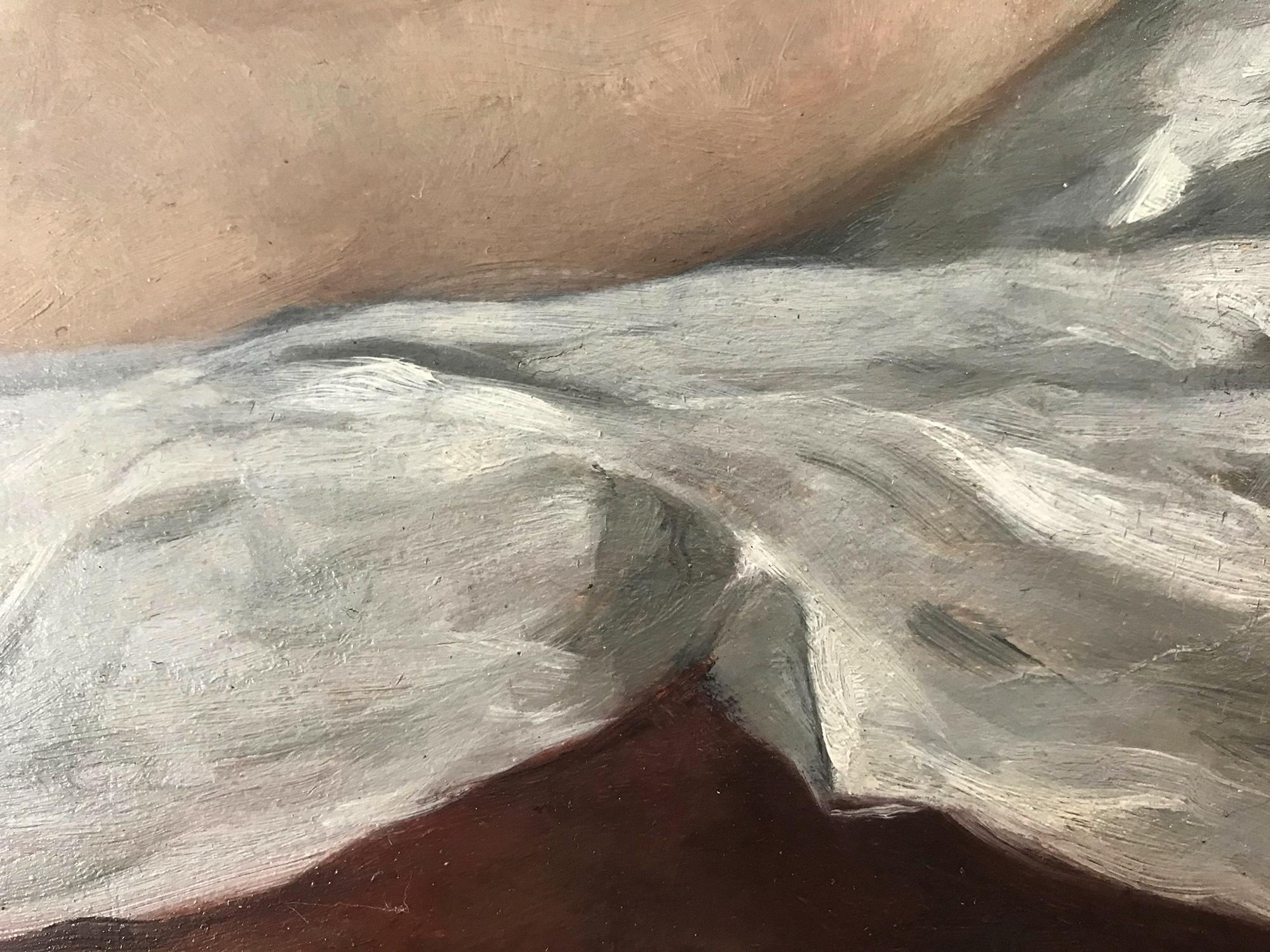 Ein außergewöhnliches Ölgemälde aus dem 19. Jahrhundert, das eine nackte, auf einem Bett liegende Figur mit weißem Vorhang vor einem dunklen Hintergrund zeigt. Diese intime figurative Szene stellt einen weiblichen Akt dar, der wirklich meisterhaft gemalt ist. Dem Künstler gelang es hervorragend, eine Atmosphäre und Emotionen zu schaffen, mit einer sanften Komposition, die sich auf den Rücken der Figur konzentriert. Die Hauttöne sind in weichen, naturalistischen Fleischtönen mit subtilen Glanzlichtern und Schatten wiedergegeben, die die Konturen ihres Rückens, ihrer Hüften und ihrer Beine betonen. Die Blätter sind mit Falten und Knicken strukturiert und in kühlen Grau- und Weißtönen gemalt, die einen scharfen Kontrast zu dem tiefen, fast schwarzen Hintergrund bilden und ein Gefühl von Intimität und Geheimnis vermitteln. Das Werk ist vom Künstler unten links mit "Hendel" signiert und befindet sich in einem antiken Rahmen aus Zitronengold mit sichtbaren Gebrauchsspuren und Patina sowie einem Aufhängungsdraht auf der Rückseite, bereit, ausgestellt zu werden.