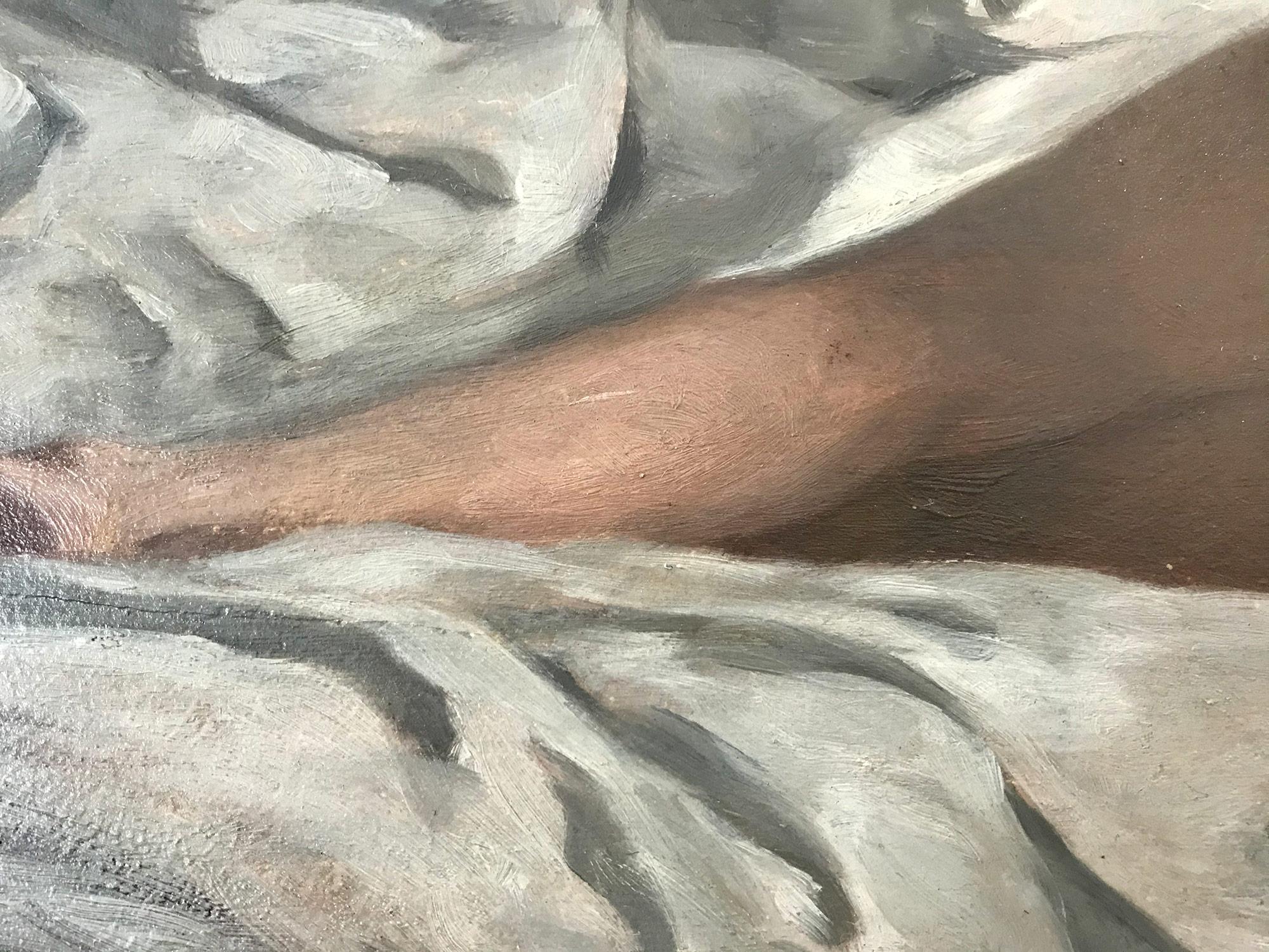 Weißer weiblicher Akt aus weißem Leinen, gerahmt auf Bett, gerahmtes Ölgemälde, Cardiff Wales, Künstlerin