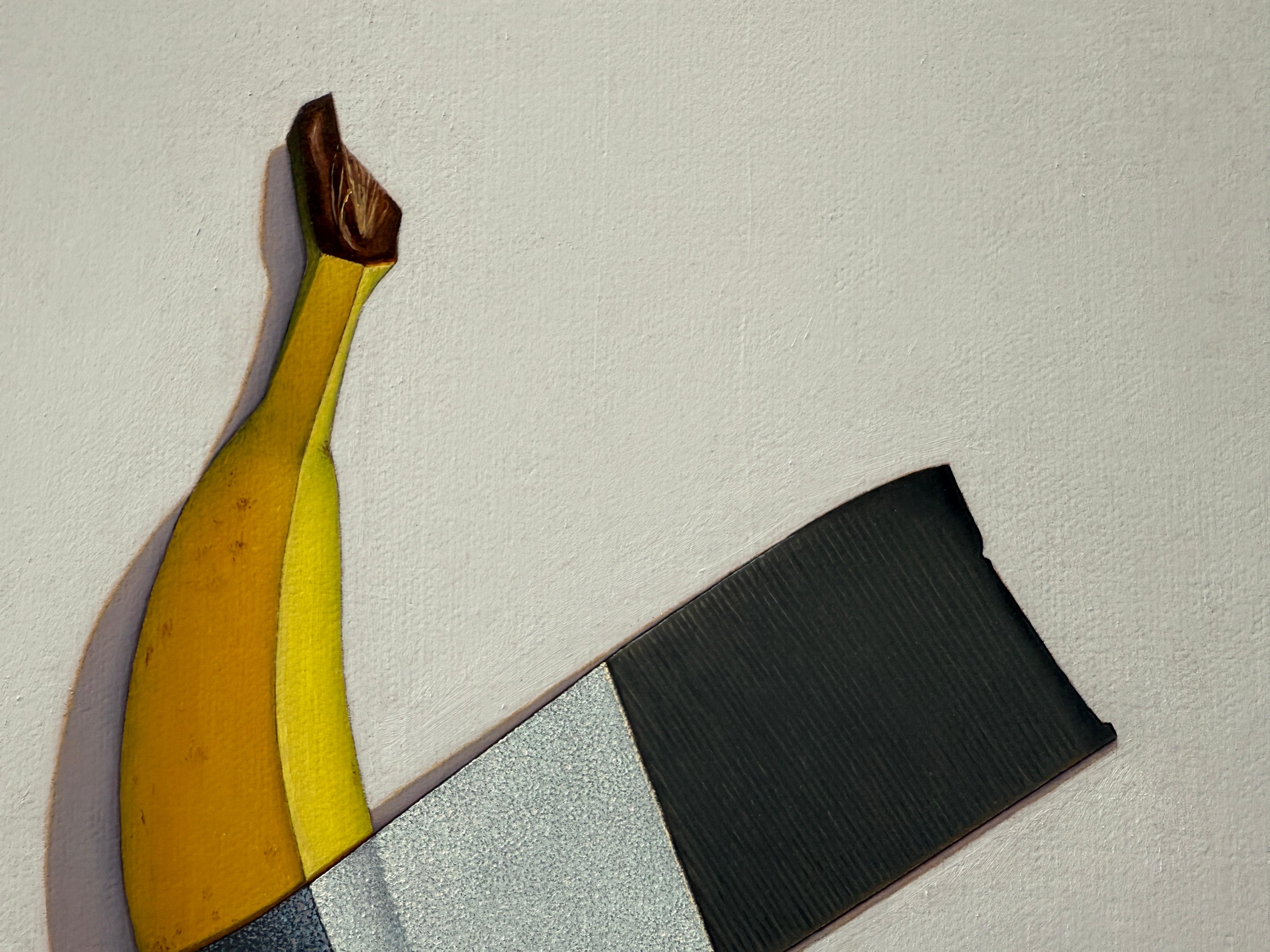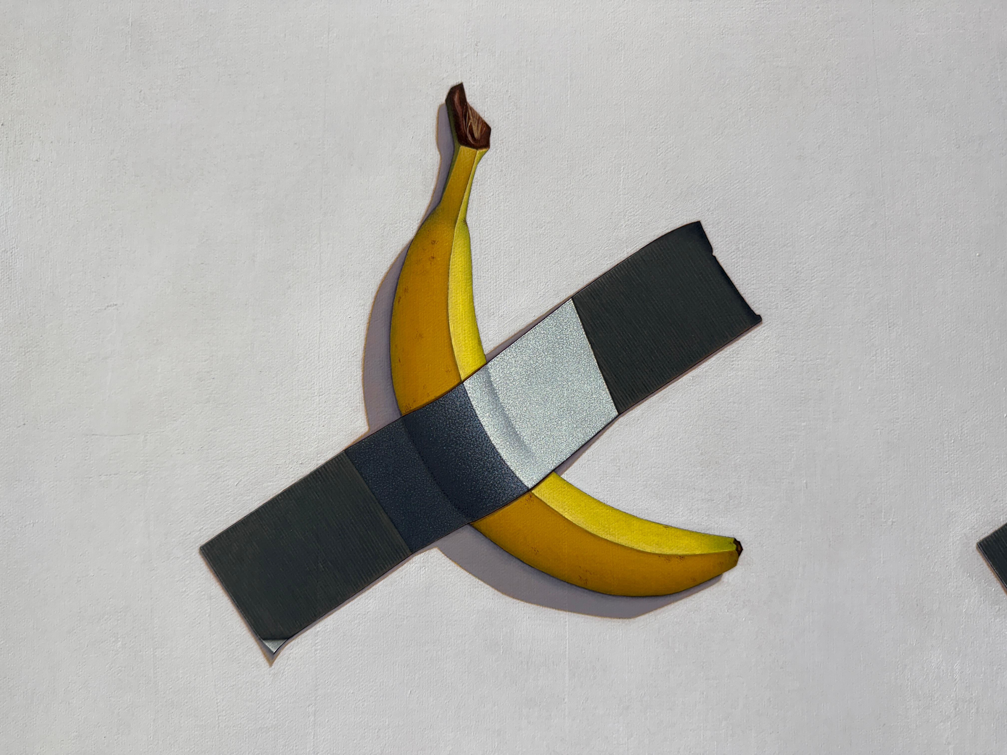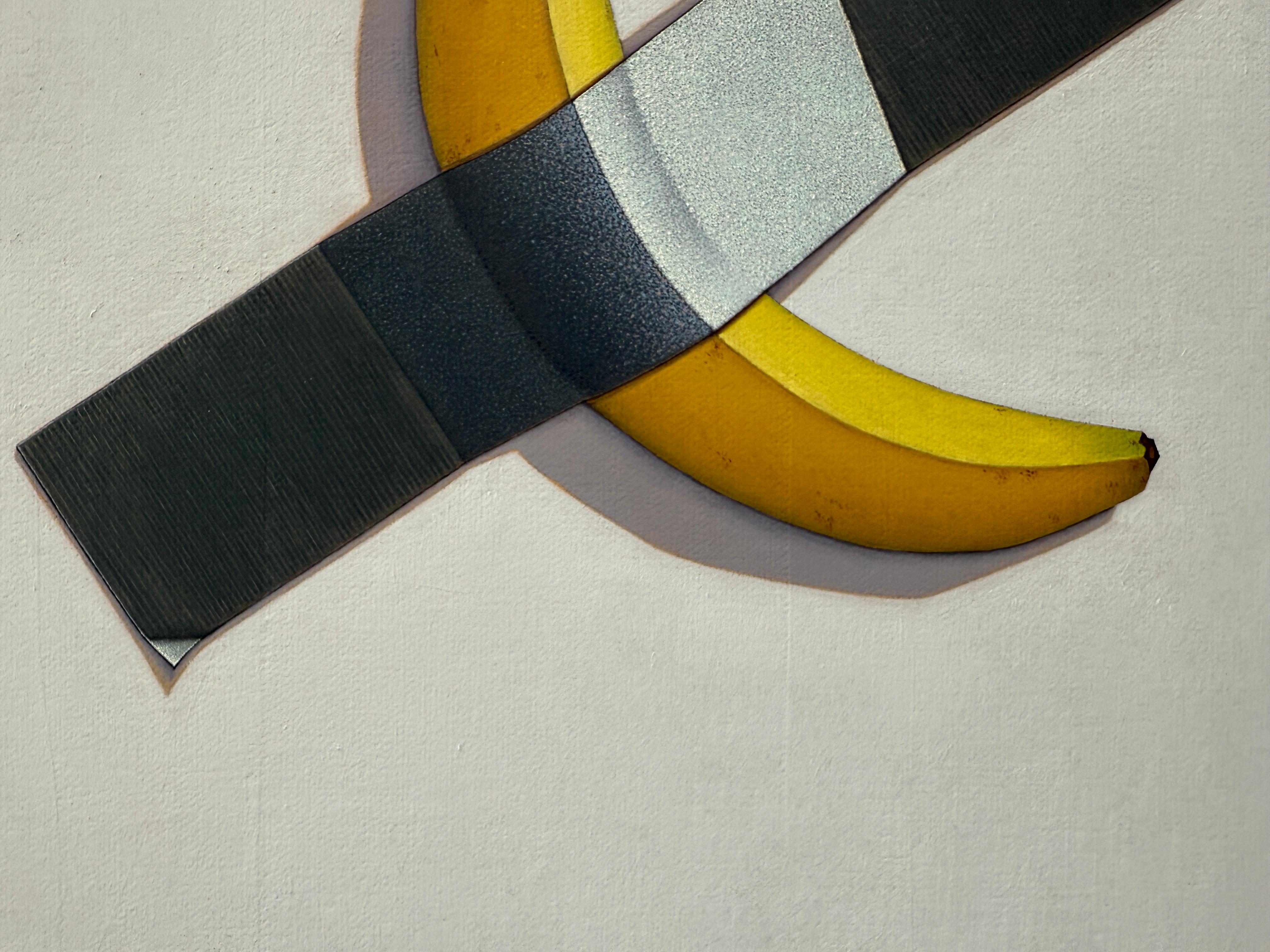"Monoculture" ist ein Ölgemälde des zeitgenössischen amerikanischen Künstlers Anthony Mastromatteo, das sich über die berüchtigte, mit Klebeband an die Wand geklebte Banane "Comedian" von Maurizio Cattelan lustig macht, die 2024 bei der Auktion von Sothebys's für 6,2 Millionen Dollar versteigert wurde und die ganze Welt in einen kollektiven Rausch versetzte.