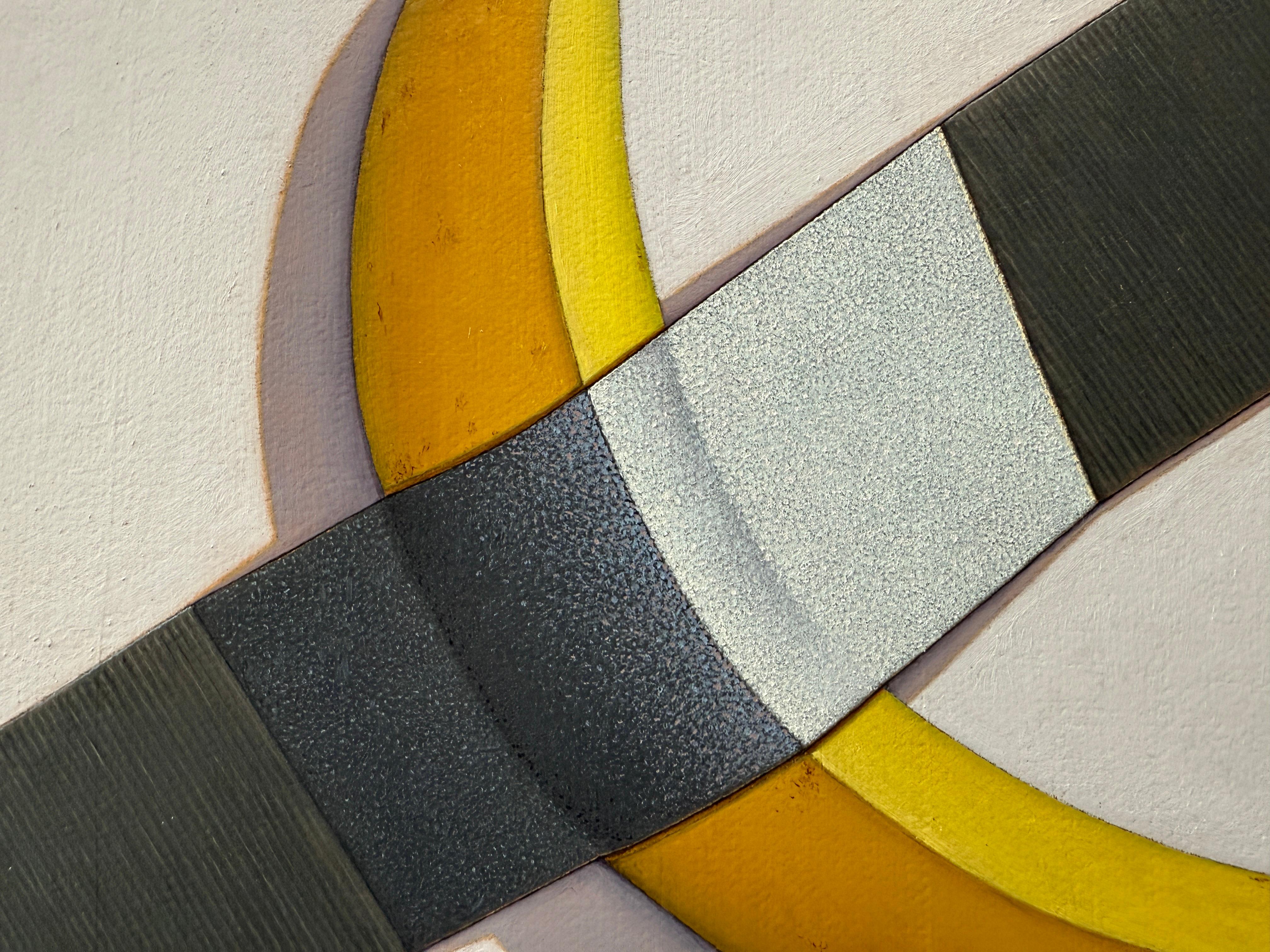 "Wonder...Woman" ist ein Ölgemälde auf Leinen, das wie ein Band aussieht, das eine Struktur im Stil der griechischen klassischen Architektur bildet. Diese Struktur könnte auf ein Ger...