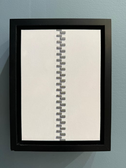 Ein Ölgemälde, das wie ein geschlossener Reißverschluss aussieht - die Metallzähne greifen von oben nach unten ineinander und halbieren den weißen Hintergrund.