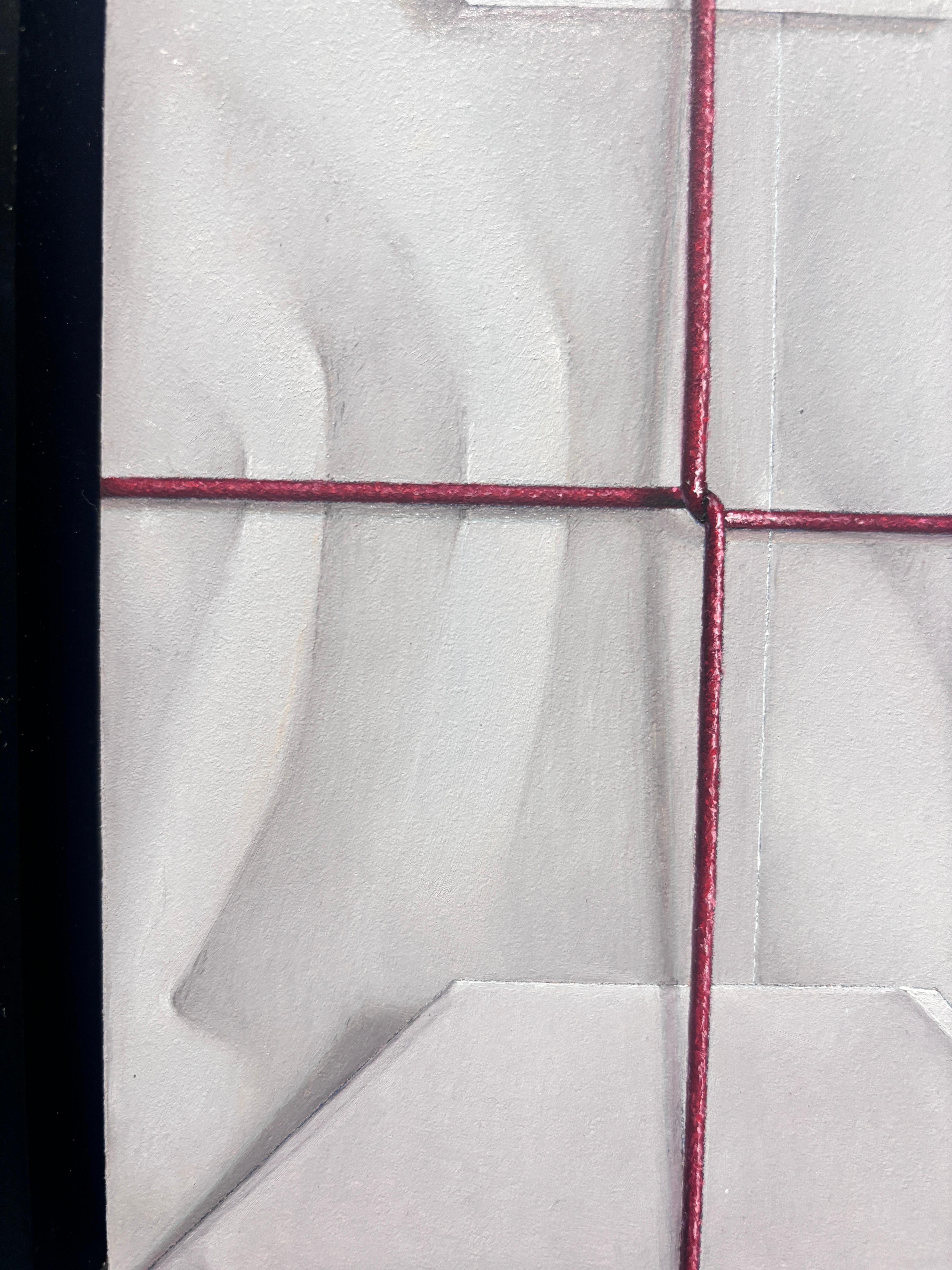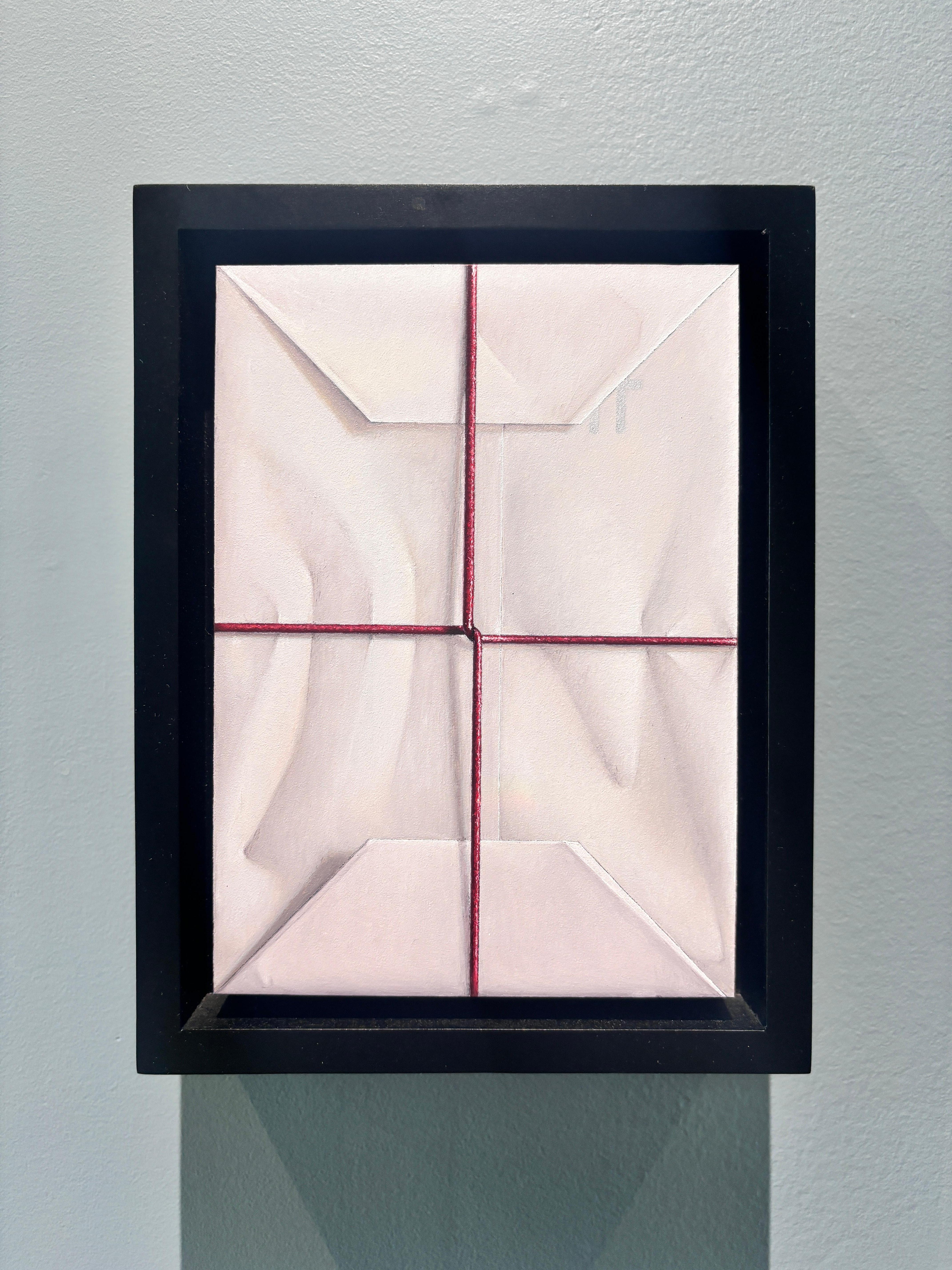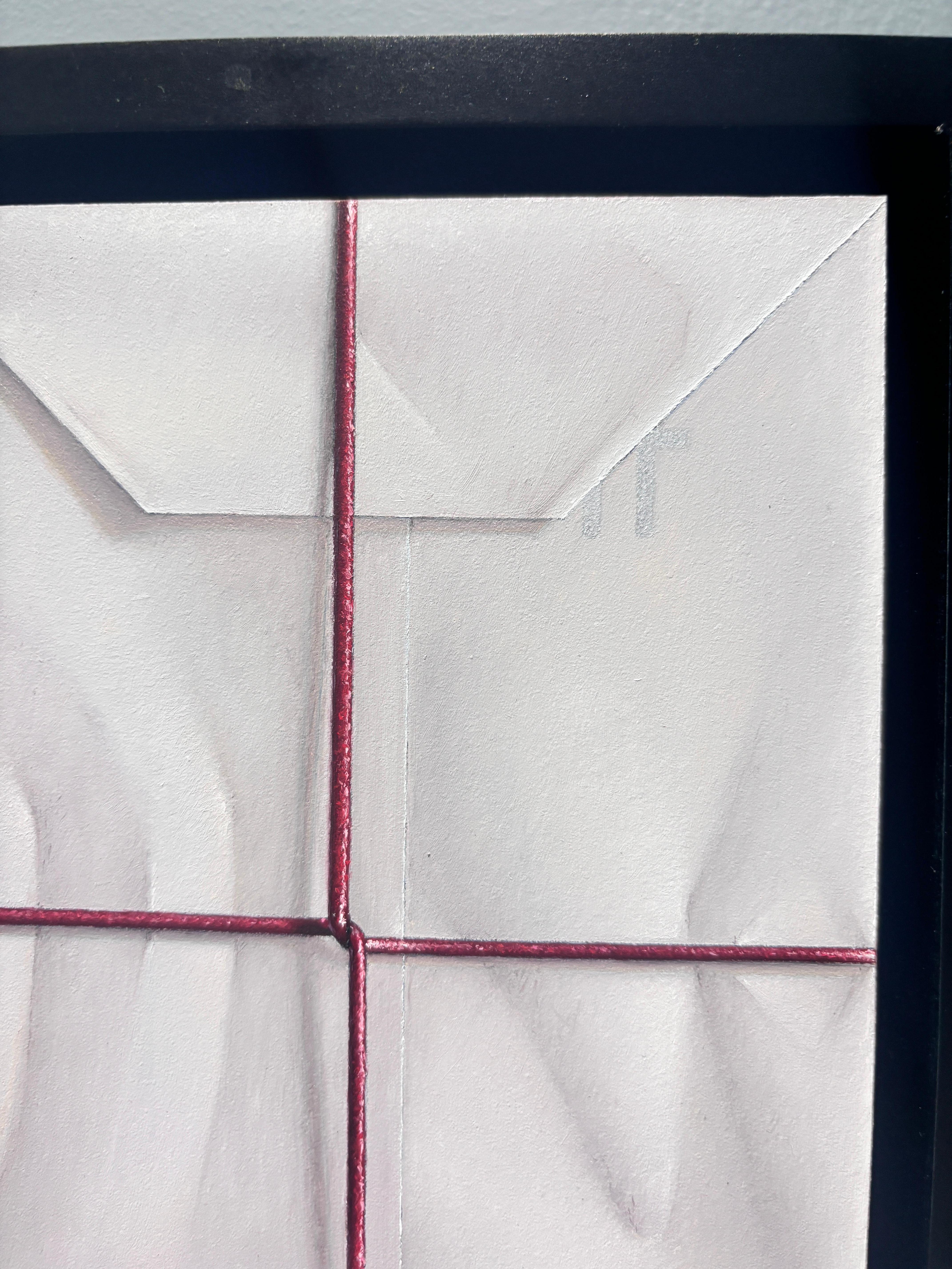 Ein Ölgemälde von Anthony Mastromatteo. Eine hyperreale Darstellung eines eingepackten Pakets, weißes Papier, das zu Geschenkpapier gefaltet und mit einer dünnen roten Schnur um einen besonderen Gegenstand, wahrscheinlich ein Geschenk, gebunden ist. Die Schnur strafft sich in der Mitte und zieht am Papier, wodurch Falten entstehen, die sich fühlbar anfühlen.