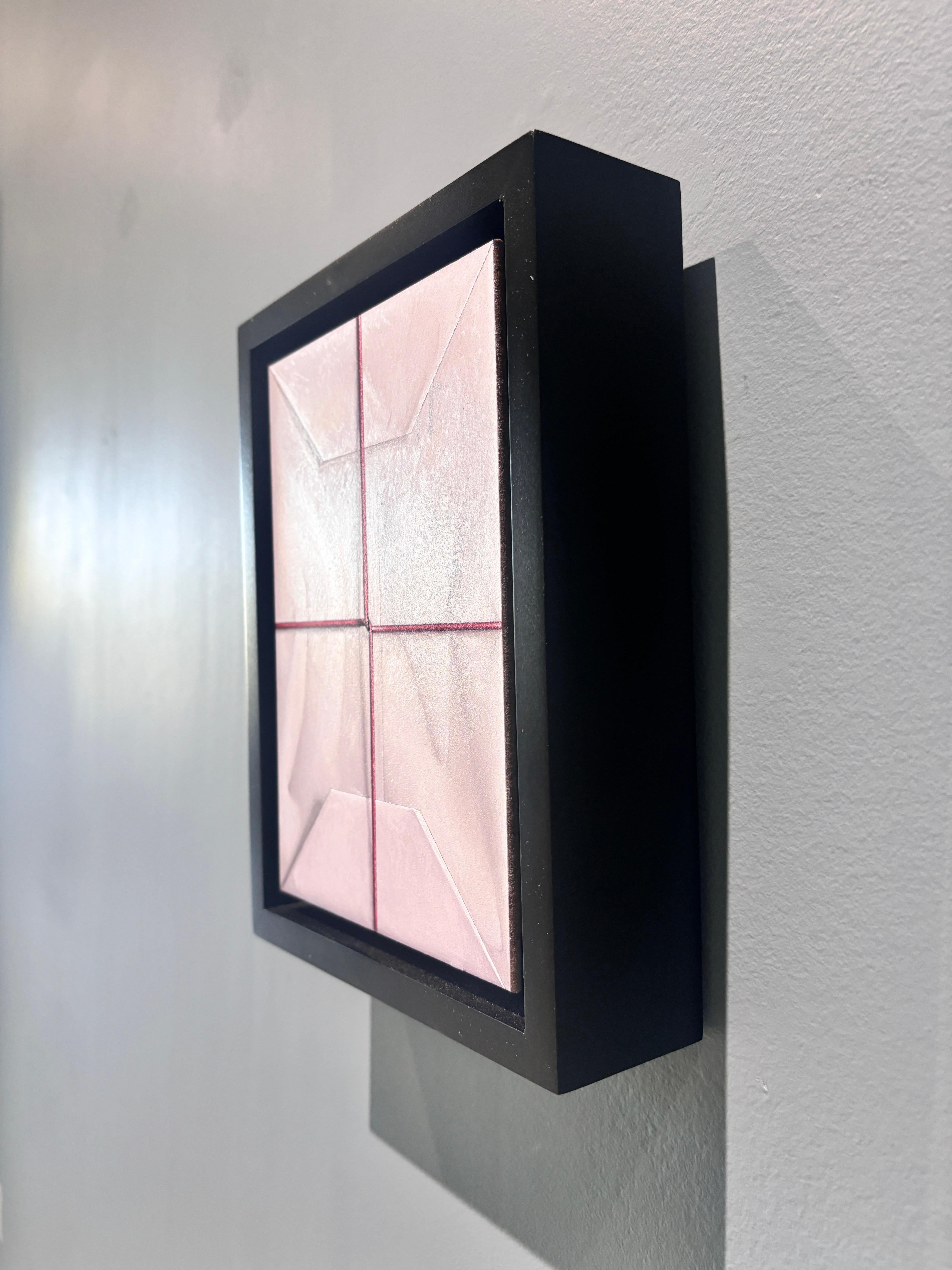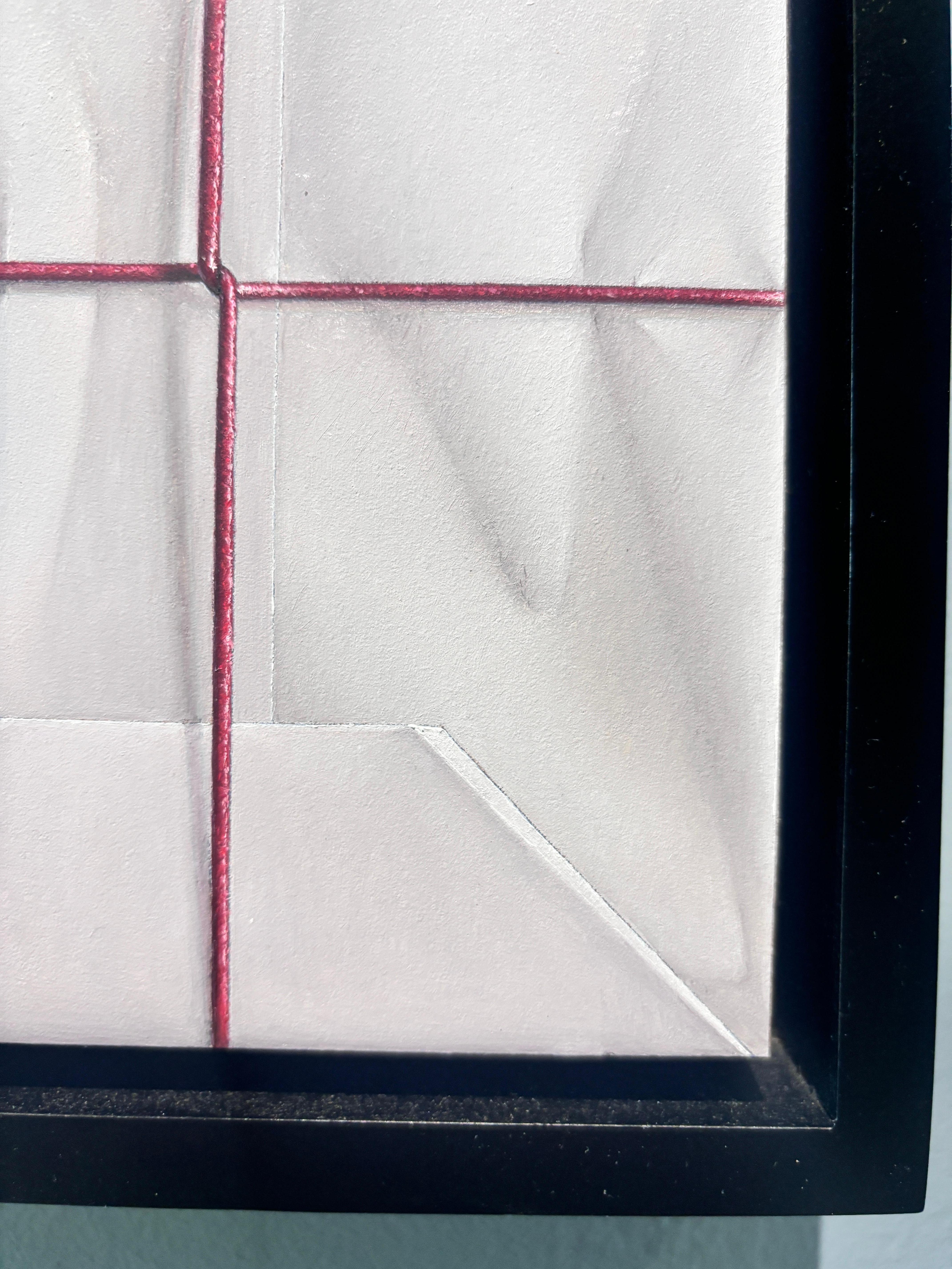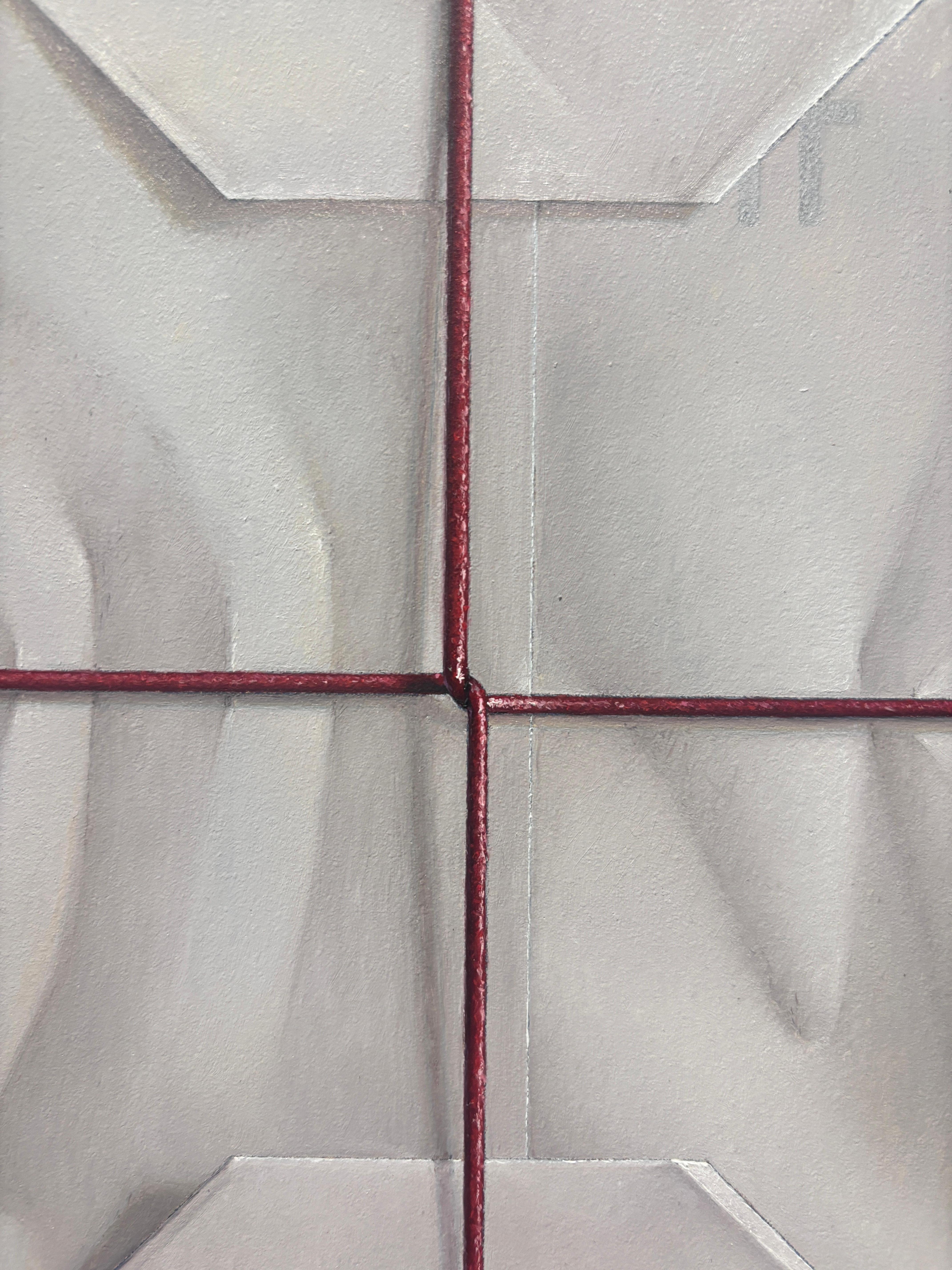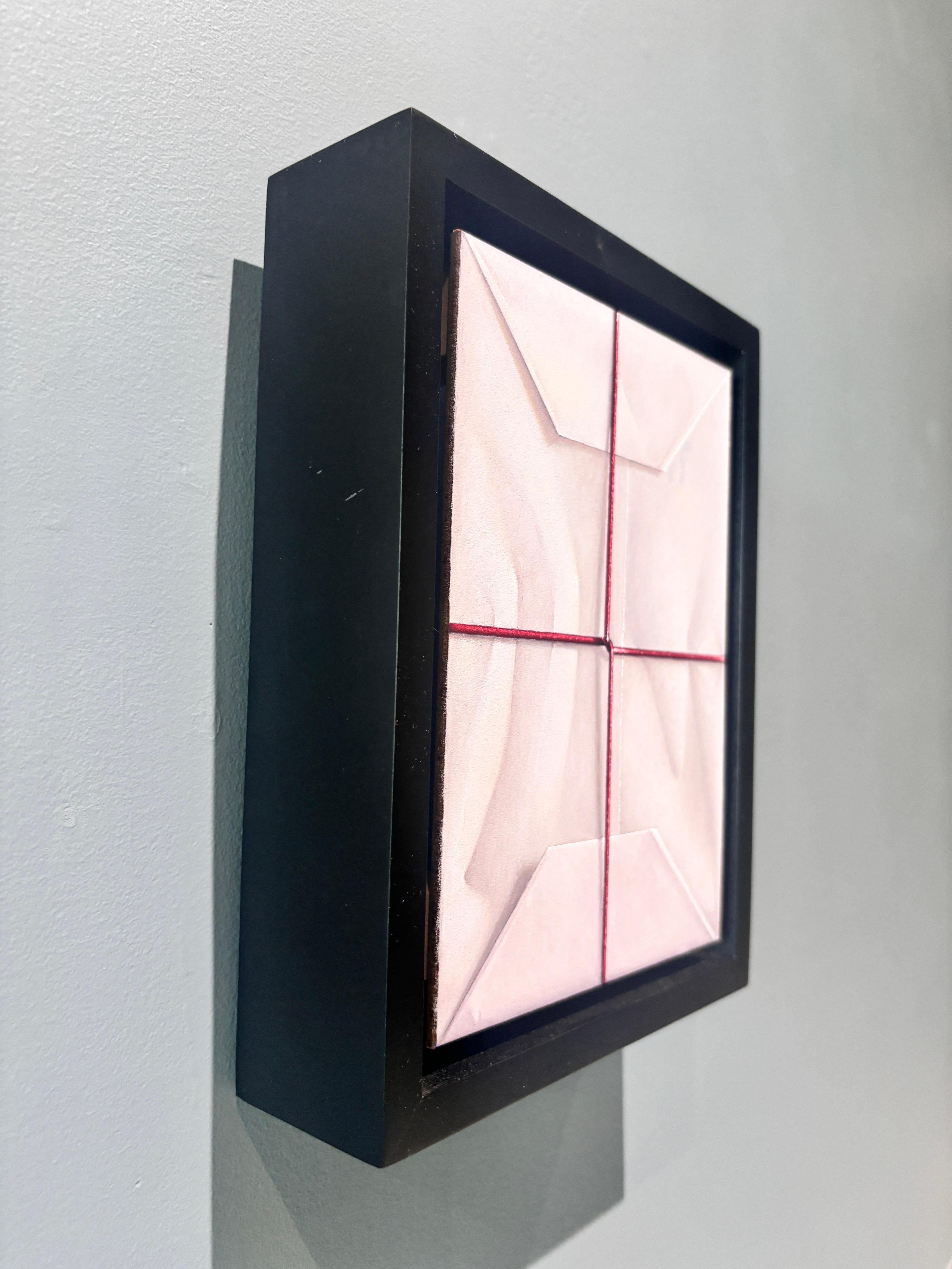 Ein Ölgemälde von Anthony Mastromatteo. Eine hyperreale Darstellung eines eingepackten Pakets, weißes Papier, das zu Geschenkpapier gefaltet und mit einer dünnen roten Schnur um einen besonderen Gegenstand, wahrscheinlich ein Geschenk, gebunden ist. Die Schnur strafft sich in der Mitte und zieht am Papier, wodurch Falten entstehen, die sich fühlbar anfühlen.