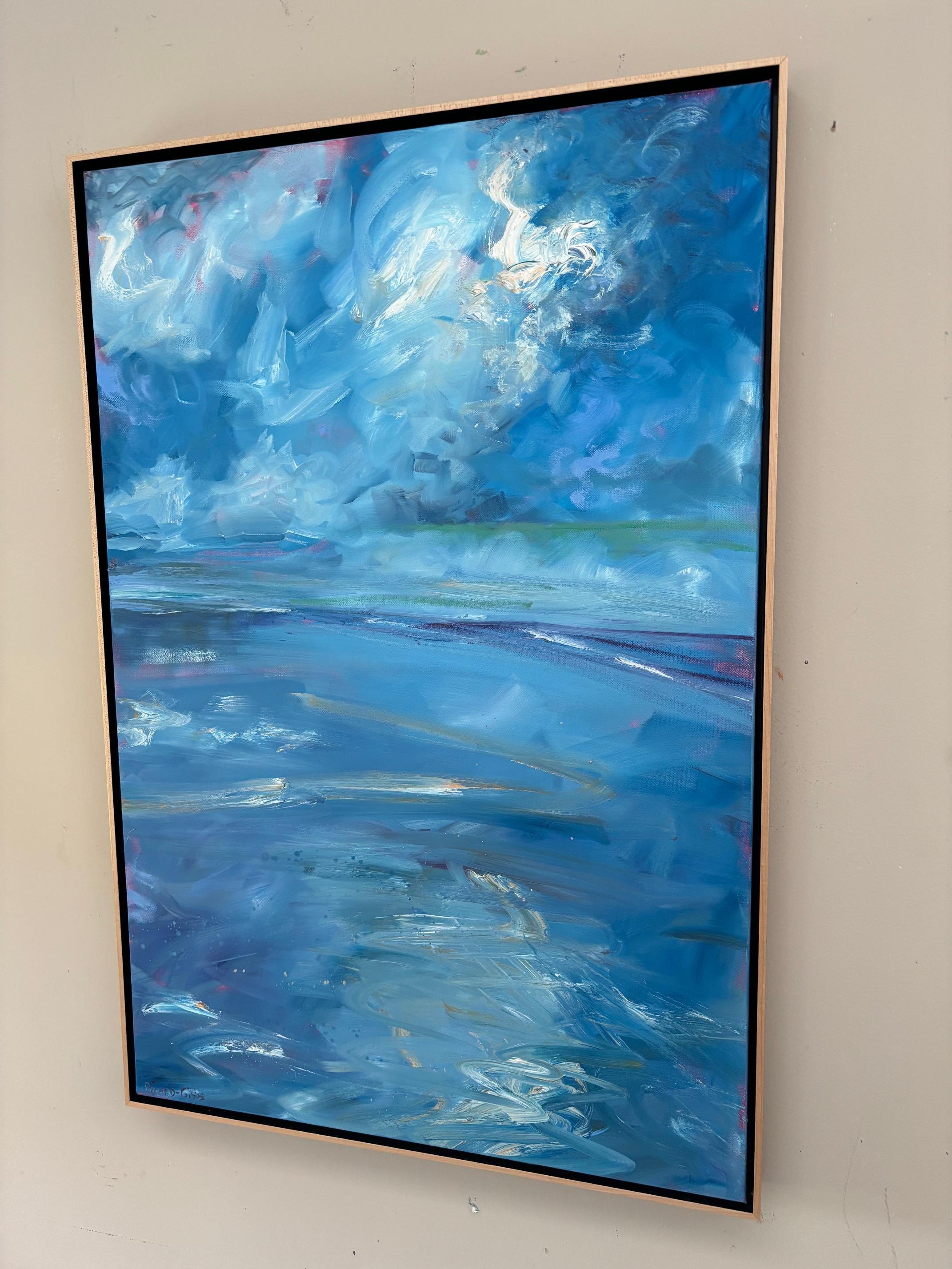 "Mirrored Cloud" von Catherine Picard-Gibbs ist ein dynamisches, 36 x 24 x 1,5 Zoll großes Seestück, gemalt in Öl auf Leinwand im Galerieformat. Eine lebhafte blaue und grüne Palette unterstreicht die Energie der sich bewegenden Wolken, die sich im nassen Sand eines geheimnisvollen Strandes spiegeln. Dieses zeitgenössische Werk wird in einem 25 x 37 x 2 Zoll großen, schwimmenden Ahornrahmen mit schwarzer Innenseite präsentiert und ist verdrahtet und aufhängefertig.