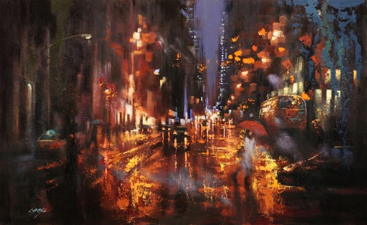 "Night in the City" ist ein 48x48 Acrylgemälde auf Leinwand des Künstlers Richell Castellon. Gezeigt wird eine regnerische Nacht in New York City. Fußgänger schlendern unter Regensch...