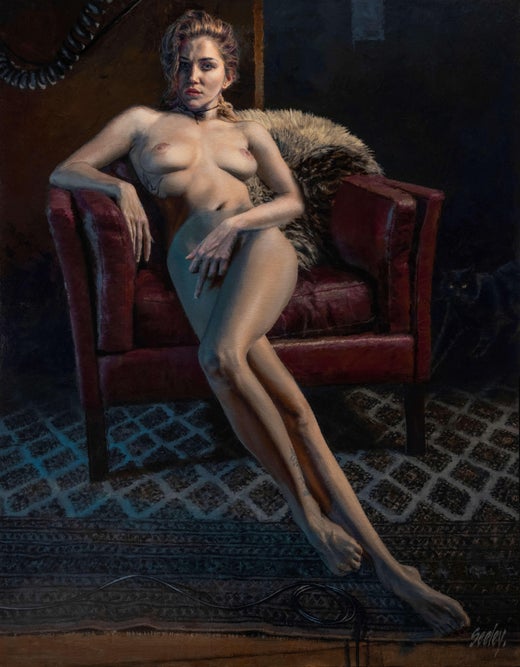 Dave Seeleys (USA) "Erica #1" ist ein handgefertigtes Original-Ölgemälde, das ein liegendes, nacktes Modell auf einer schwarzen Couch mit weißem Laken zeigt.