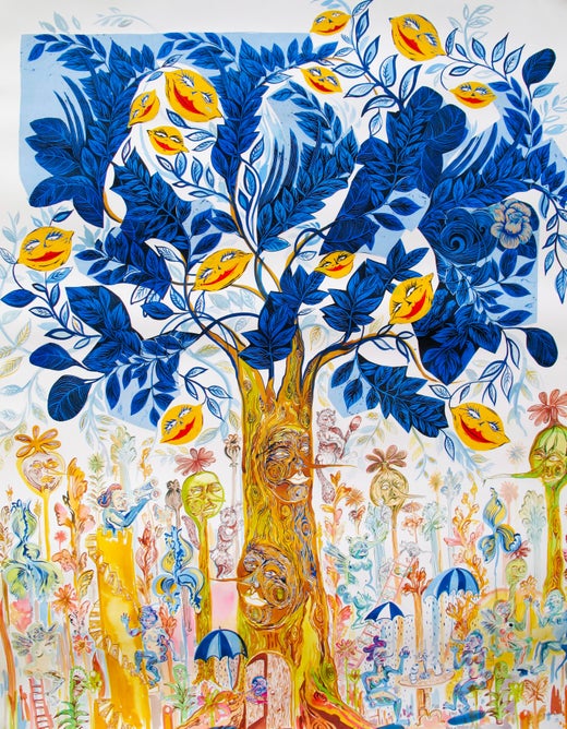 Inspiriert von japanischen Holzschnitten und indischer Miniaturmalerei hat Rock eine einzigartige Collagetechnik entwickelt, die kühne Strukturen mit großformatigen Holzschnitten und komplizierten Details kombiniert.
