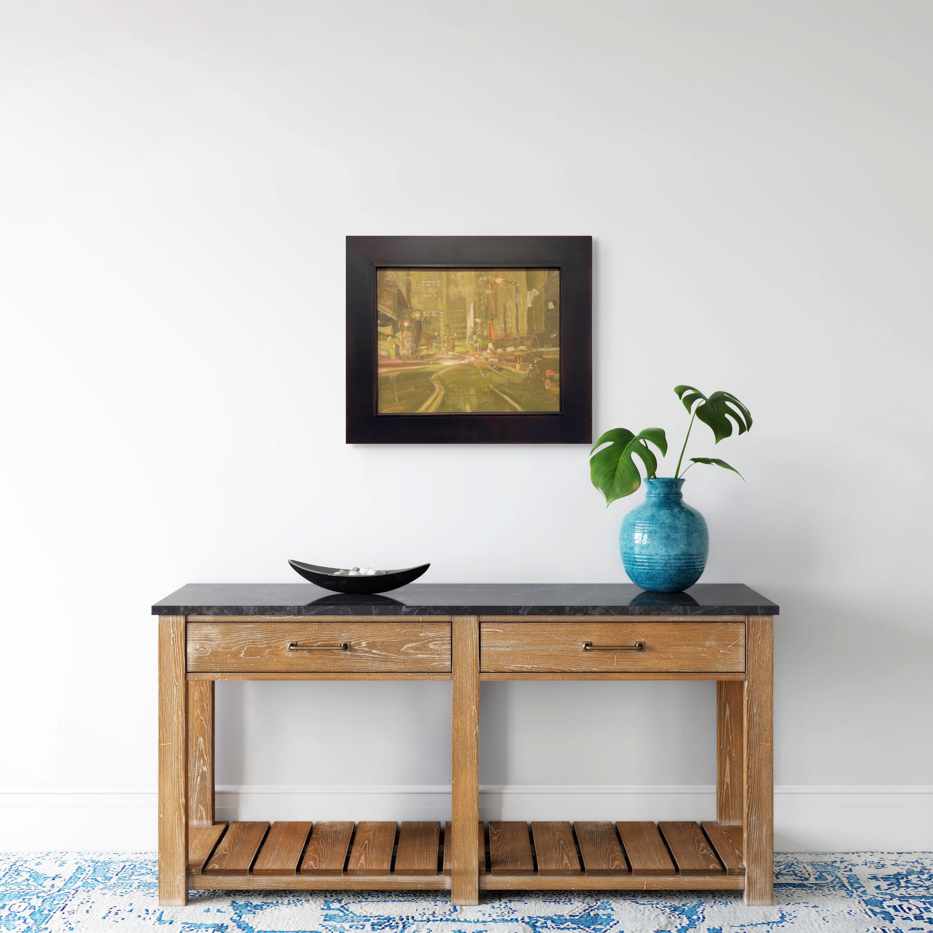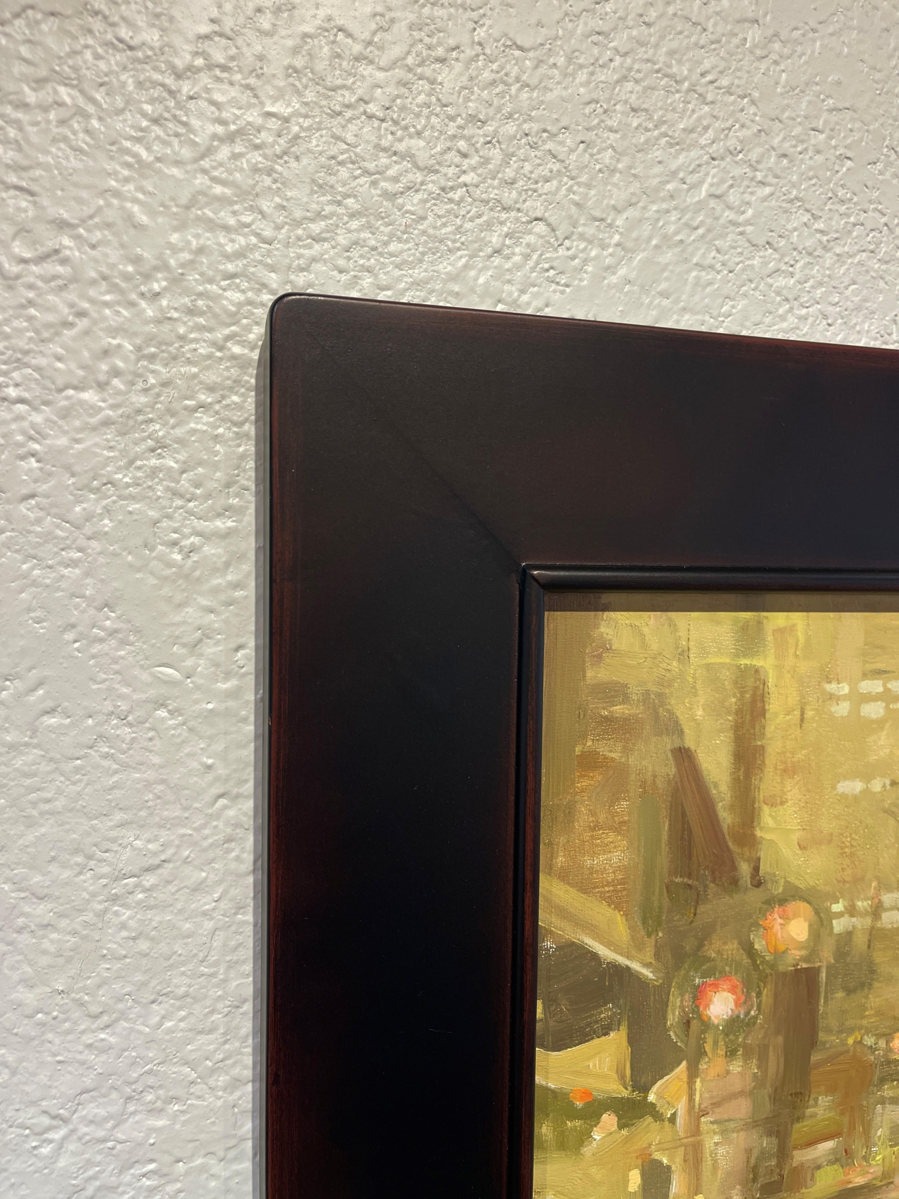Dieses Gemälde ist 16 x 20 Zoll groß und wird in einem schwarzen Holzrahmen von 22,50 x 27 Zoll gerahmt, verdrahtet und hängefertig geliefert.