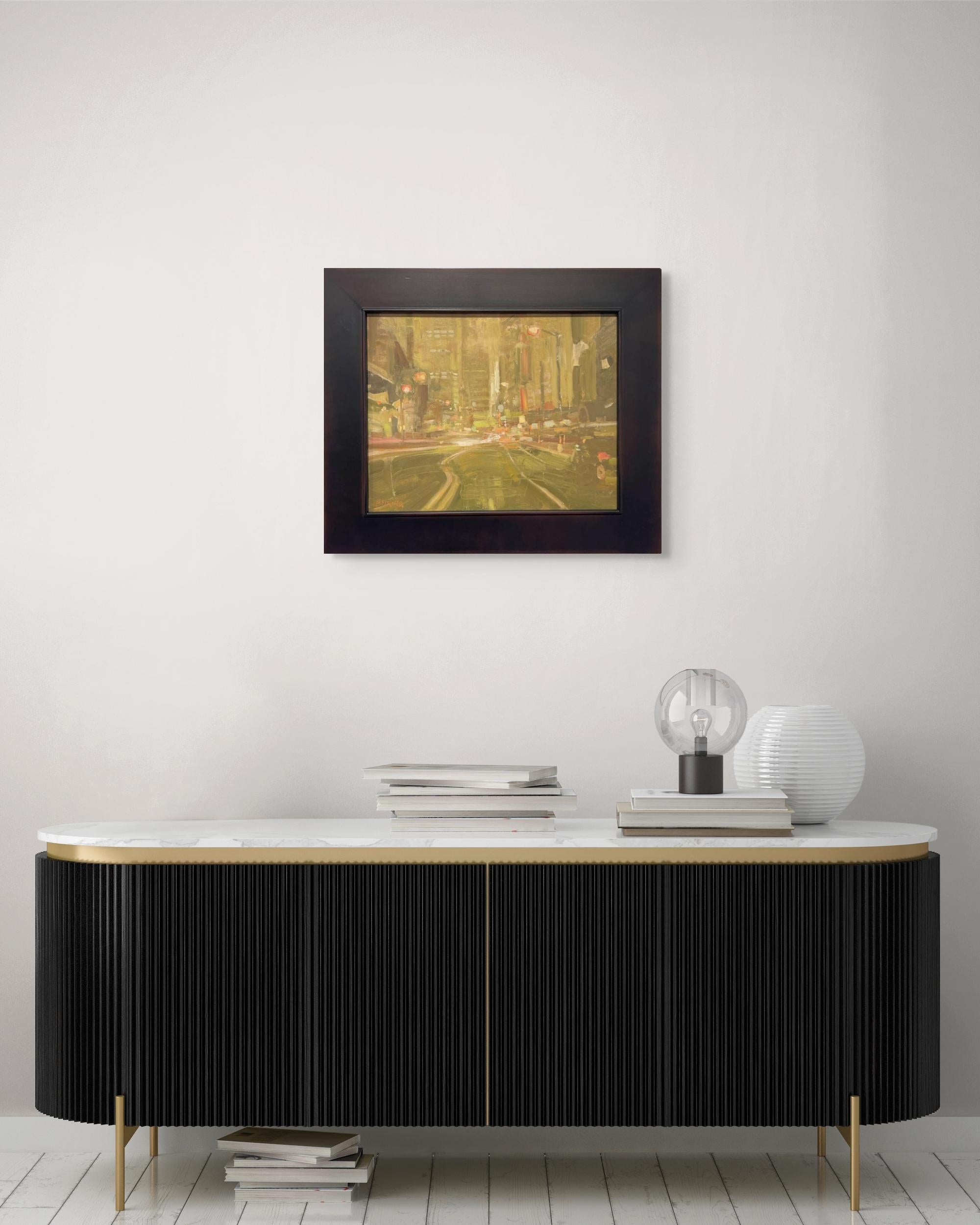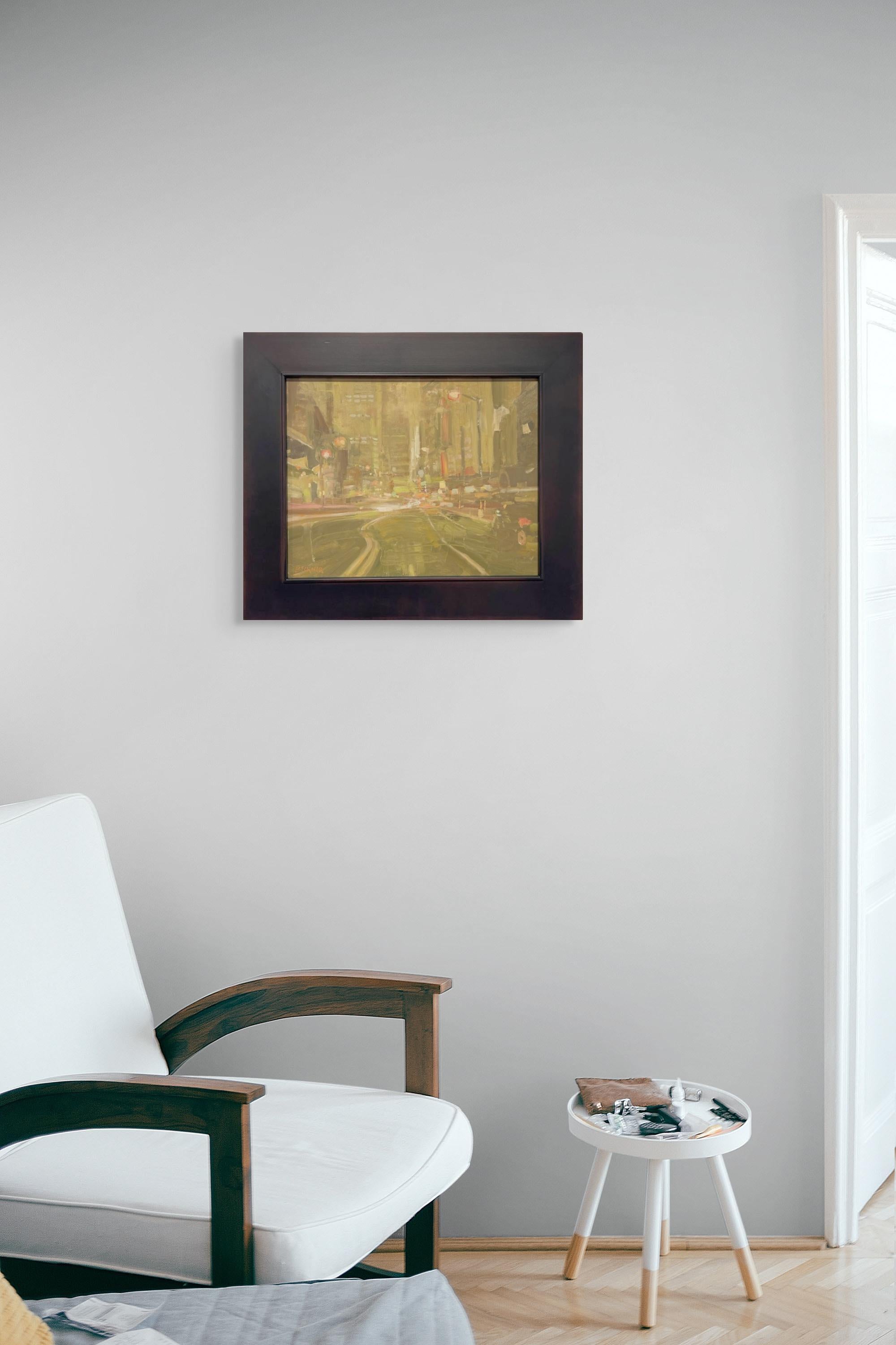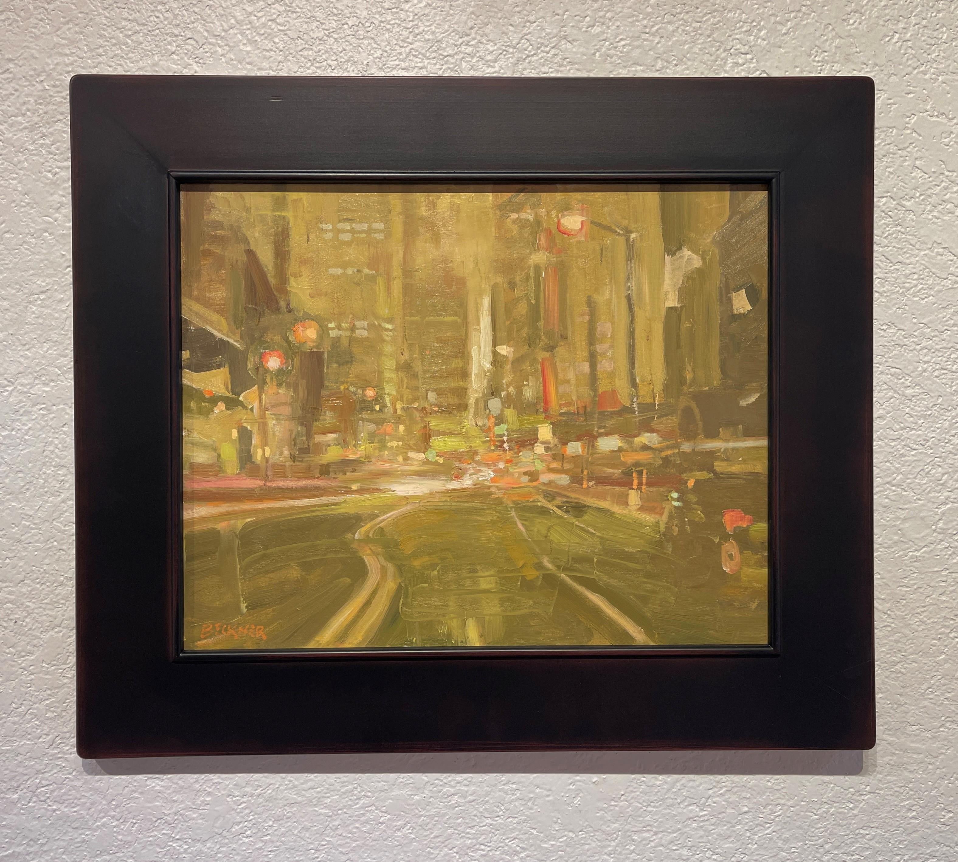 Mikael Olsons (USA) "Bar Bands Blur" ist ein originales, handgefertigtes Ölgemälde, das die Downtown einer Großstadt darstellt.