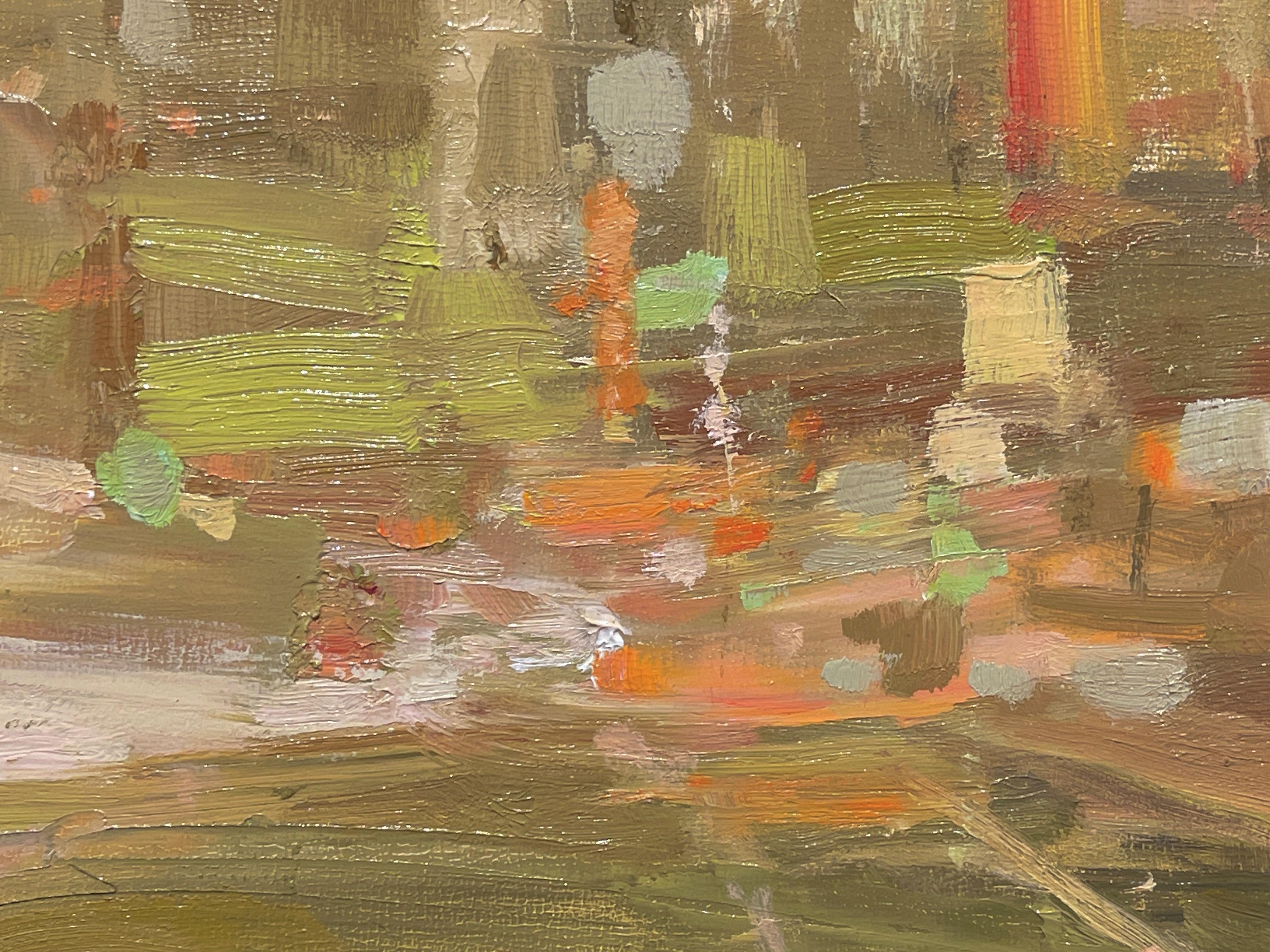 Mikael Olsons (USA) "Broadway Reflections" (2024) ist ein originales, handgefertigtes Ölgemälde, das einen Blick auf die Broadway St. im Herbst zeigt.