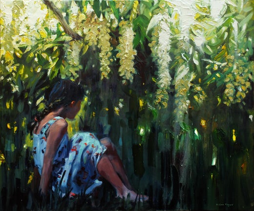 "Die Stimme" (120 x 100 cm). Julians Liebe zum Garten mit seinen zarten Geheimnissen, seiner Blumenpracht und seinem Farbenreichtum kommt in dieser schattigen Szene deutlich zum Ausdruck. Wir alle sind von der Natur in andere Bewusstseinsebenen versetzt worden. Manchmal haben wir in der Stille, der Wärme und der unvergleichlichen Ruhe eines Sommergartens das Gefühl, dass wir zu etwas Tieferem, Spirituellem gerufen werden.
