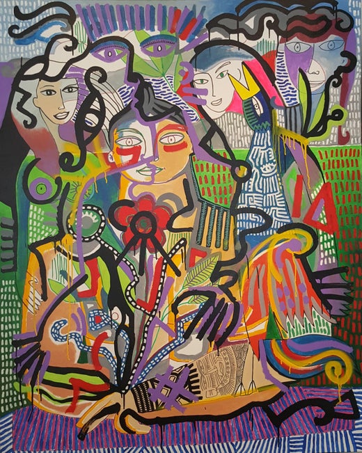 acrylmalerei auf der Leinwand, inspiriert von afrikanischen, mexikanischen und zeitgenössischen Kunstrichtungen. CANVAS 170 drückt afrikanisch anmutende Figuren auf einem Hintergrund...