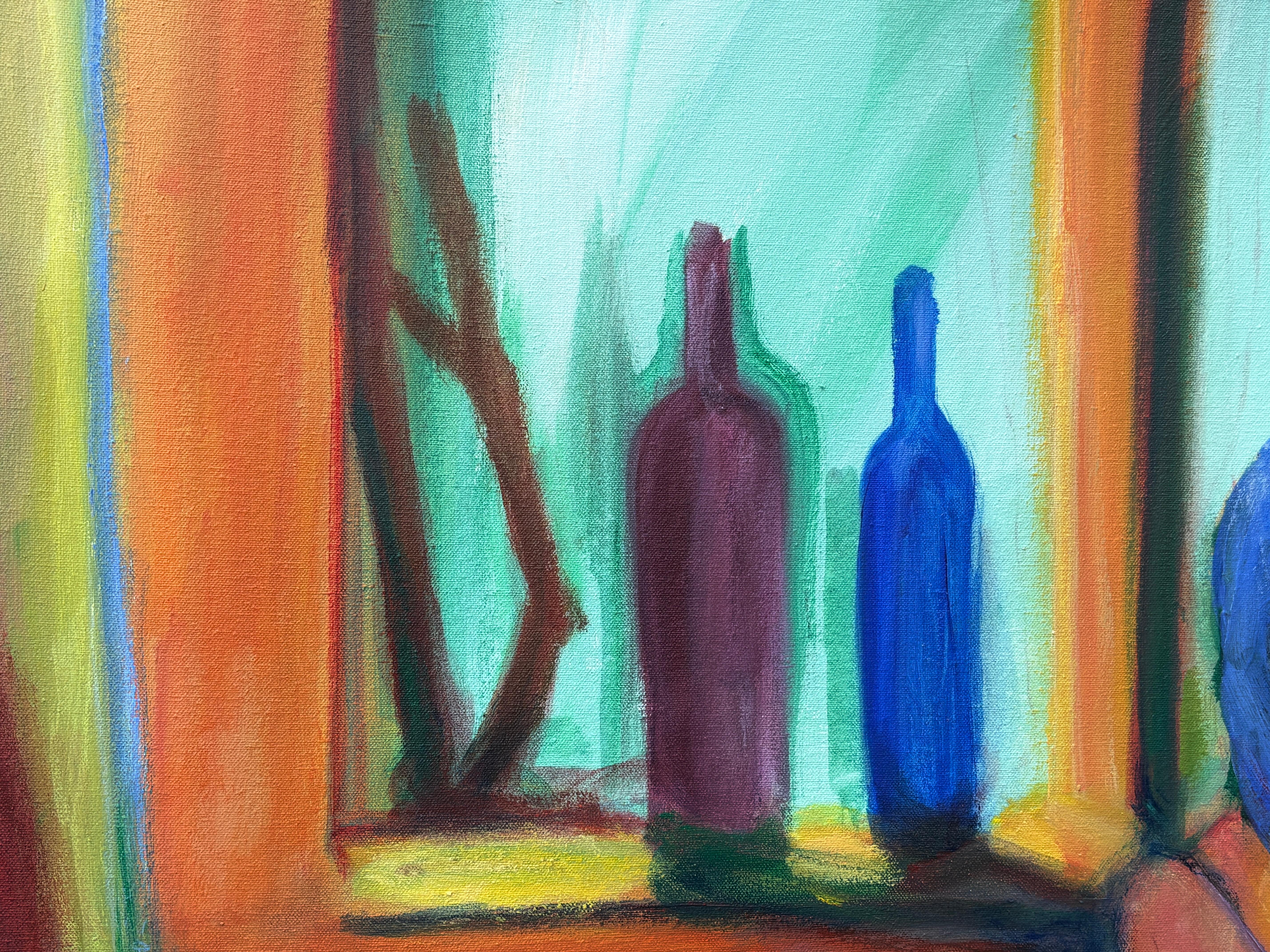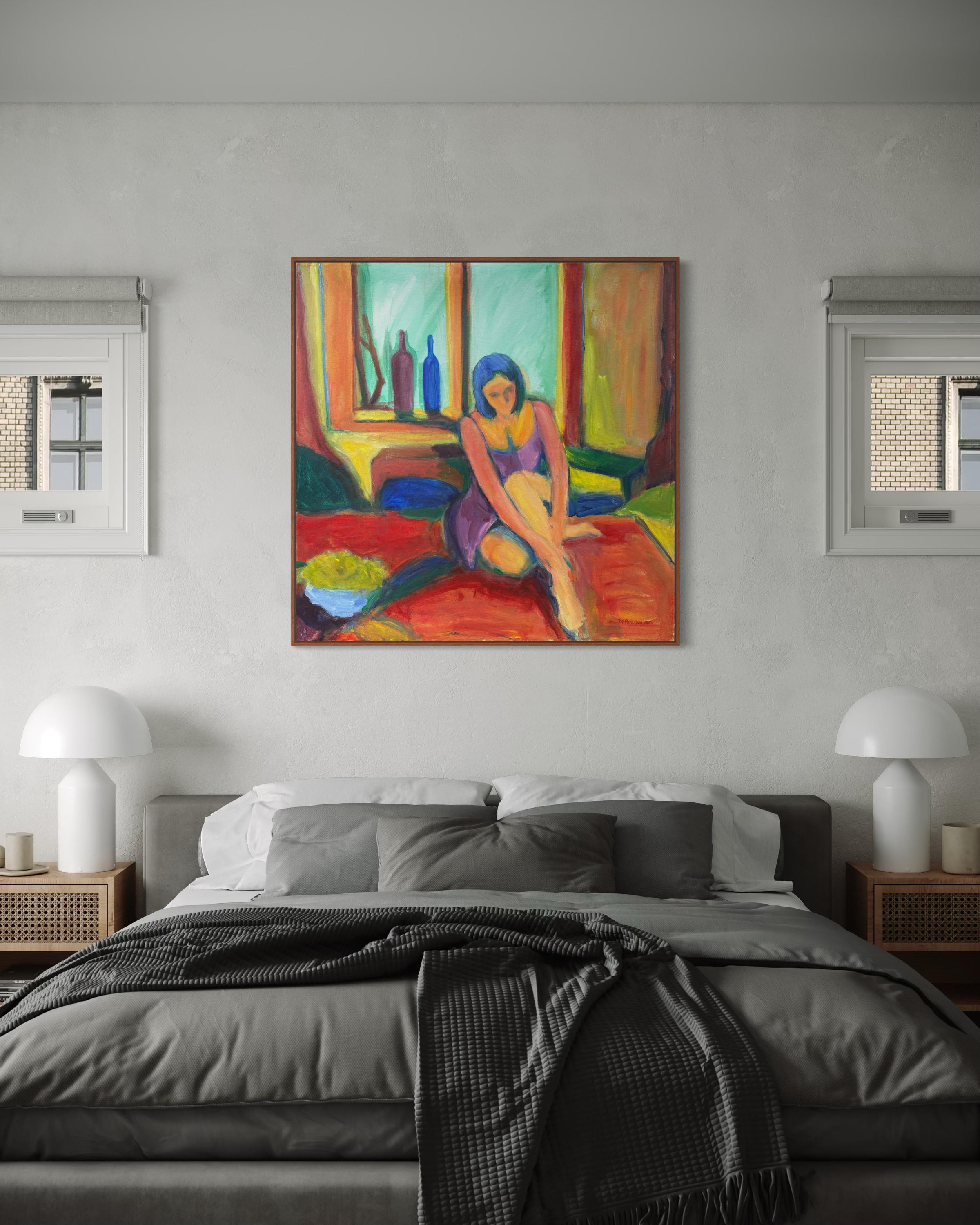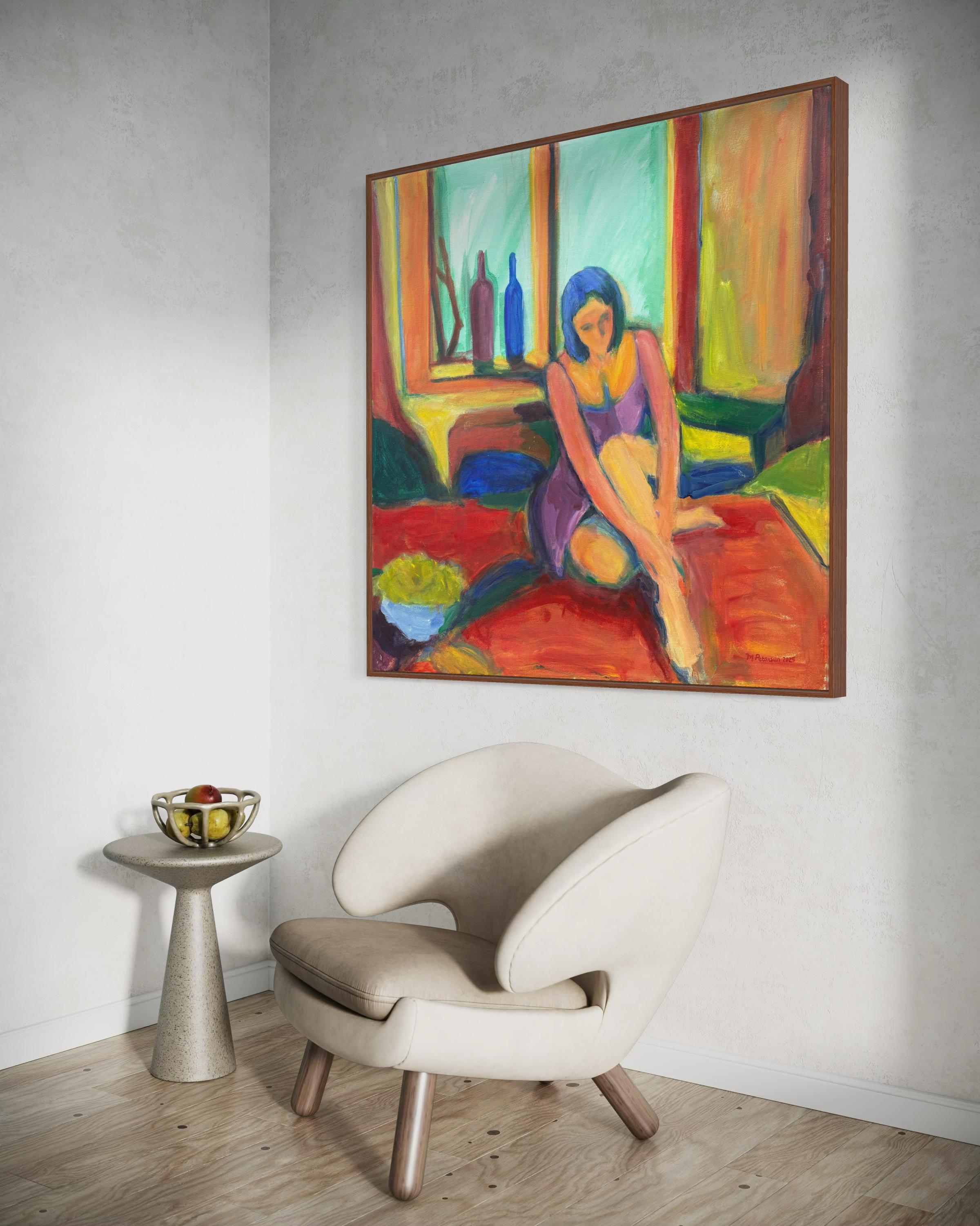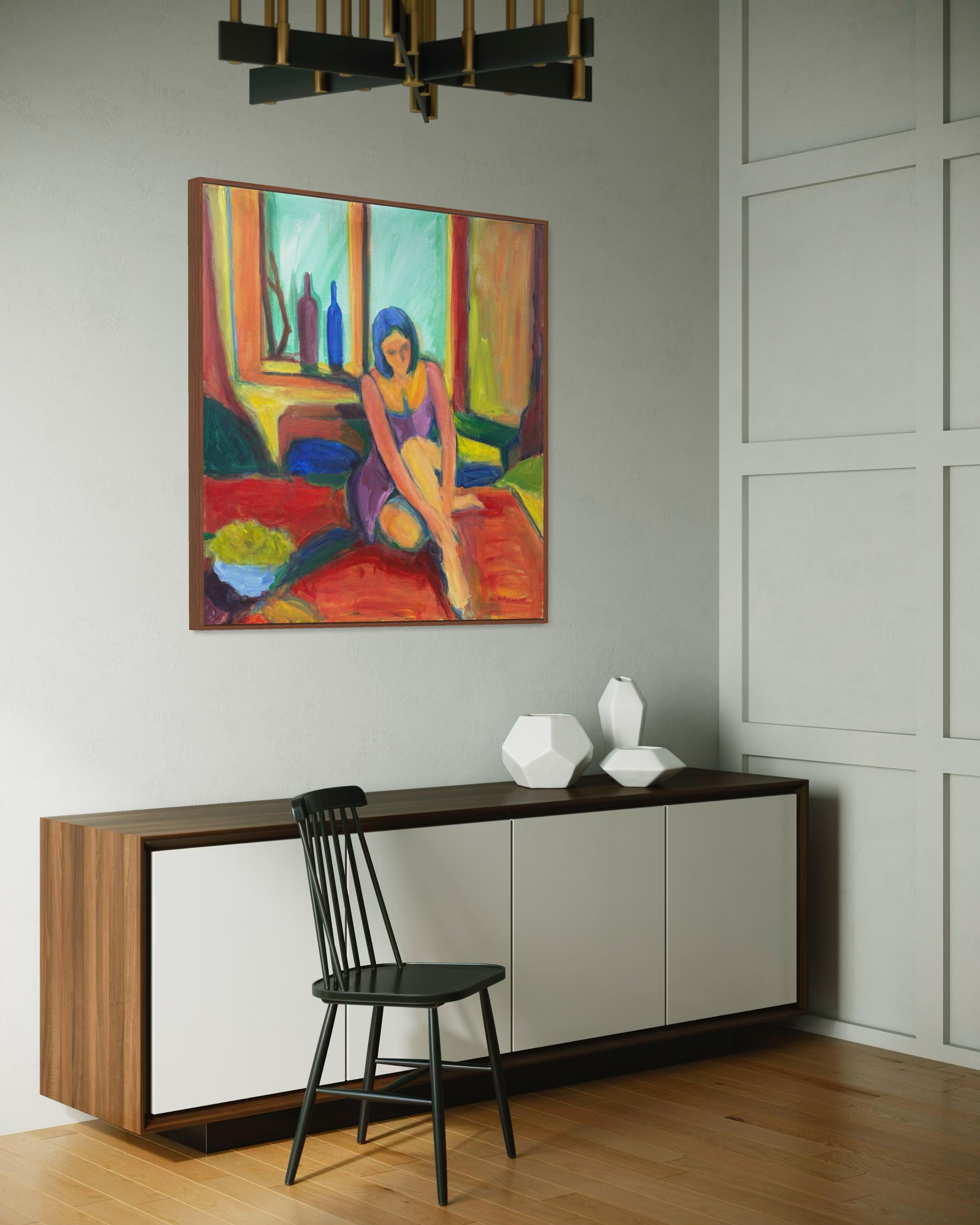 "Frau am Fenster" ist ein leuchtendes zeitgenössisches figuratives Ölgemälde, das die expressive Energie des Fauvismus widerspiegelt. Eine sitzende Frau in einem purpurroten Kleid streckt sich anmutig am Fenster, ihre Form ist mit kühnen Strichen in Kobalt-, Smaragd- und Karminrot umrissen. Der Raum ist erfüllt von leuchtenden Farben - Flaschen auf der Fensterbank, eine Schale mit Obst im Vordergrund und abstrahierte geometrische Flächen, die den Innenraum mit dem lichtdurchfluteten Außenraum verschmelzen.