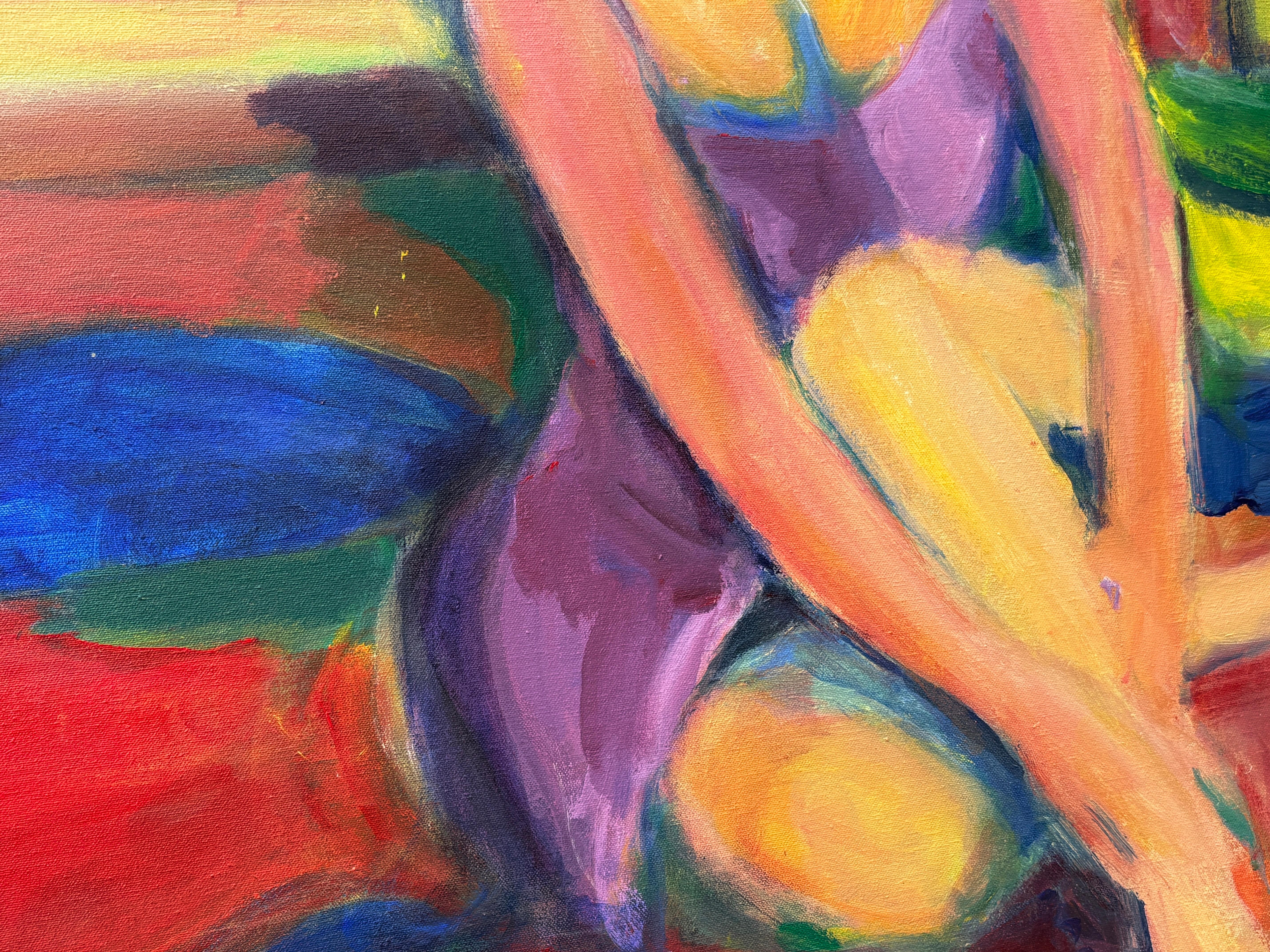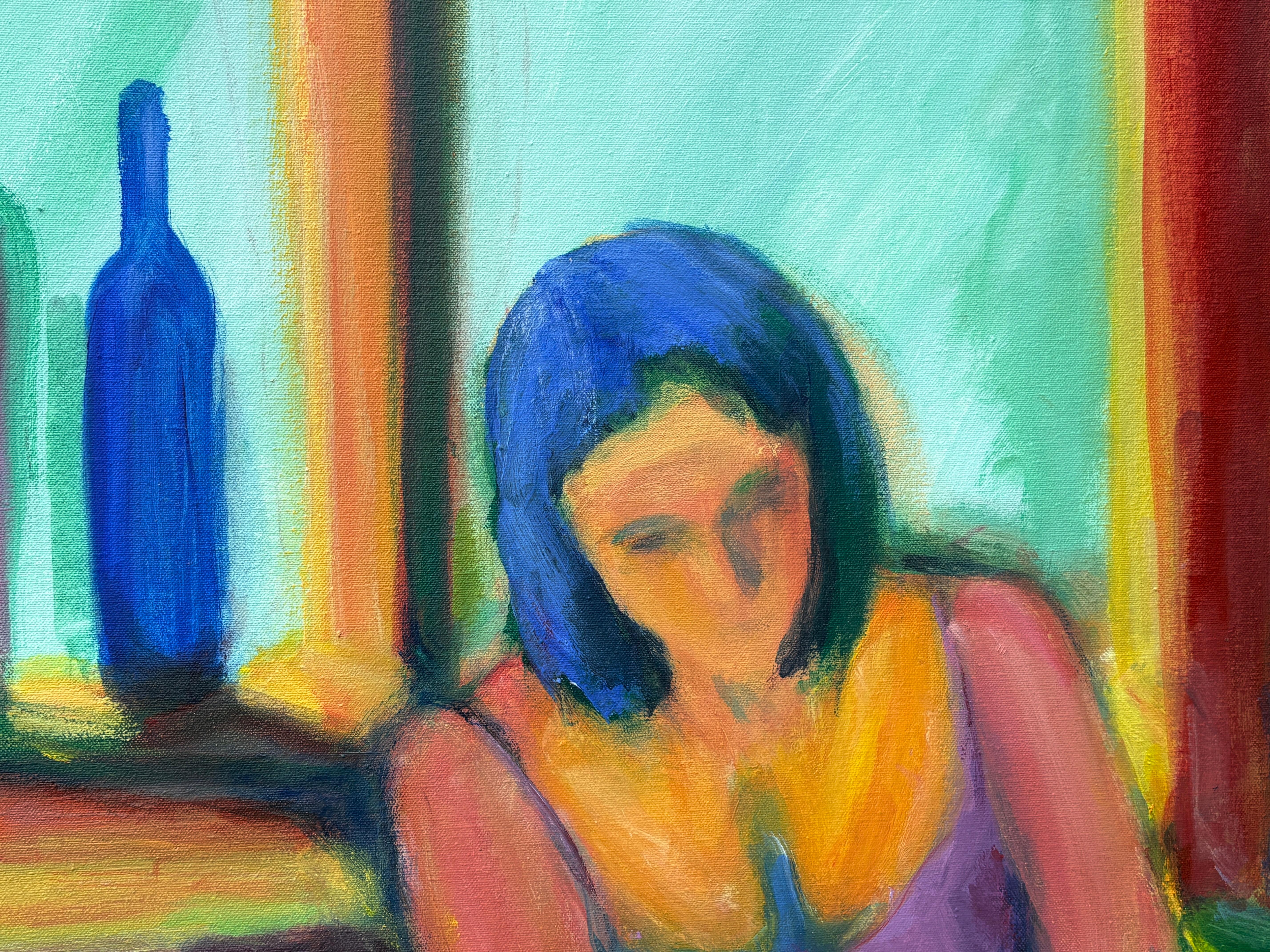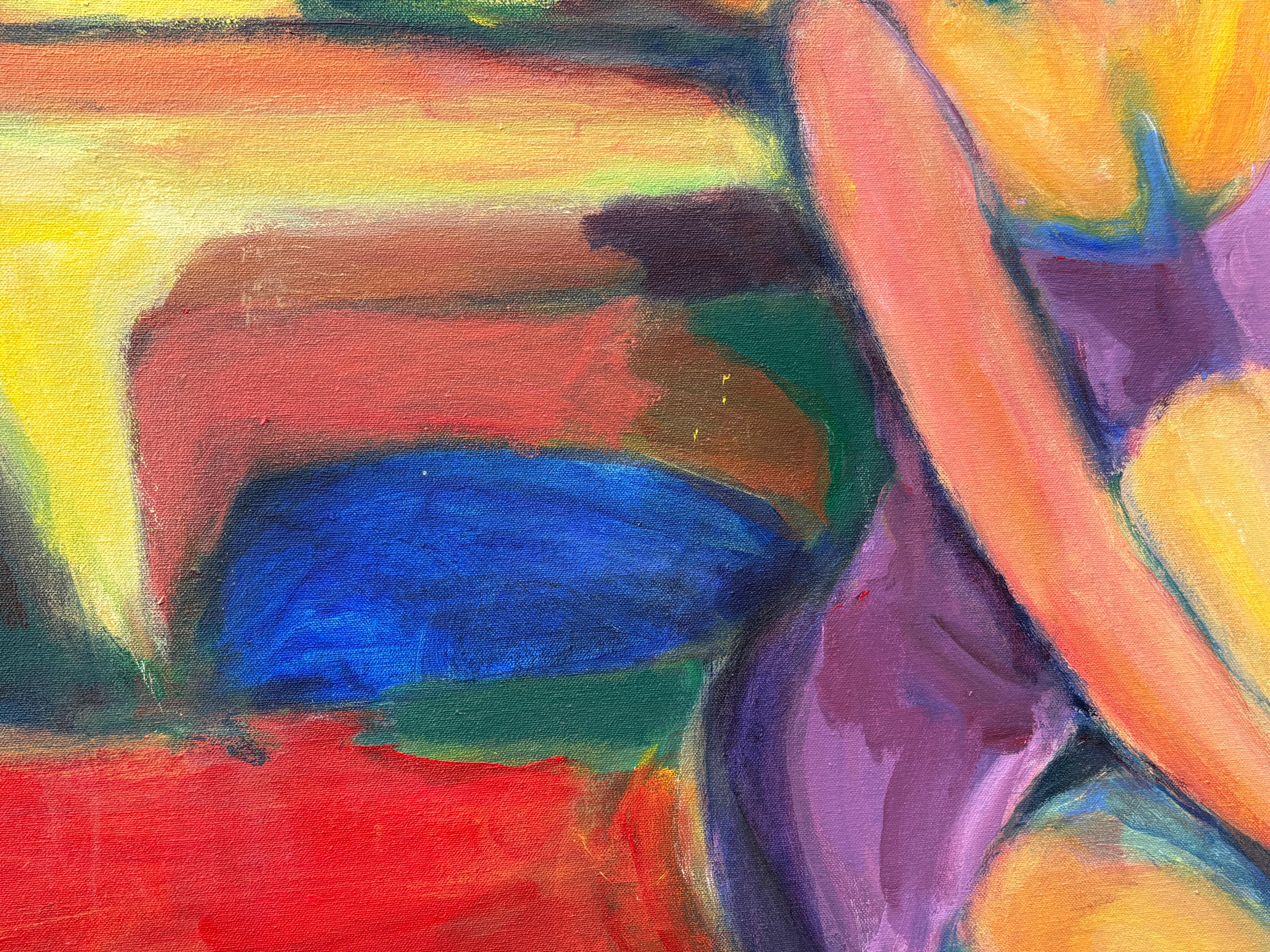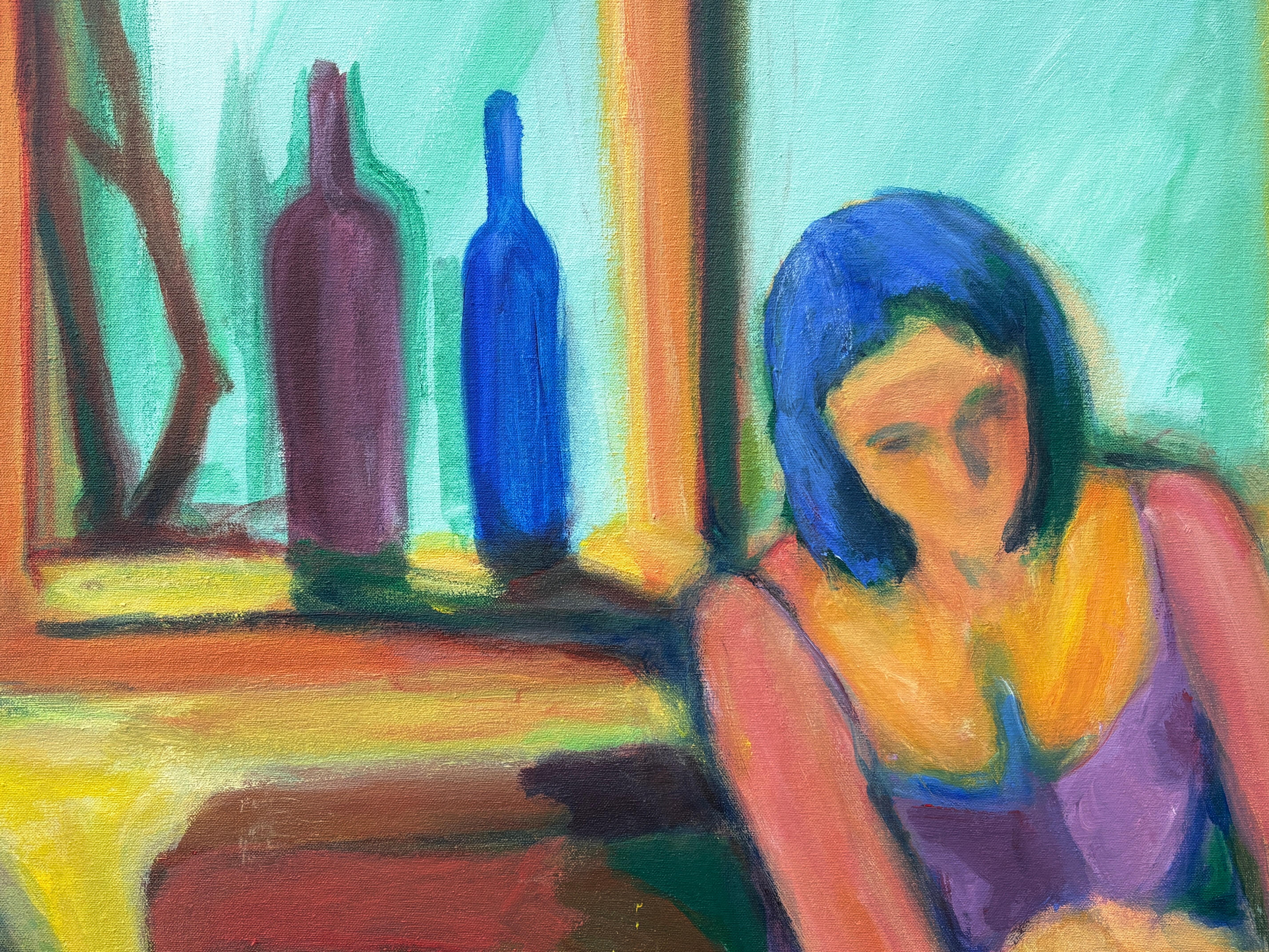 "Frau am Fenster" ist ein leuchtendes zeitgenössisches figuratives Ölgemälde, das die expressive Energie des Fauvismus widerspiegelt. Eine sitzende Frau in einem purpurroten Kleid streckt sich anmutig am Fenster, ihre Form ist mit kühnen Strichen in Kobalt-, Smaragd- und Karminrot umrissen. Der Raum ist erfüllt von leuchtenden Farben - Flaschen auf der Fensterbank, eine Schale mit Obst im Vordergrund und abstrahierte geometrische Flächen, die den Innenraum mit dem lichtdurchfluteten Außenraum verschmelzen.