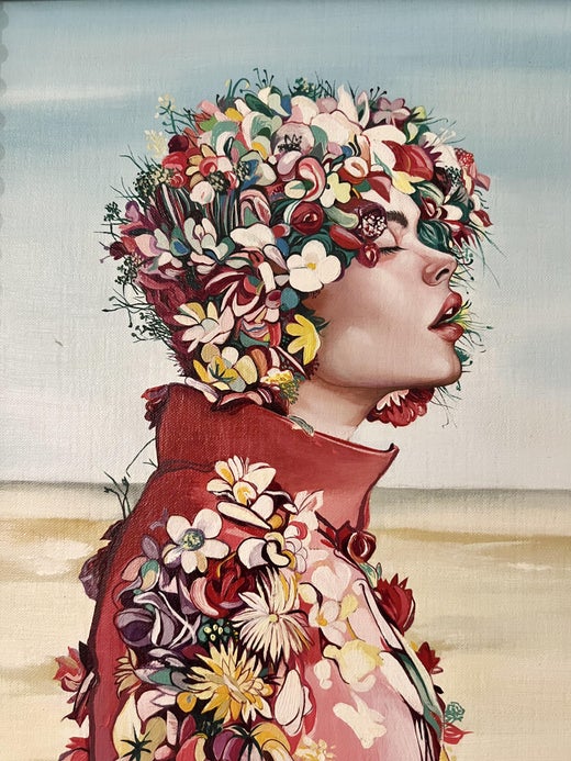 Das Gemälde "Mindset" von Minas Halaj ist ein lebhaftes Öl auf Holzplatte. Es zeigt eine Frau, deren Kleid und ganzer Kopf mit einer Reihe bunter Blumen geschmückt ist, was eine eind...