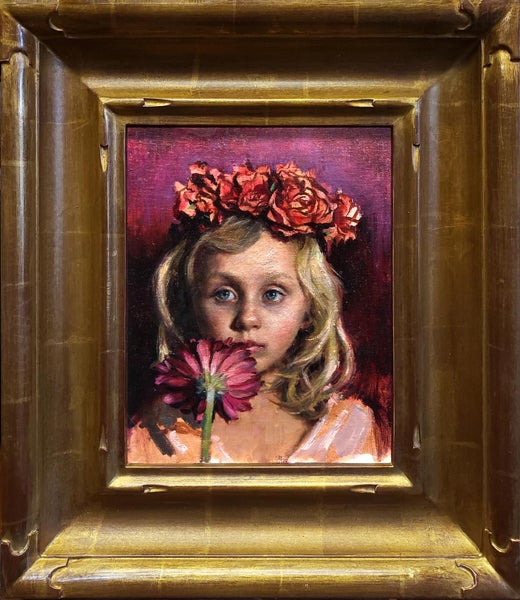Bei diesem Gemälde habe ich mich dafür entschieden, uns in einer traumhaften Umgebung im Freien darzustellen, wobei ich lebendige Farben, Beleuchtung und Umgebung verwende. Ich habe Gold- und Perlglanzfarbe in den Grundschichten aufgetragen, die manchmal durchscheinen. Indem ich eine Pose wählte - ihre Hände berühren mein Gesicht - hoffe ich, dass der Betrachter die Liebe und Verbundenheit sieht, die wir teilen."