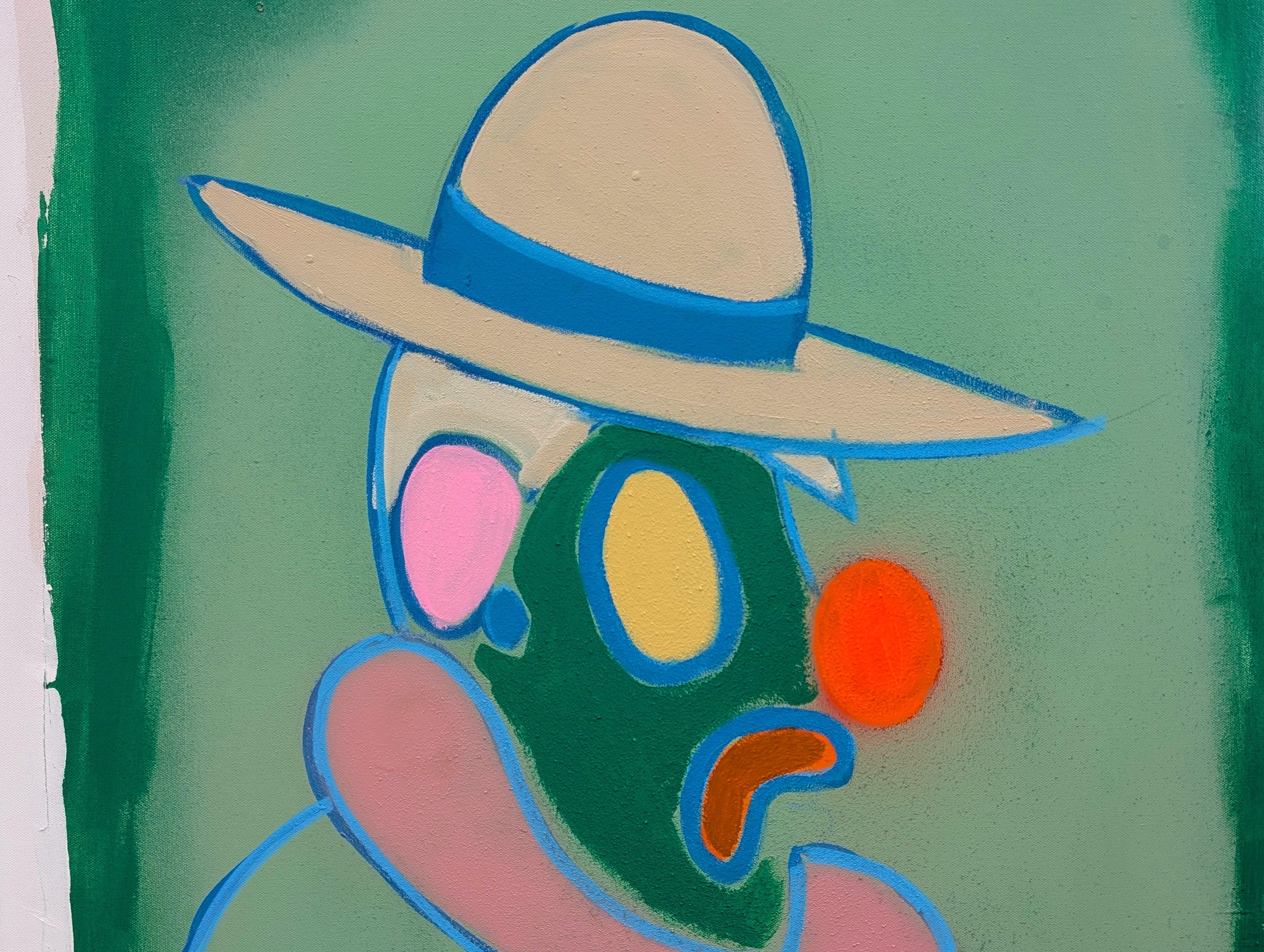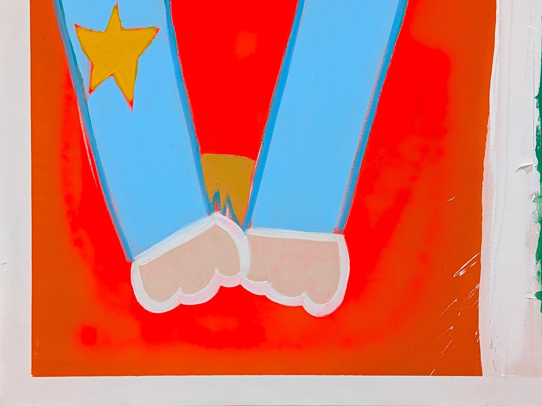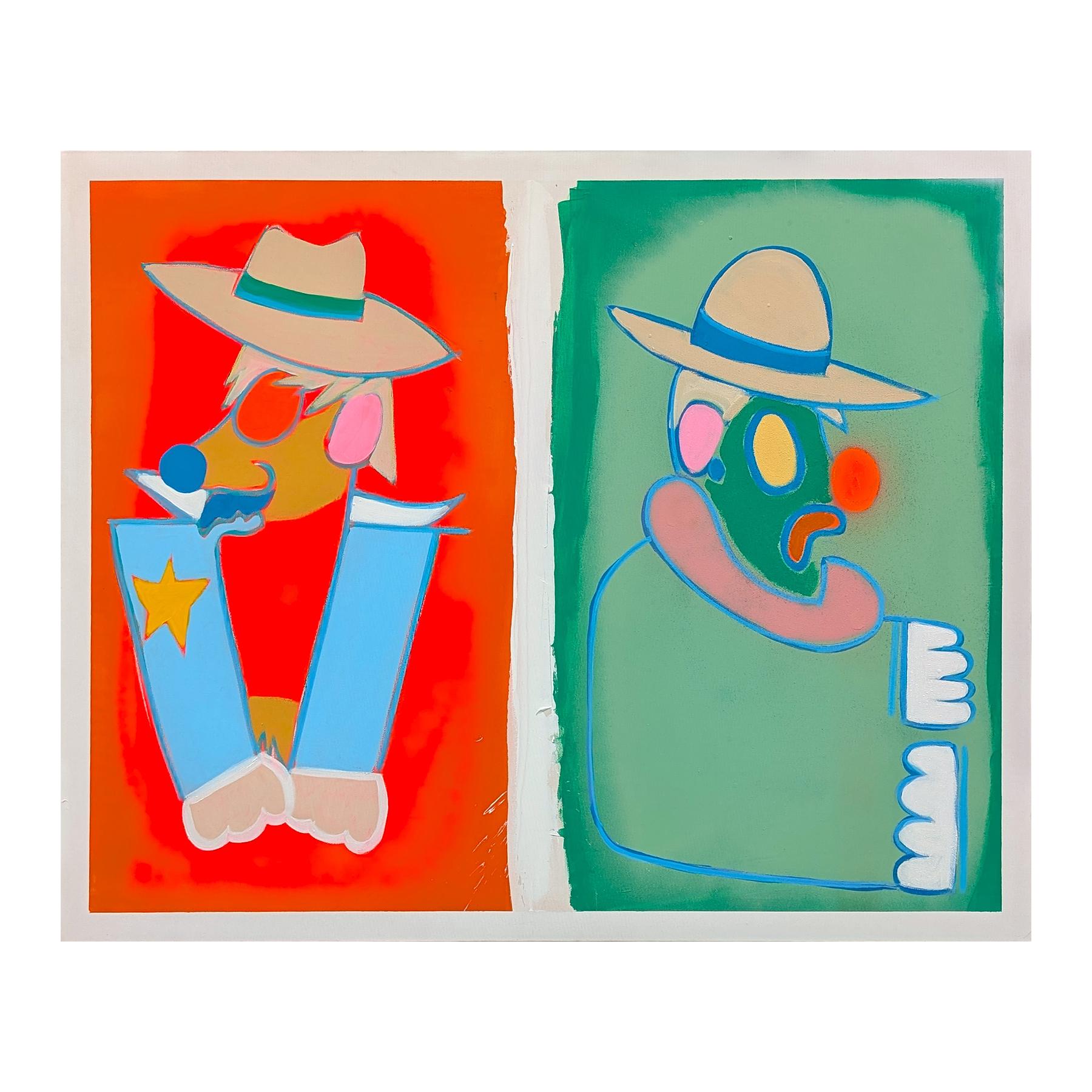 Zeitgenössische, farbenfrohe, westlich inspirierte Cowboy-Malerei des in Texas lebenden Künstlers Nick Stevenson. Das Werk zeigt ein Paar bunte, von Cartoons inspirierte Rodeo-Clowns vor Blöcken mit kräftigen, leuchtenden Farben. Derzeit ungerahmt.