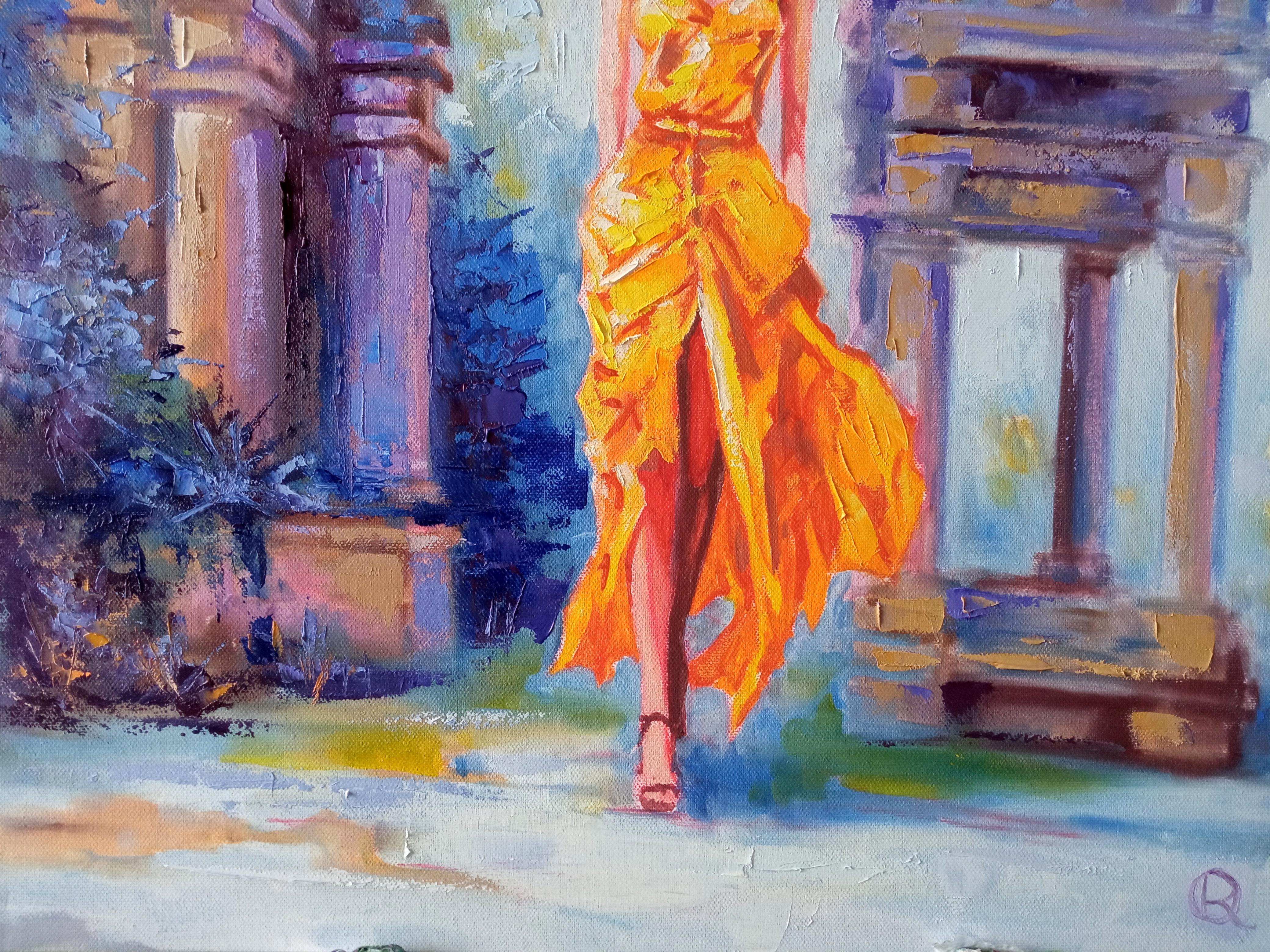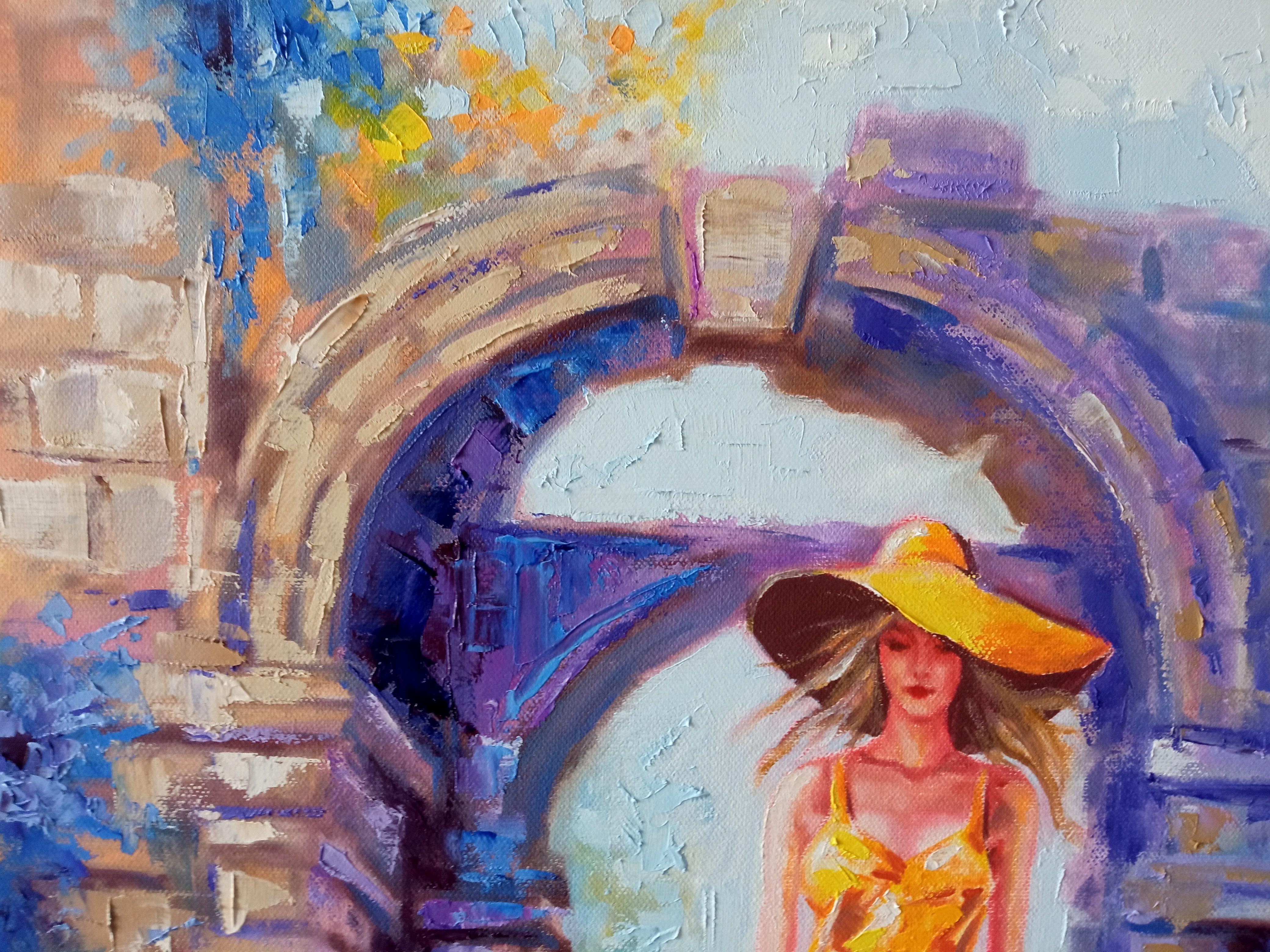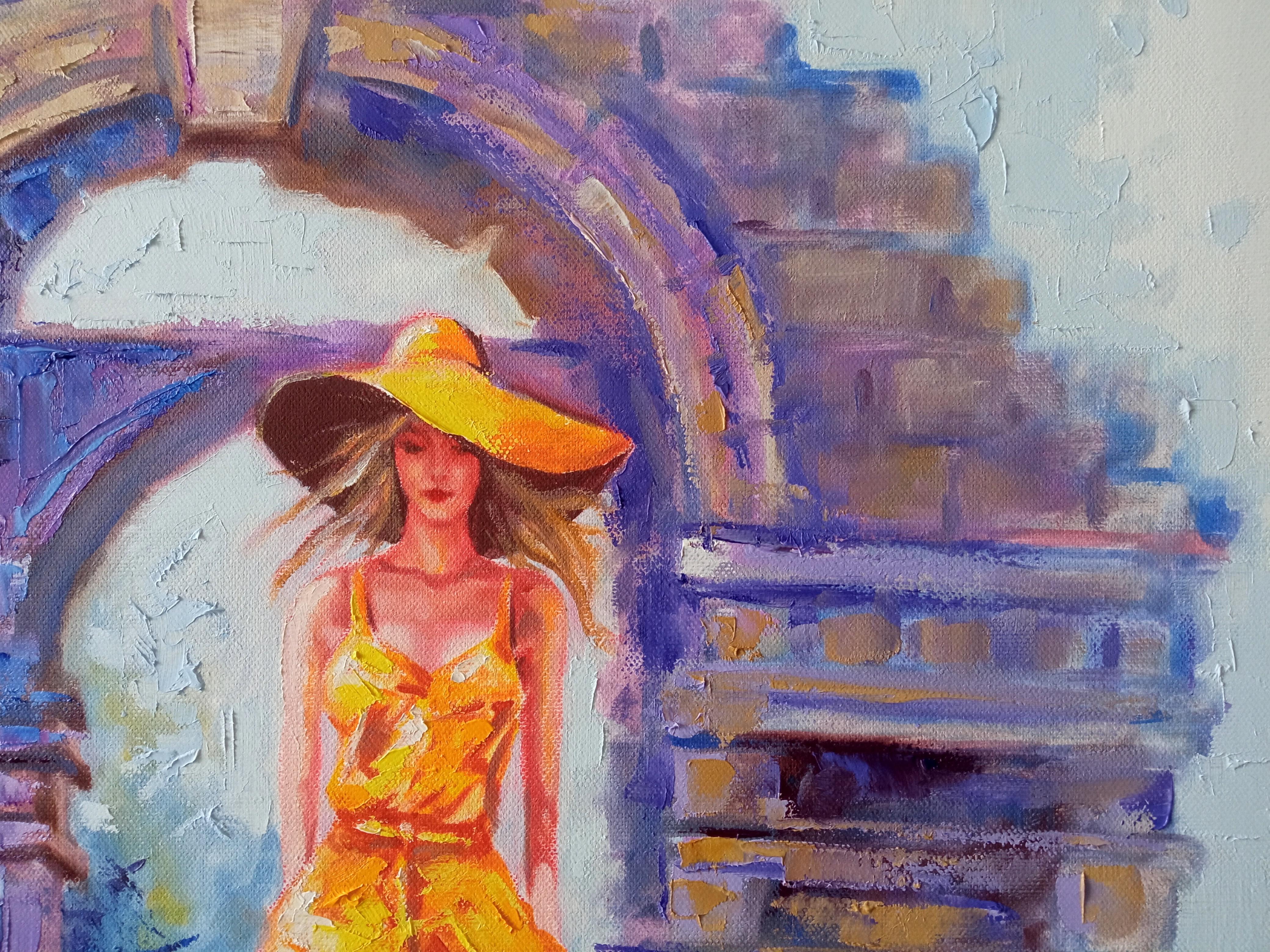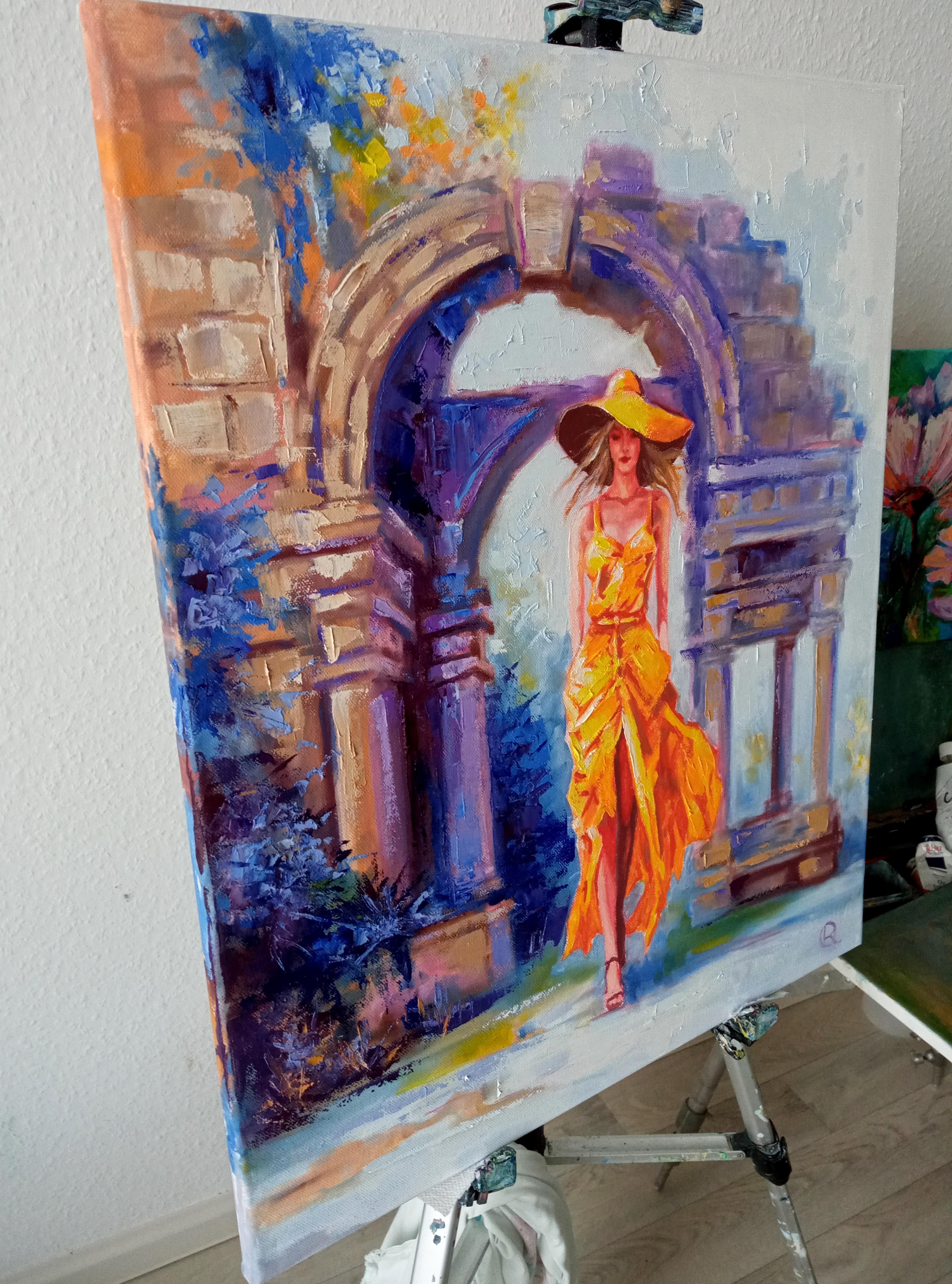 Das Gemälde "Das Mädchen in Gelb" ist ein Symbol für wahre Schönheit, die der Zeit nicht standhält. Schritt für Schritt geht sie durch den Bogen der Vergangenheit und verbindet so die Ewigkeit mit der Gegenwart. Ihr leuchtendes Kleid ist wie ein Sonnenstrahl, der die Steine der Jahrhunderte zum Leben erweckt und uns daran erinnert, dass wahre Schönheit ewig ist und die Harmonie der Seele mit der Welt zu jeder Zeit unveränderlich bleibt.
