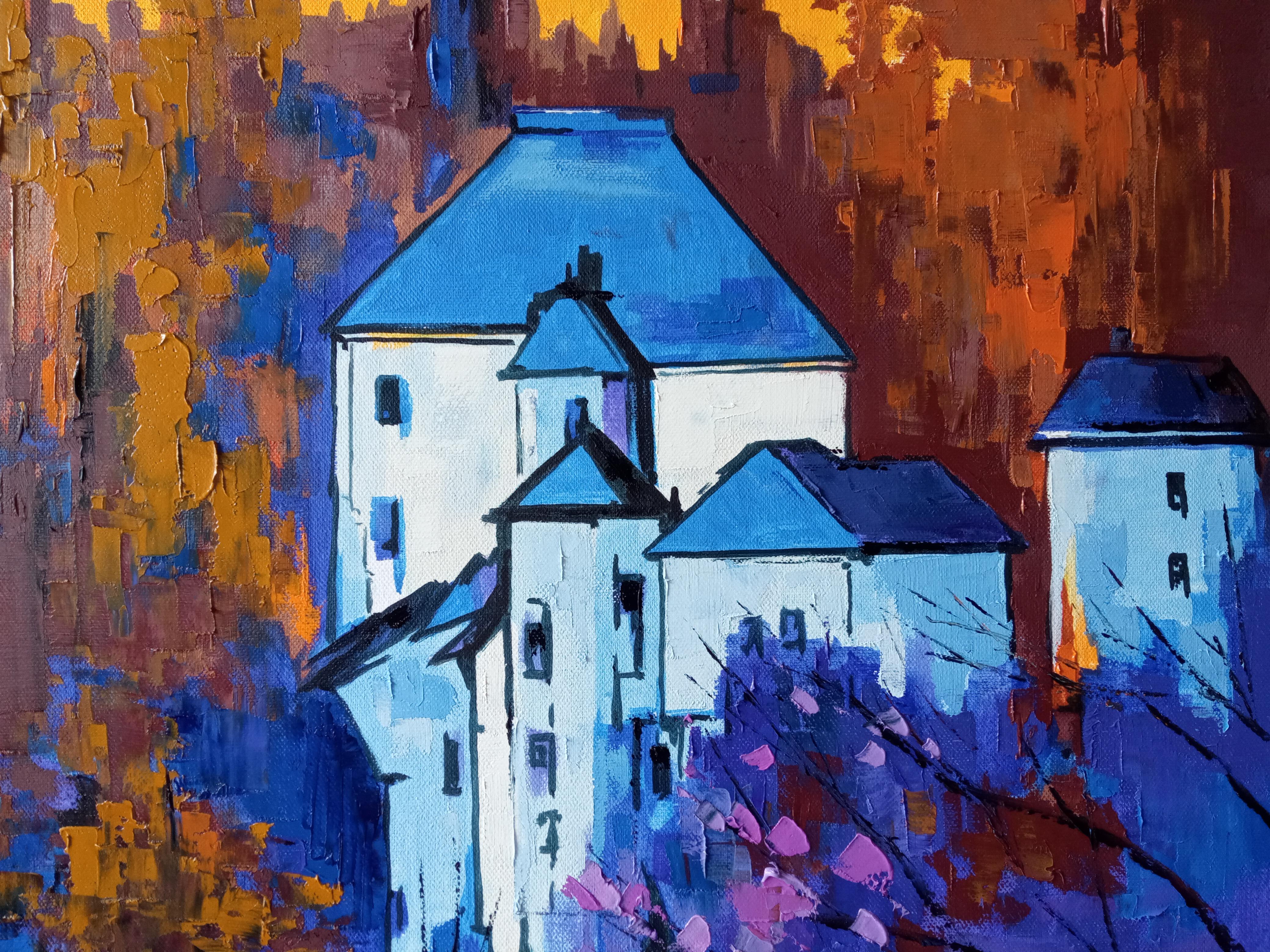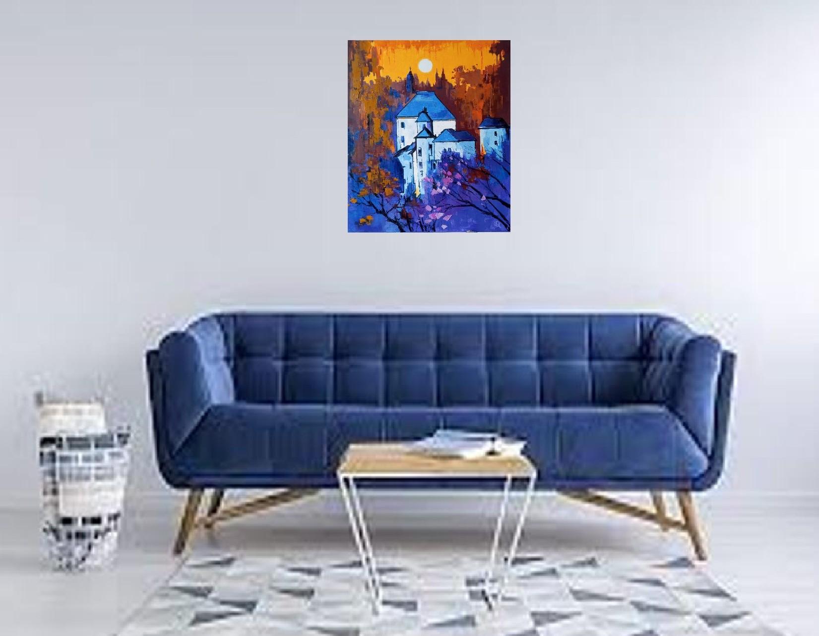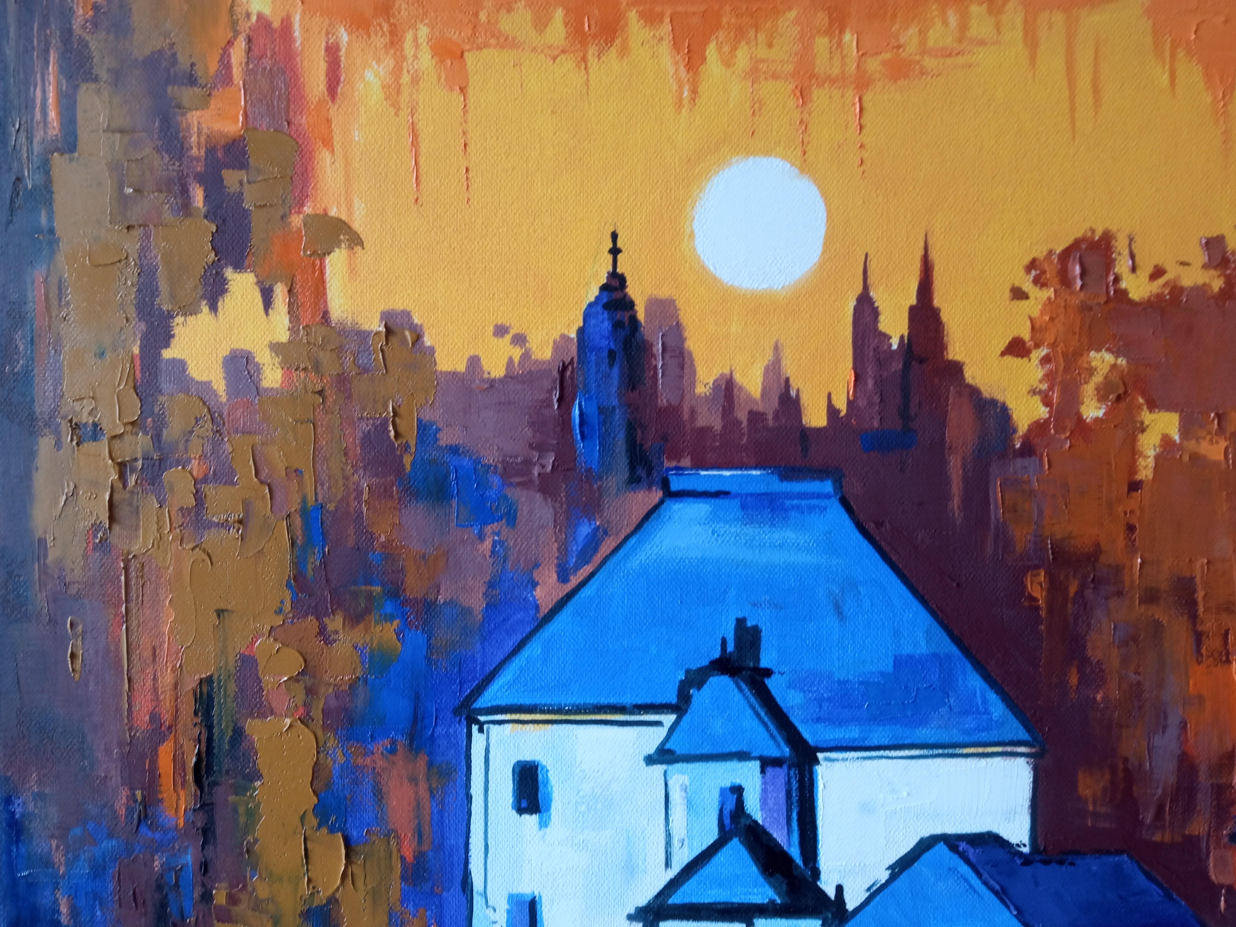 Das Gemälde "Vollmond" zeigt eine stimmungsvolle Stadtlandschaft, in der die Architektur der alten Gebäude vom Mondlicht beleuchtet wird. Der Kontrast zwischen den kühlen Blautönen der Gebäude und dem warmen, orange-goldenen Himmel erzeugt ein Gefühl von Geheimnis und Zauberei. Das Gemälde vermittelt einen Moment der Ruhe und die Schönheit des Vollmonds.