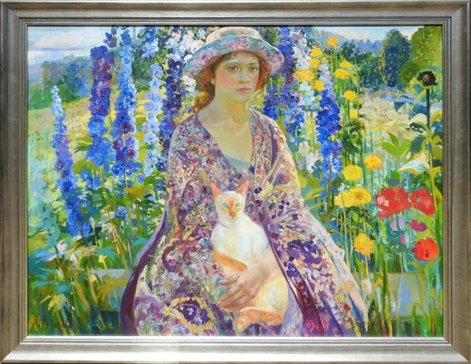 "Tania" von Olga Suvorova ist ein Öl auf Leinwand Gemälde misst 42,5x31,5 in. und ist ein erstklassiges farbiges Beispiel für russische figurative Realismus in seiner schönsten. Ihre Farbpalette und Stoffteile tragen zur Stimmung der Geschichte bei, die sie zu erzählen versucht. Auf diesem Gemälde sitzt ein junges brünettes Mädchen in Rosa und Weiß in einem Gartenzimmer, das mit allerlei Blumen, darunter Rosen und Lilien, gefüllt ist, während ihre Siamesische Katze auf ihrem Schoß liegt. Das Bild ist in einen schönen silbernen Rahmen eingefasst, der die blauen und rosa Blumen des Gemäldes hervorhebt. Im Mittelpunkt der großen Werke von Olga Suvorova (Russin, geb. 1966) stehen die Commedia dell'arte, ihre Figuren und Themen, die in einem Stil dargestellt werden, der von den Präraffaeliten, Gustav Klimt und traditionellen russischen Ikonen beeinflusst ist. Olga Suvorova hat ihren eigenen Malstil entwickelt - Lifestyle-Porträts von kostümierten Personen in den Interieurs verschiedener Epochen. Ihr Werk ist eine Nostalgie für die St. Petersburger "World of Art"-Bewegung mit ihrer Retrospektive und ihrer Liebe zum 18. Jahrhundert. Ihre kunstvollen Kostüme - Seide und Samt, Juwelen und Stickereien - sind oft die Stars einer Szene, die sie mit Musikinstrumenten, Blumen und Vögeln abrundet. Das Ergebnis ist ein üppiger Wandteppich, zart in der Empfindung, aber voll von unbestreitbar ungestümer Farbe innerhalb eines Gemäldes.