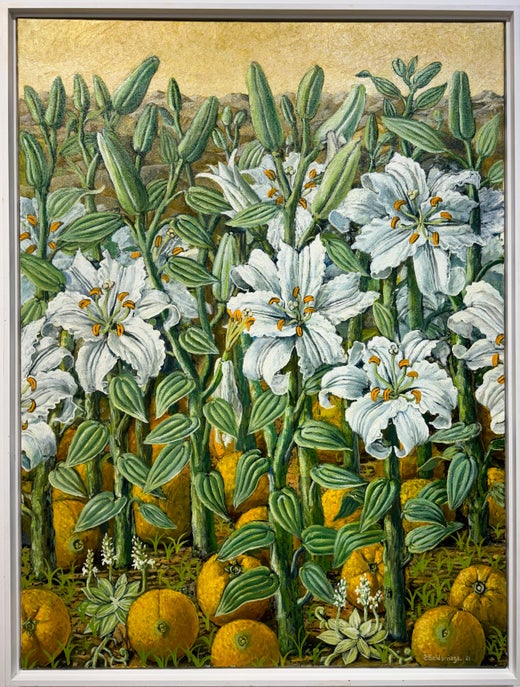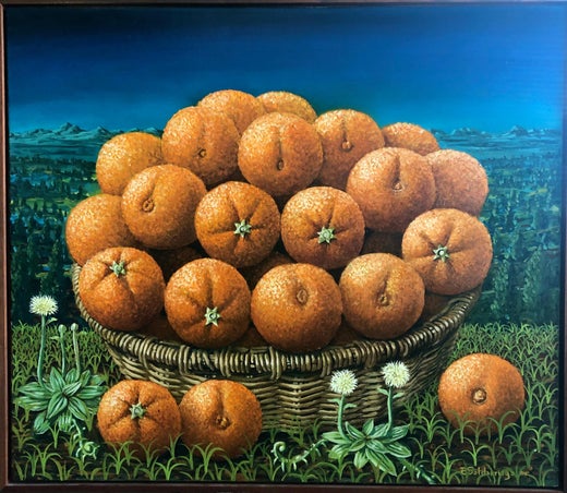 Der Künstler Rafael Saldarriaga bringt Elemente seiner kolumbianischen Heimat in Form von hellen Stillleben und figurativen Porträts mit dunkleren, düsteren Tönen zum Ausdruck. Ob er nun eine Schale mit Orangen mit realistischer Klarheit einfängt oder einen jenseitigen Korb mit Äpfeln auf einem Tisch vor dem Hintergrund der trockenen Prärie darstellt, Saldarriaga schafft Werke mit einer einzigartigen Essenz.