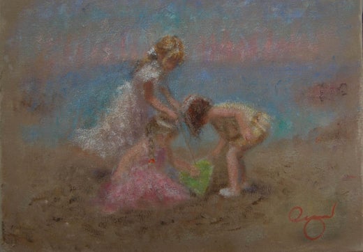 Moderne impressionistische Strandszene Öl von drei kleinen Kindern, die am Strand Sandburgen bauen.