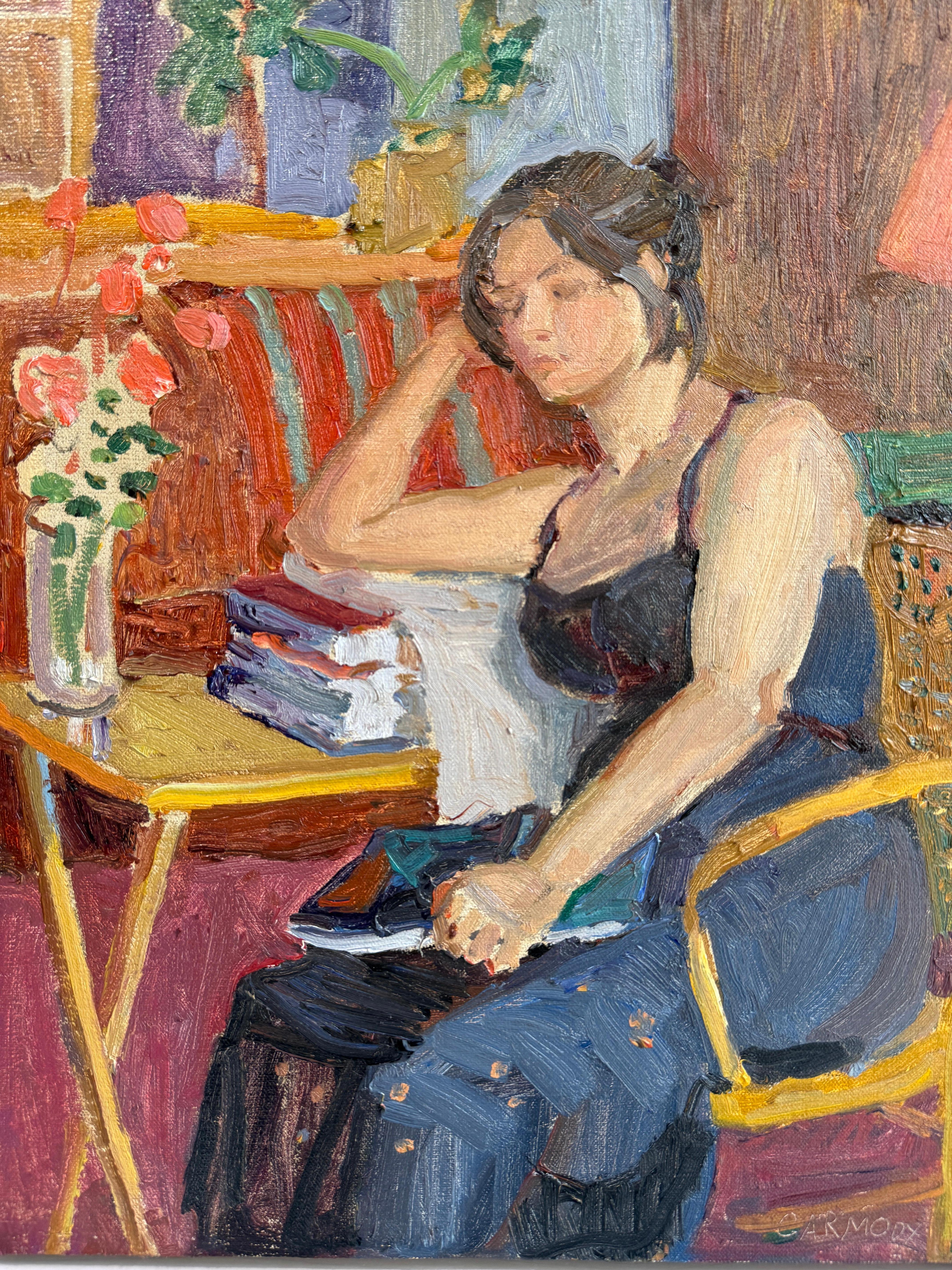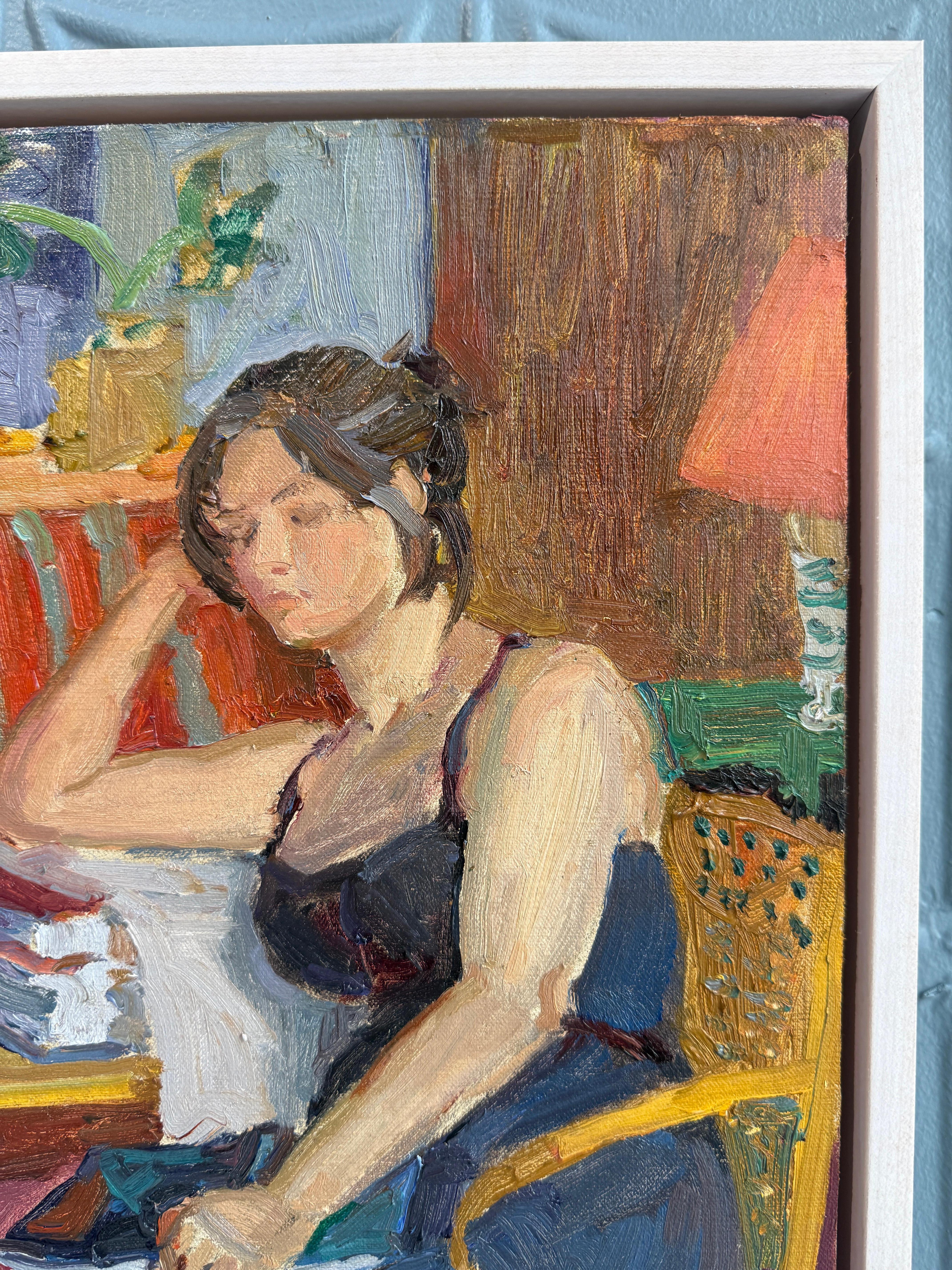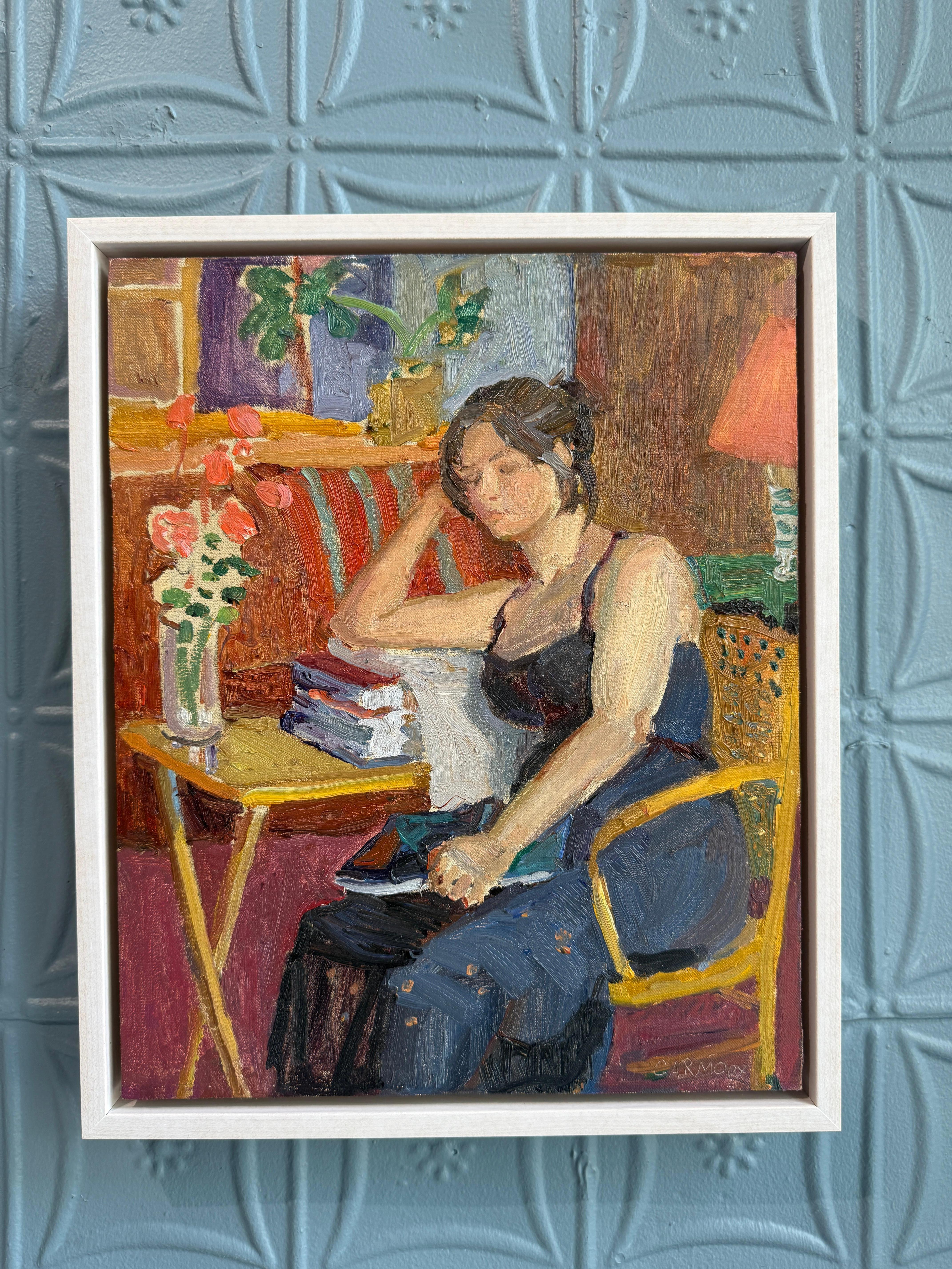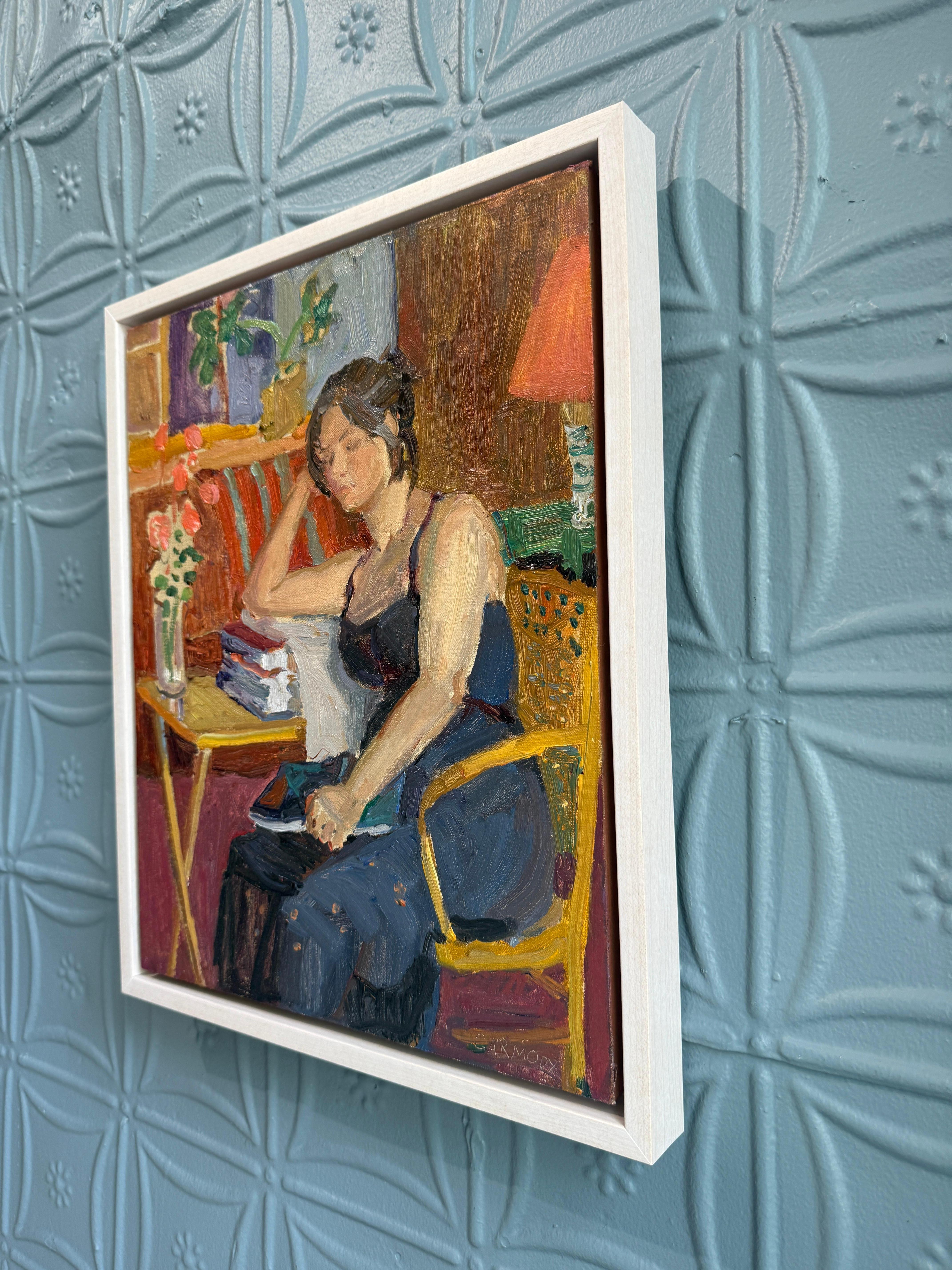 "Interior" von Kelly Carmody ist ein impressionistisches Ölgemälde auf Leinen, das eine von drei Iterationen ist, die der Künstler von dieser Szene gemacht hat. In diesem Prozess begann die Künstlerin mit einem Ölgemälde auf der Grundlage des lebenden Modells vor Ort, dann malte sie ein zweites Gemälde des ursprünglichen Gemäldes, und schließlich schuf sie ein drittes Gemälde auf der Grundlage des zweiten, diesmal auf Papier. Dieser generative Prozess für figurative Werke erlaubte es der Malerei, noch impressionistischer zu werden und mit der Perspektive zu spielen, insbesondere in Bezug auf Tiefe und Flächigkeit. "Interieur" zeigt eine Frau, die auf einem Stuhl sitzt und ihren Kopf mit dem Arm abstützt, während sie sich an einen Bücherstapel rechts von ihr lehnt. Die Augen der Frau scheinen ruhig, ja sogar geschlossen zu sein, wie es für Carmodys Stil typisch ist, in ihren Gemälden Szenen von Frauen in Ruhe darzustellen.