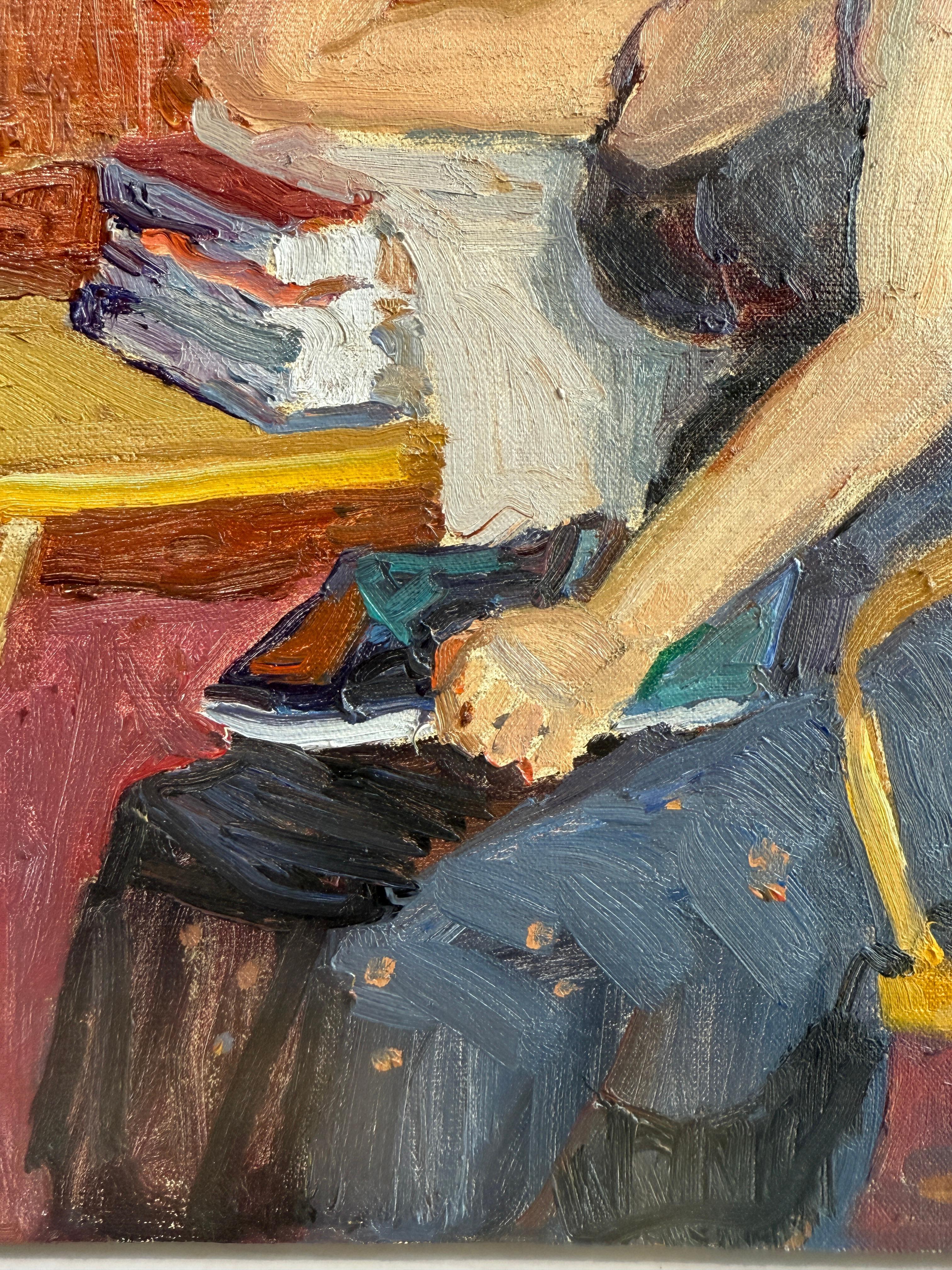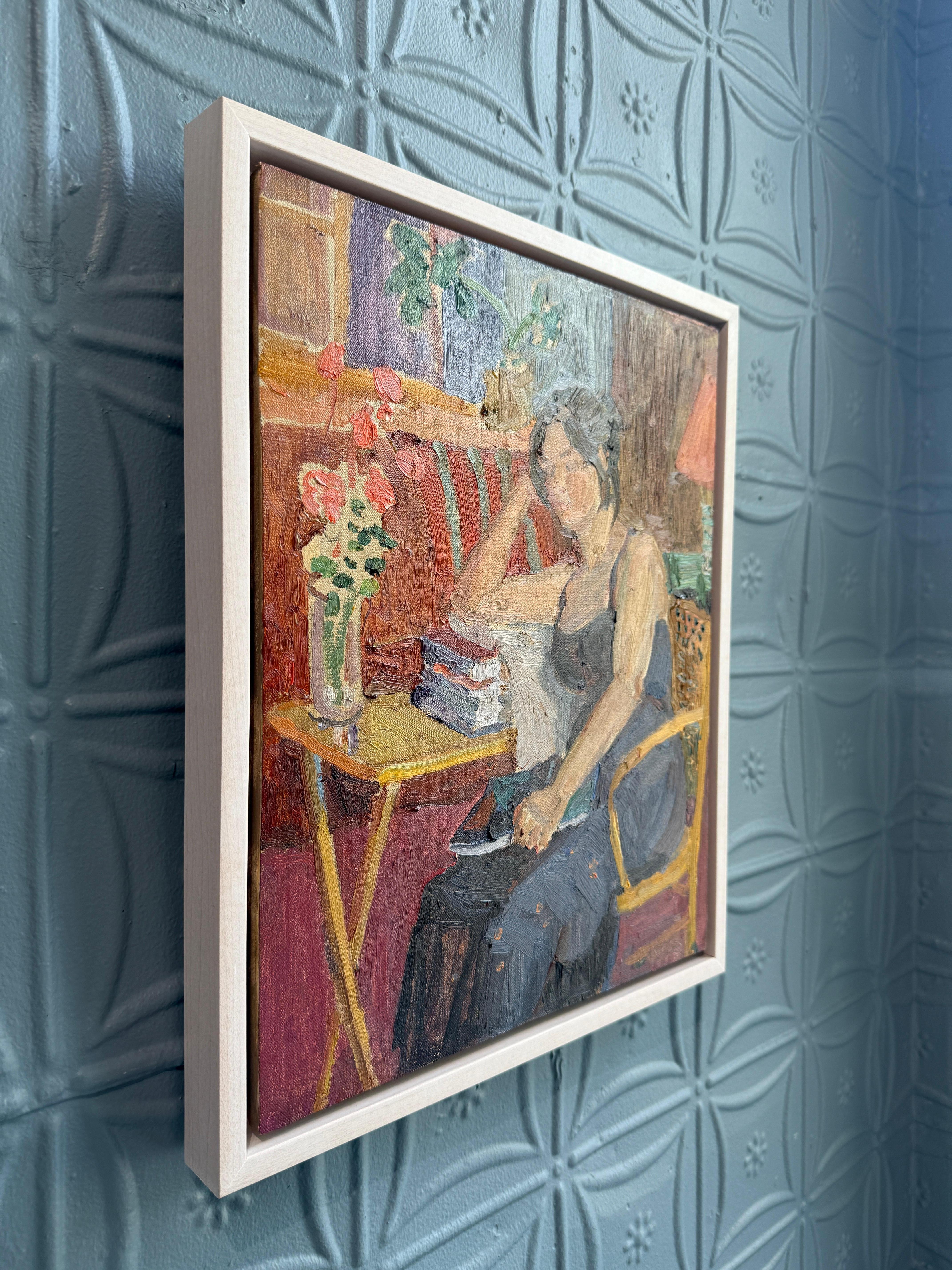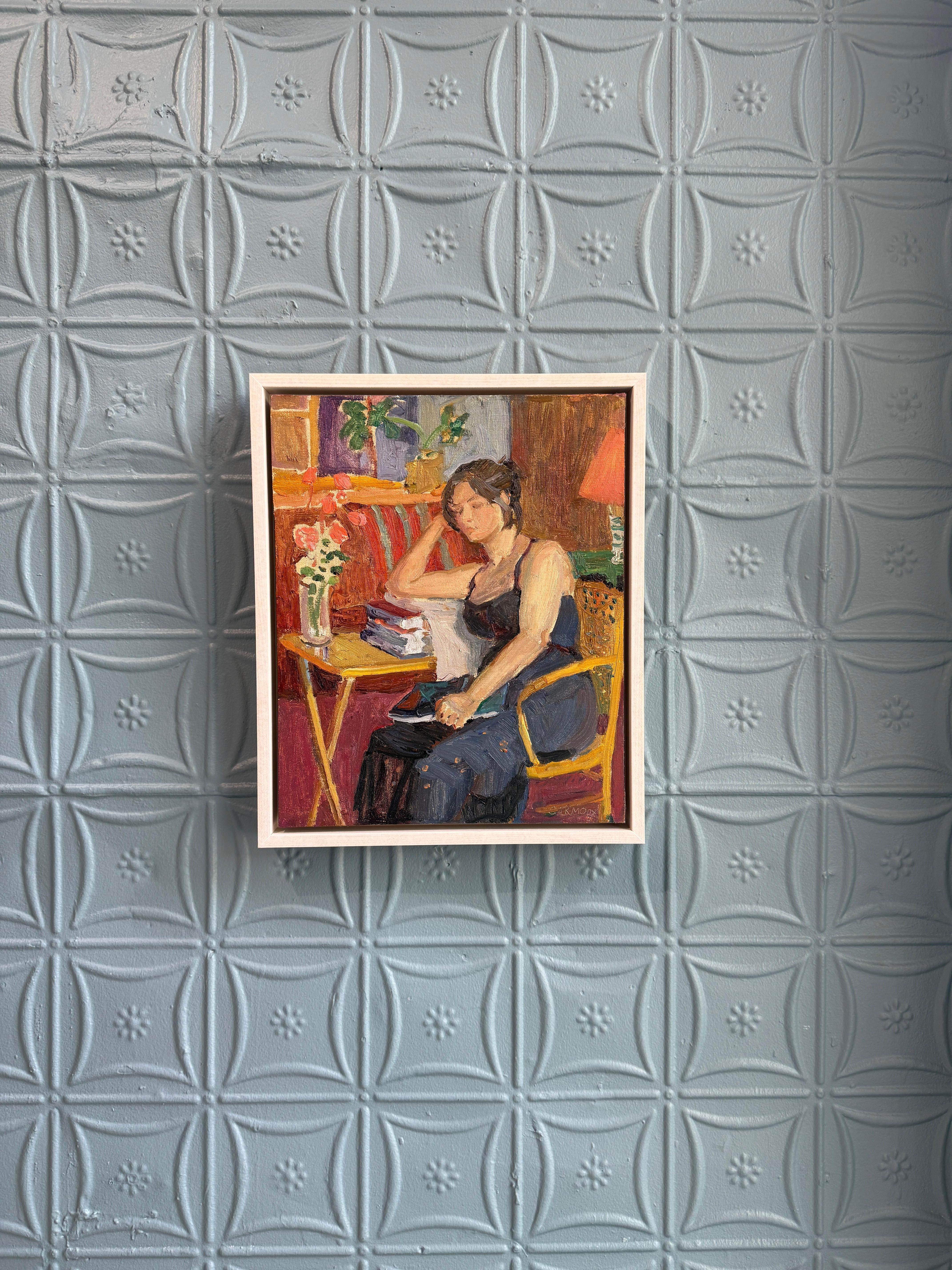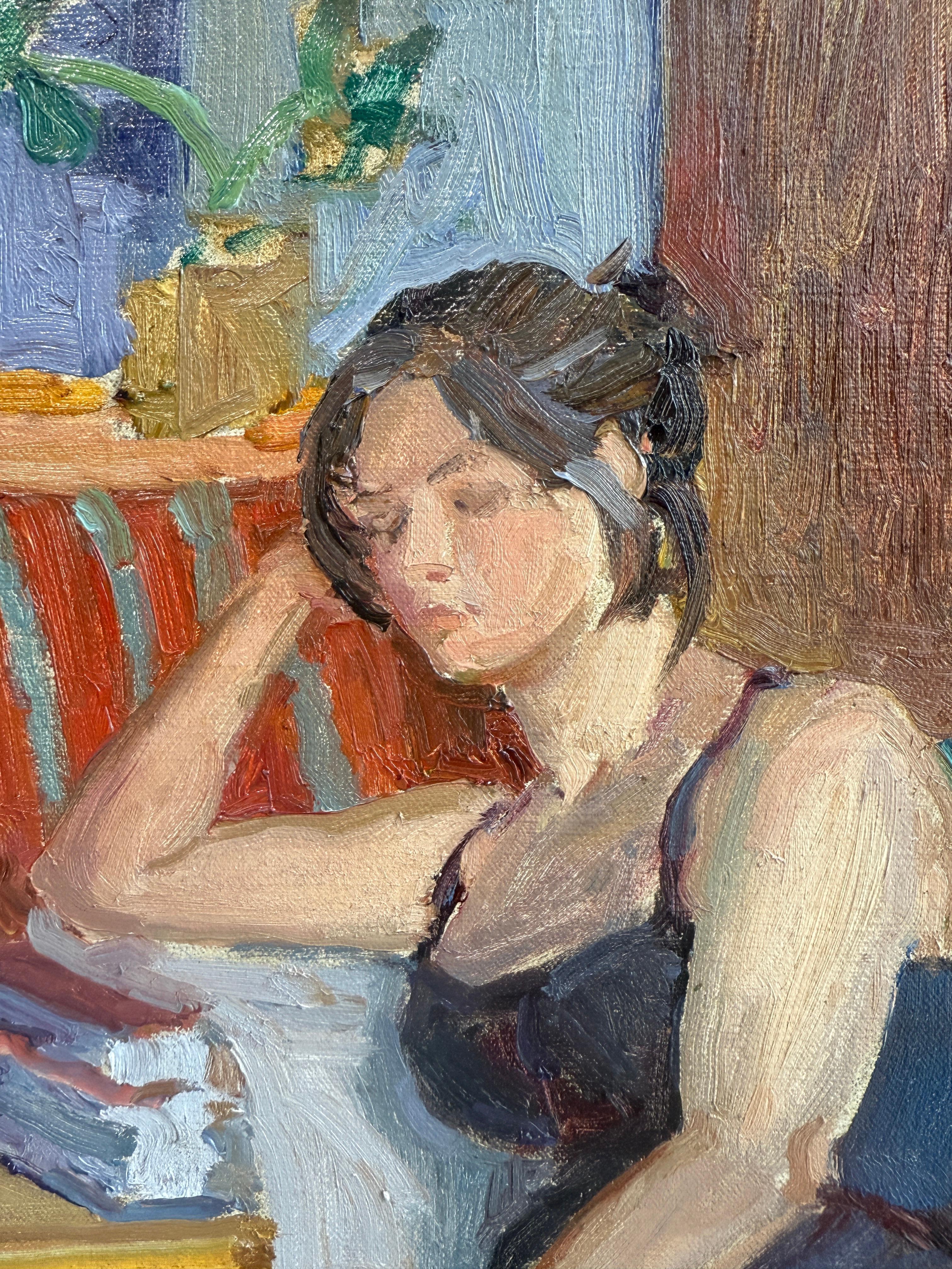 "Interior" von Kelly Carmody ist ein impressionistisches Ölgemälde auf Leinen, das eine von drei Iterationen ist, die der Künstler von dieser Szene gemacht hat. In diesem Prozess begann die Künstlerin mit einem Ölgemälde auf der Grundlage des lebenden Modells vor Ort, dann malte sie ein zweites Gemälde des ursprünglichen Gemäldes, und schließlich schuf sie ein drittes Gemälde auf der Grundlage des zweiten, diesmal auf Papier. Dieser generative Prozess für figurative Werke erlaubte es der Malerei, noch impressionistischer zu werden und mit der Perspektive zu spielen, insbesondere in Bezug auf Tiefe und Flächigkeit. "Interieur" zeigt eine Frau, die auf einem Stuhl sitzt und ihren Kopf mit dem Arm abstützt, während sie sich an einen Bücherstapel rechts von ihr lehnt. Die Augen der Frau scheinen ruhig, ja sogar geschlossen zu sein, wie es für Carmodys Stil typisch ist, in ihren Gemälden Szenen von Frauen in Ruhe darzustellen.