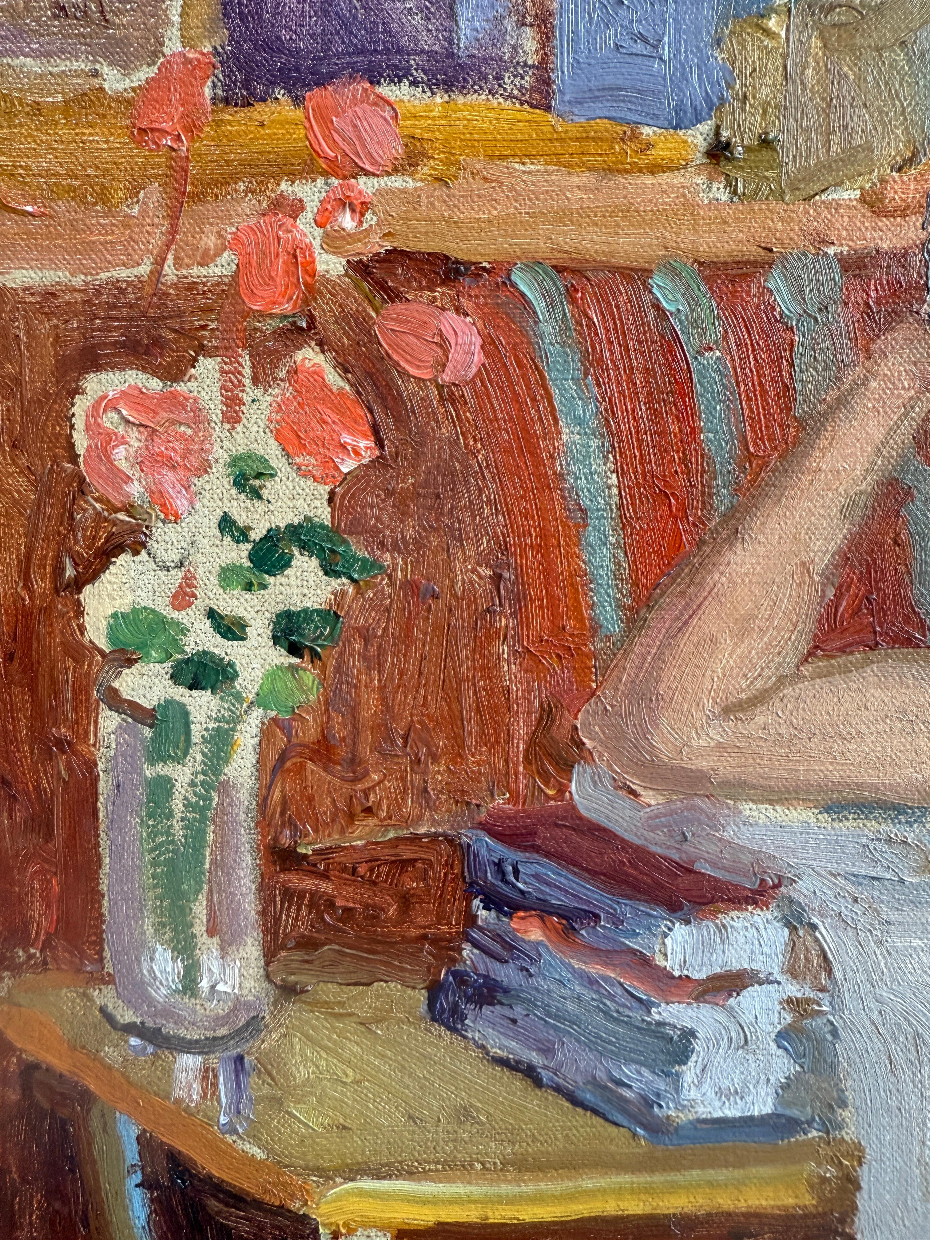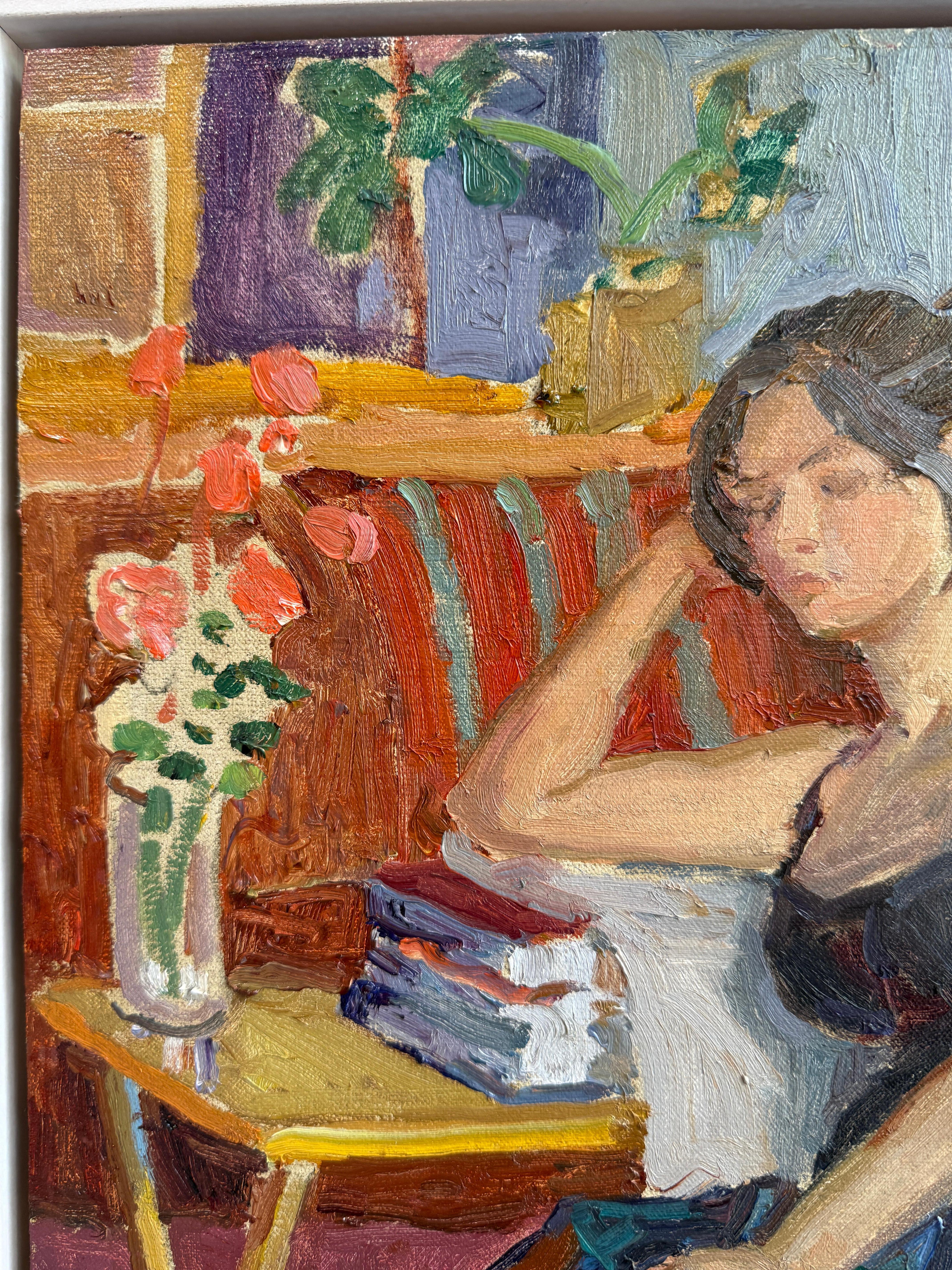 Ein Ölgemälde, das eine ruhende Frau in ihrem farbenfrohen Zimmer zeigt.
