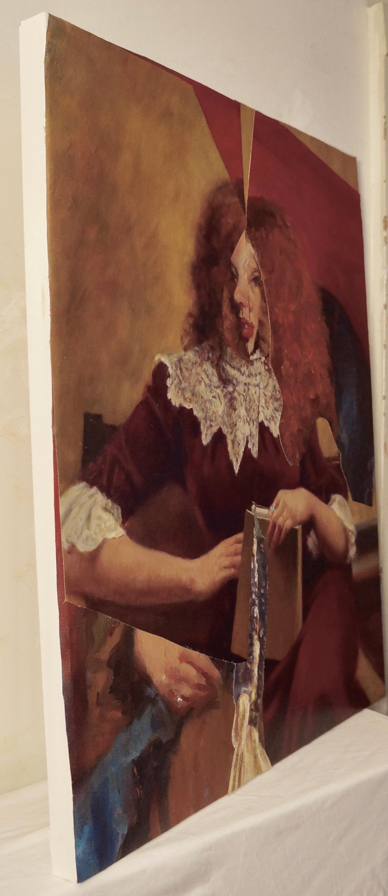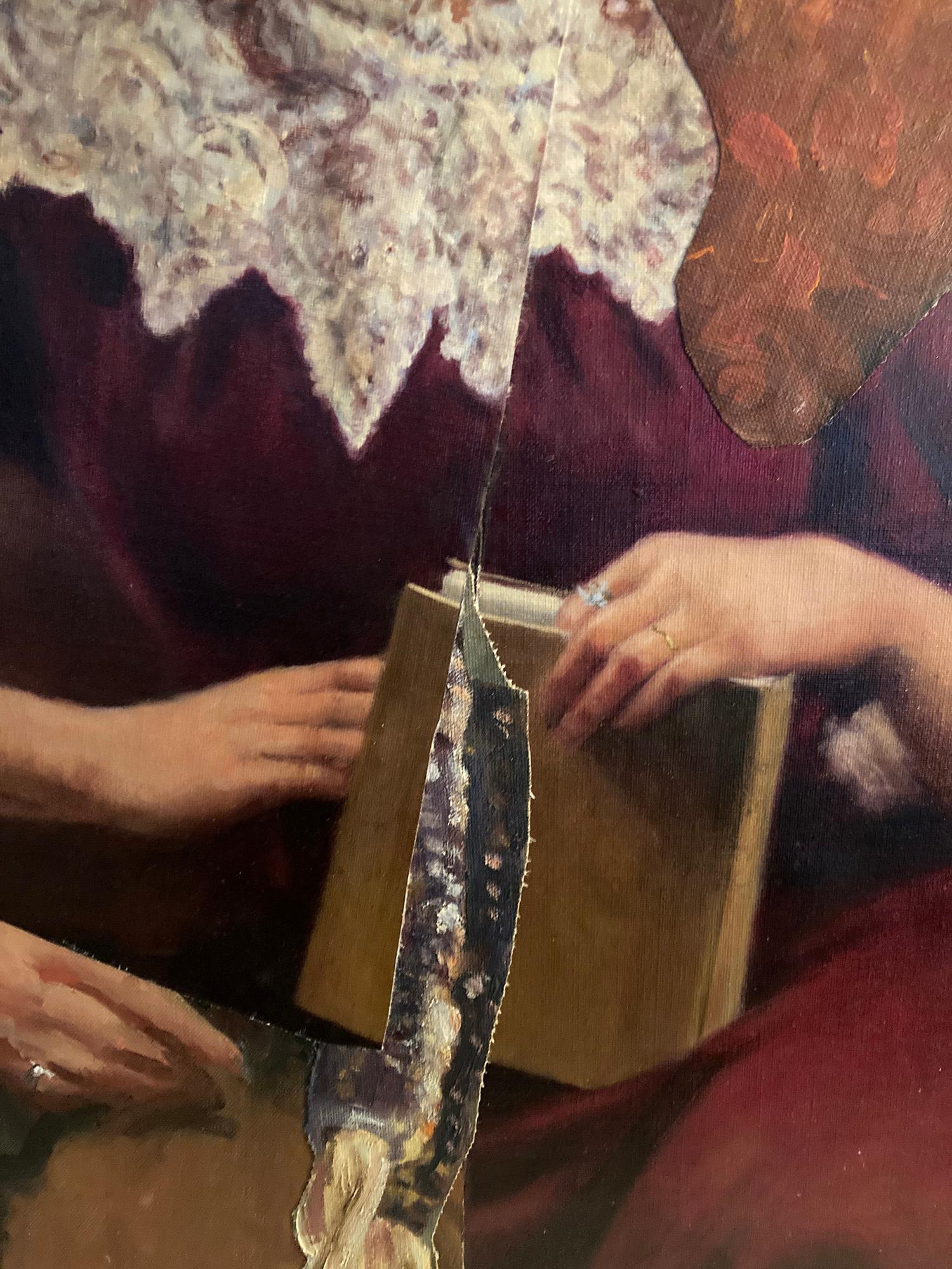 John Baker"Das Buchzeichen", Surrealist, Porträt, Frau, Kastanienbraun, Collage, Acrylmalerei2025