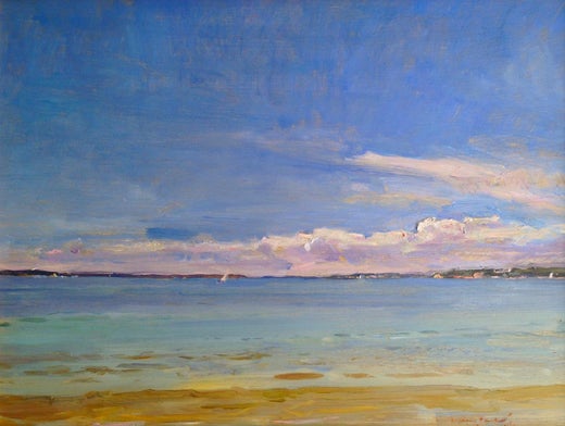 Angel Ramiro Sanchez„Peconic Bay“ Ölgemälde des Meeres unter blauem Himmel mit Wolken, East Long Island2018