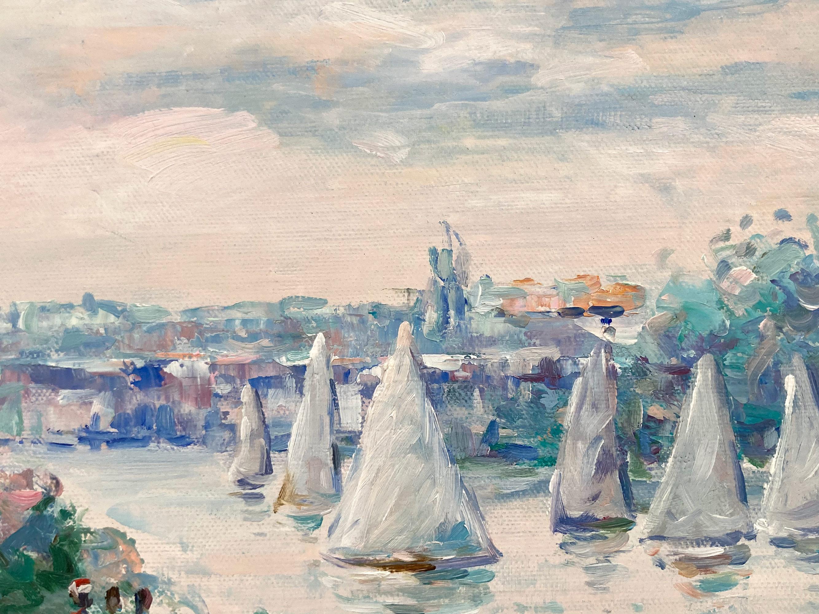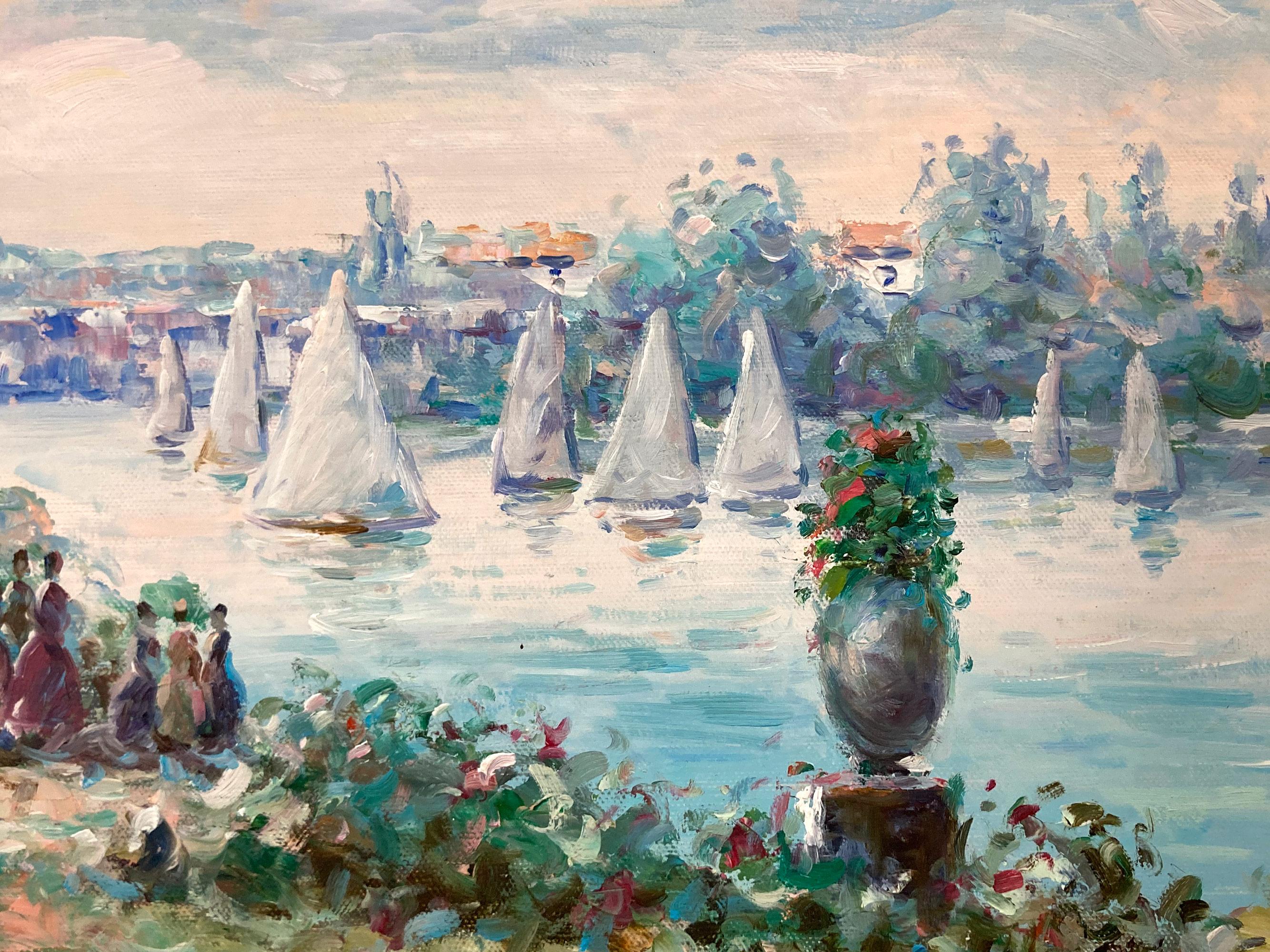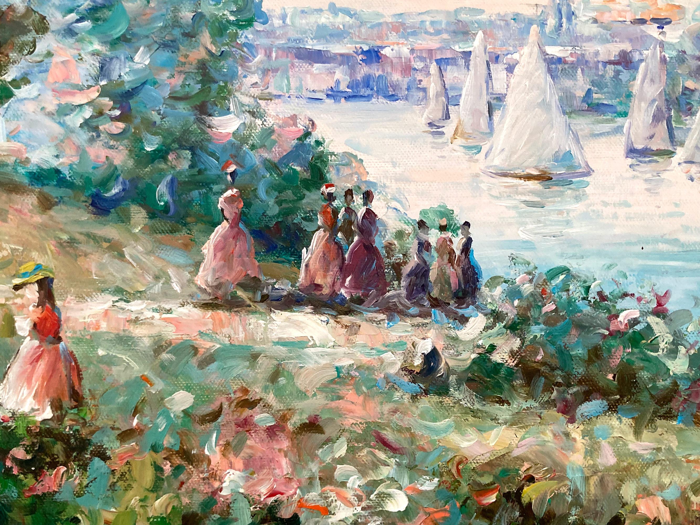 Französischer Impressionist 20. Jahrhundert Landschaftsgemälde Seeszene mit Figuren