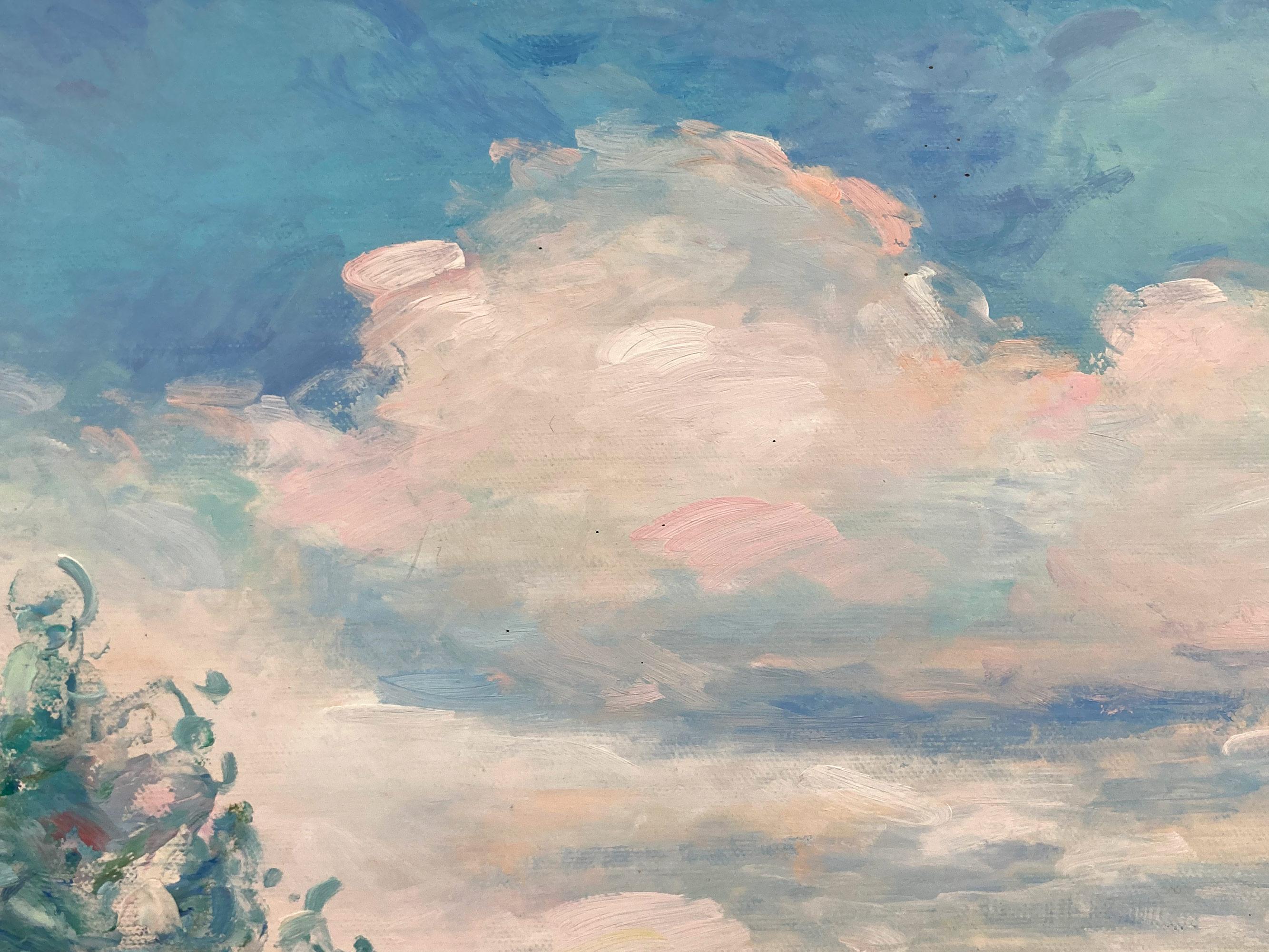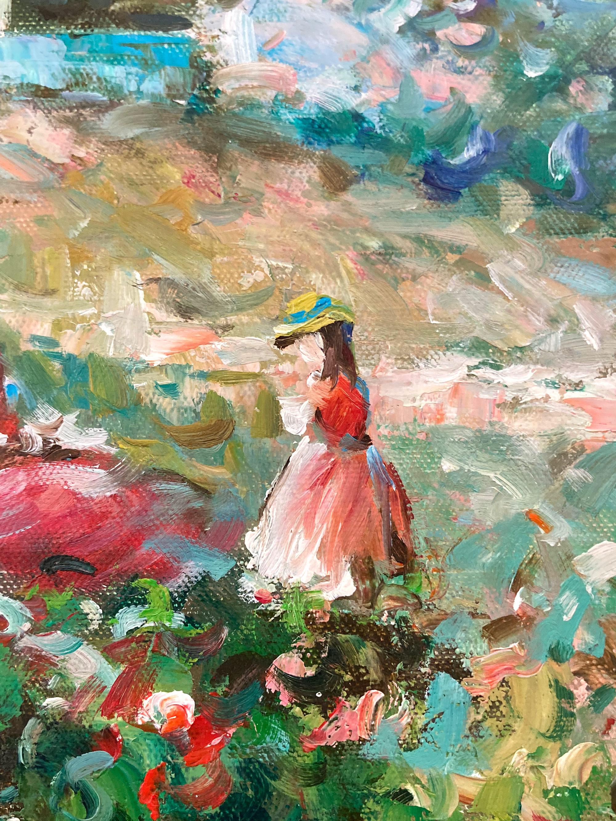 Ein meisterhaftes Ölgemälde, das einen Blick auf eine Küstenlandschaft mit einer Mutter und einem Kind zeigt, die mit einem Regenschirm im Gras bei den Blumen sitzen. Dieses Werk ist...