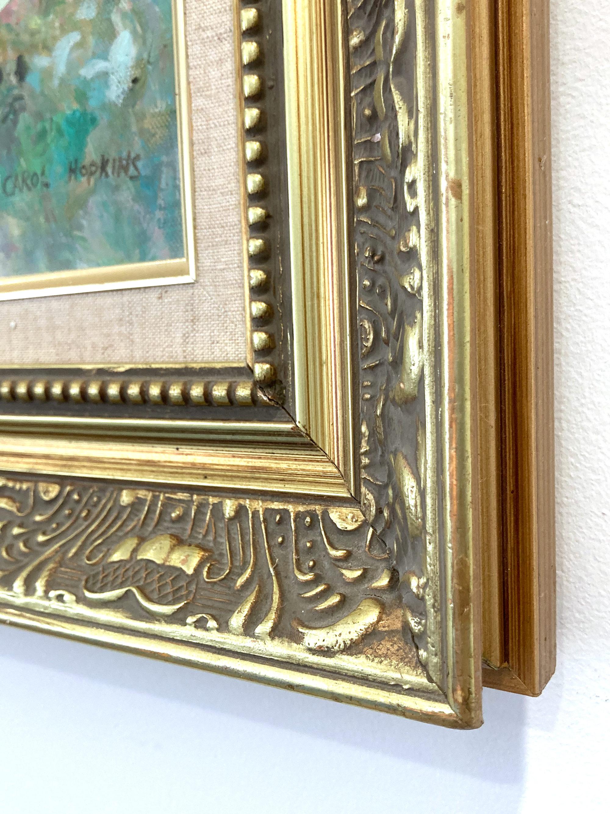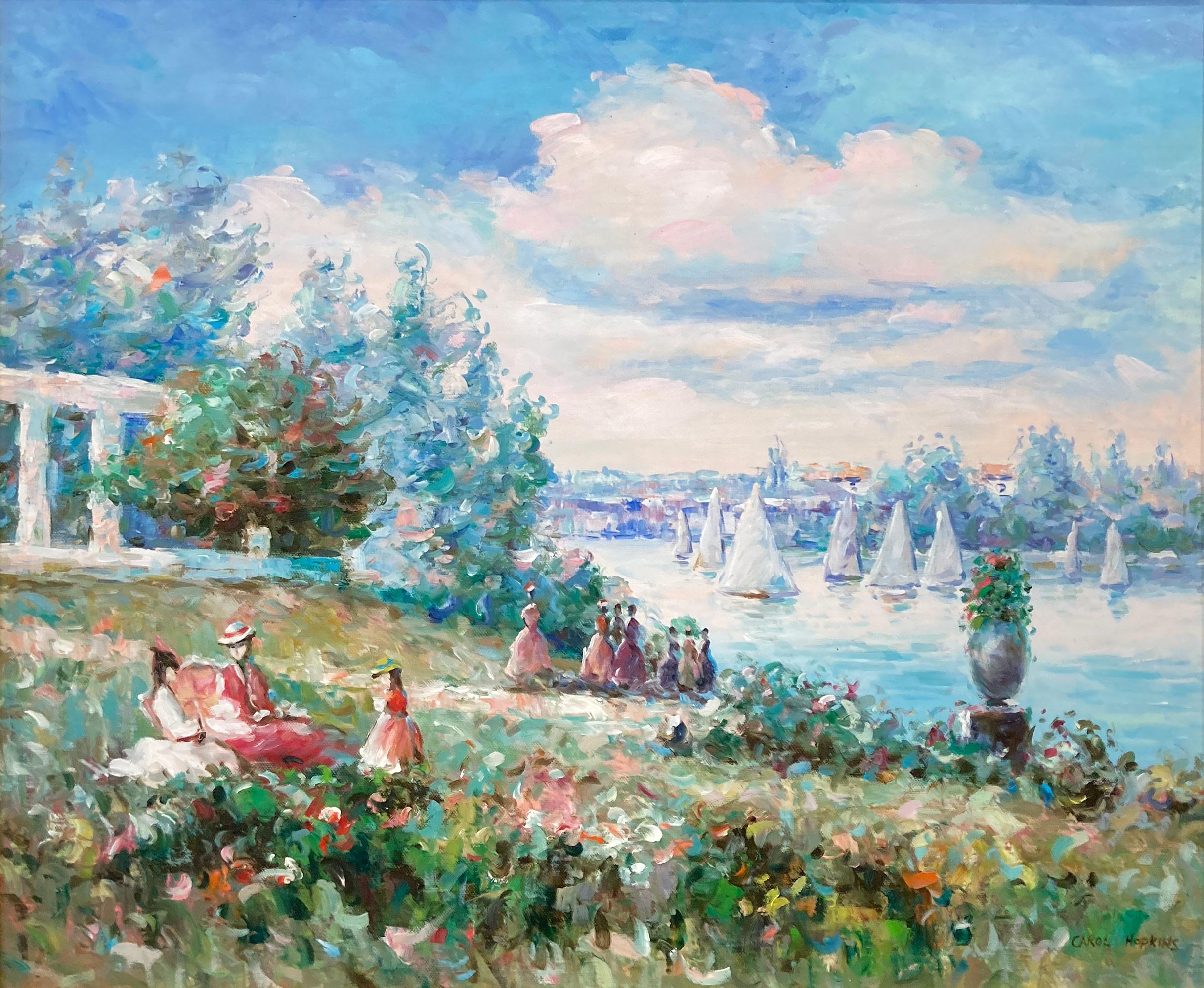 A stunning oil painting depicting figures by the Lakeside in the 20th Century. Carol Hopkins was known for her charming intimate figurative scenes portraying life in the North East. She was active, picking up her subjects from the beaches, parks, restaurants, cities, daily life, and much more. The artist achieves a beautiful rendition of the lakeside with sailboats passing along the water and figures enjoying the beautiful day. The puffed clouds in a blue sky is achieved wonderfully. This piece comes housed in a gold wood frame and signed lower right with hanging wire on verso ready to be displayed.