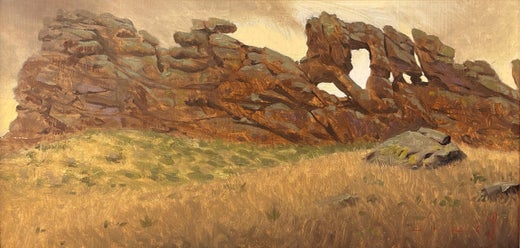 Der Künstler Kent Sullivan fängt das friedliche Glühen des frühen Abends an einem Denkmal in Colorado ein. Der warme Himmel taucht die Landschaft in sa...