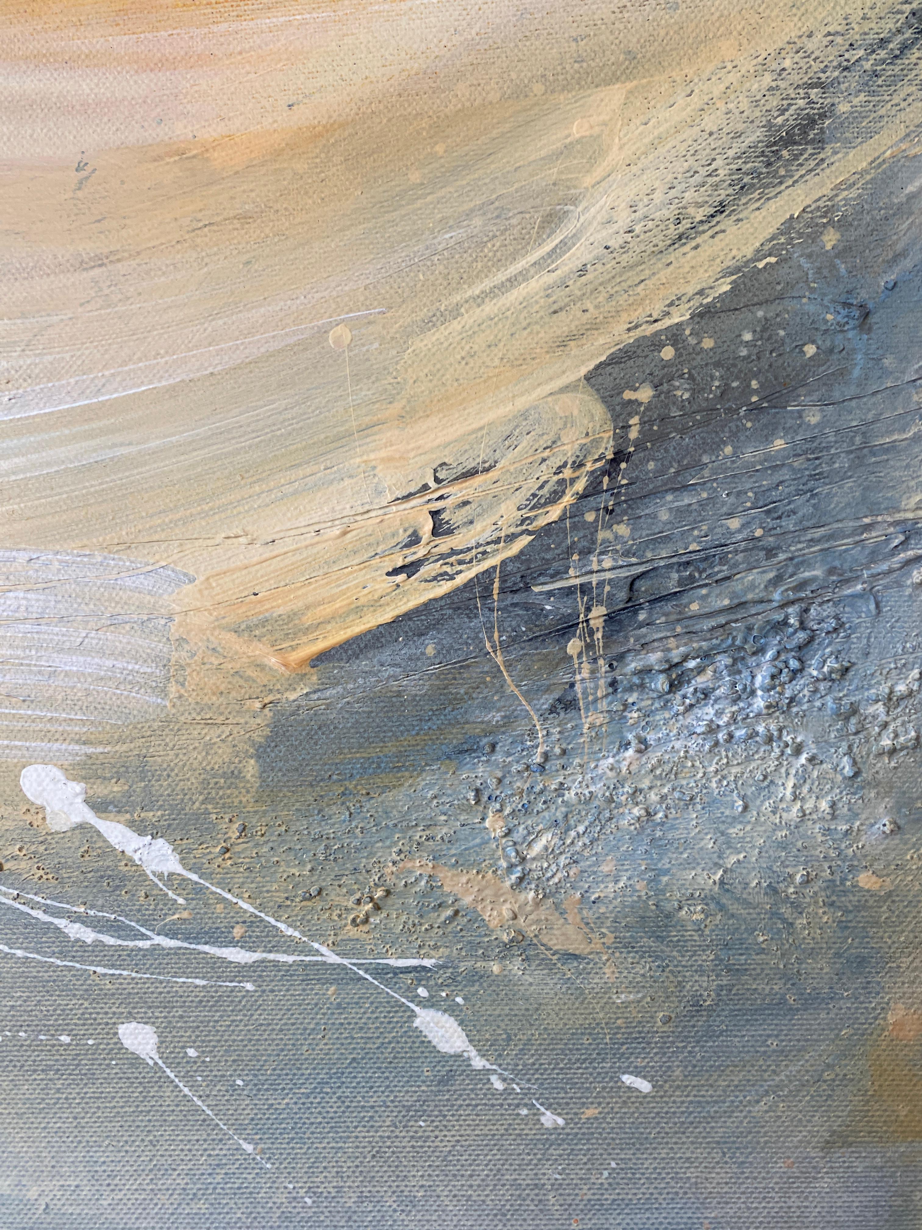 "Authentic Desires/3" von Helen Mount ist ein dynamisches, großformatiges, abstraktes Acrylgemälde, das Aufrichtigkeit, Offenheit und die rohe Energie der inneren Transformation erforscht. Schichten von Beige- und Blautönen vermischen sich mit kräftigen weißen Strichen und Spritzern und schaffen Bewegung, Tiefe und strukturierte Kontraste.