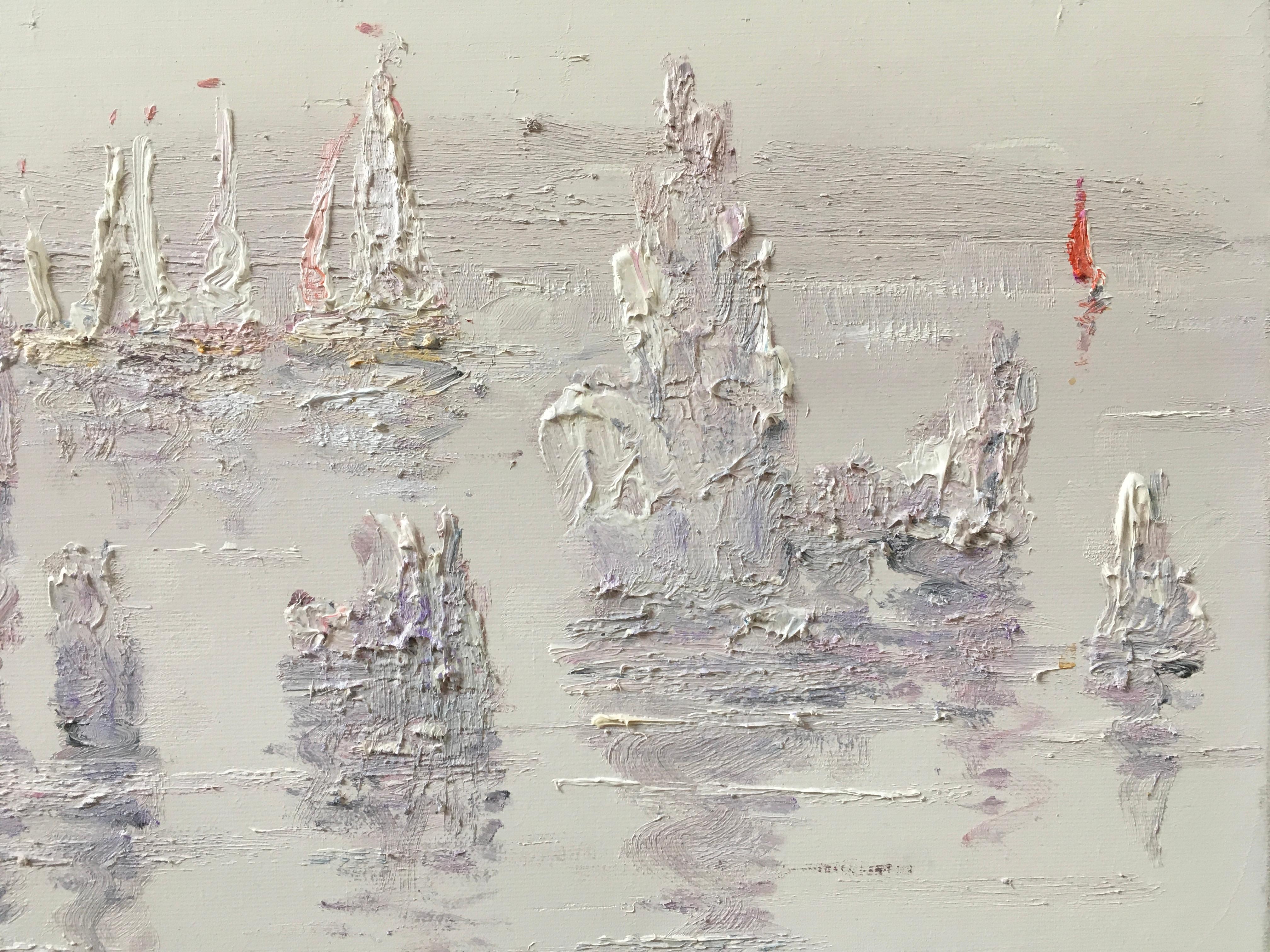 "Dieses Gemälde ist in einem sanften impressionistischen Stil mit Pastellstrichen ausgeführt. Im Vordergrund sind mehrere Segelyachten zu sehen, die auf dem ruhigen Wasser dümpeln. I...