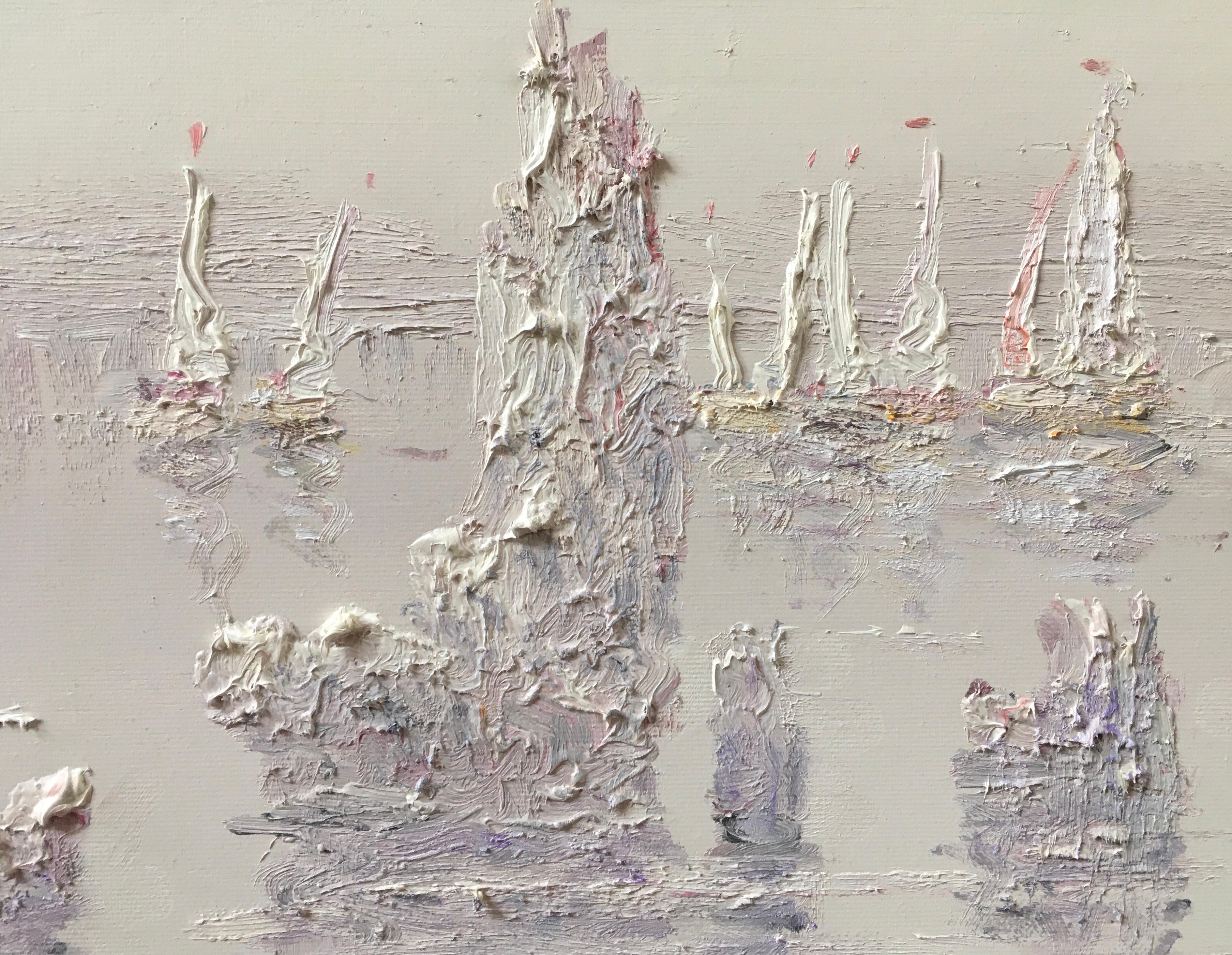 In this painting, the world seems to have melted into a white mush of paint. The sea, the sky, the ships—everything has merged into a kind of pasty abyss, where thick lumps of paint cling to the canvas like foam on forgotten coffee. The sails resemble ghosts stuck in the fog, and the water is like a mirror that someone wiped with a palette knife and forgot to finish.