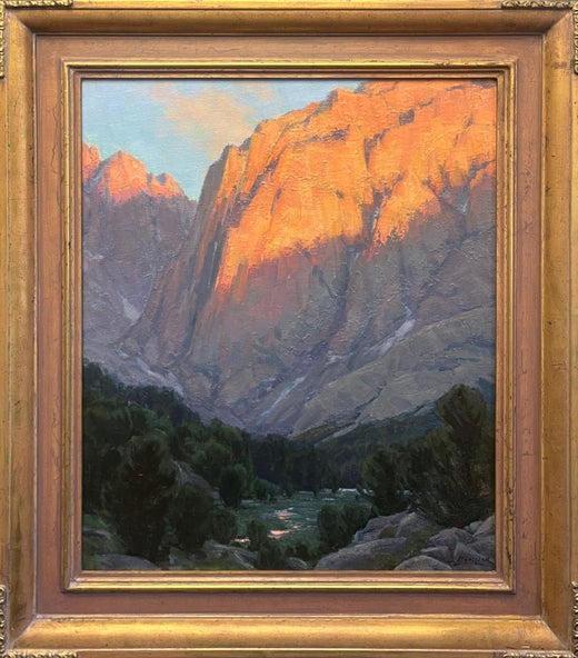 "In der Nordgabel des Big Pine Canyon in der Sierra Nevada Ridge gelegen, beherrscht Temple Crag die Landschaft. Ich habe diesen Gipfel bei jedem Wetter und zu jeder Tageszeit gemalt, aber wenn die Sonne tief steht und das warme Alpenglühen über das Gesicht spielt, fühle ich mich am demütigsten und verehrt."