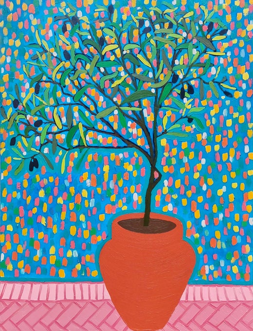 Inspiriert von meiner inneren Reise schuf ich eine Serie von kleinen Stillleben und Landschaften, die sich um ein marokkanisches Thema drehen. Diese leichten, strahlenden und leicht naiven Gemälde heben den einzigartigen Charakter jedes einzelnen Zitronenbaums hervor. Die Erzählungen aus dem Orient haben mich als Kind in ihren Bann gezogen, und heute ist Marokko meine Oase der Inspiration.