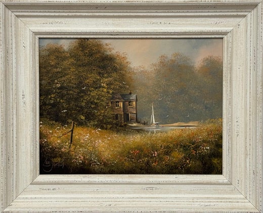 Dieses bezaubernde Gemälde zeigt eine idyllische Flussszene, die in einem verschnörkelten Goldrahmen im antiken Stil eingefasst ist, der das nostalgische Ambiente noch unterstreicht. Die Komposition zeigt ein friedliches Landhaus inmitten von üppigem Grün und zarten Blumen, die am Flussufer blühen. Der weiche, neblige Hintergrund und das ruhige Wasser spiegeln die Wärme und Gelassenheit eines sonnigen Tages wider und versetzen den Betrachter in einen ruhigen, traumhaften Rückzugsort.