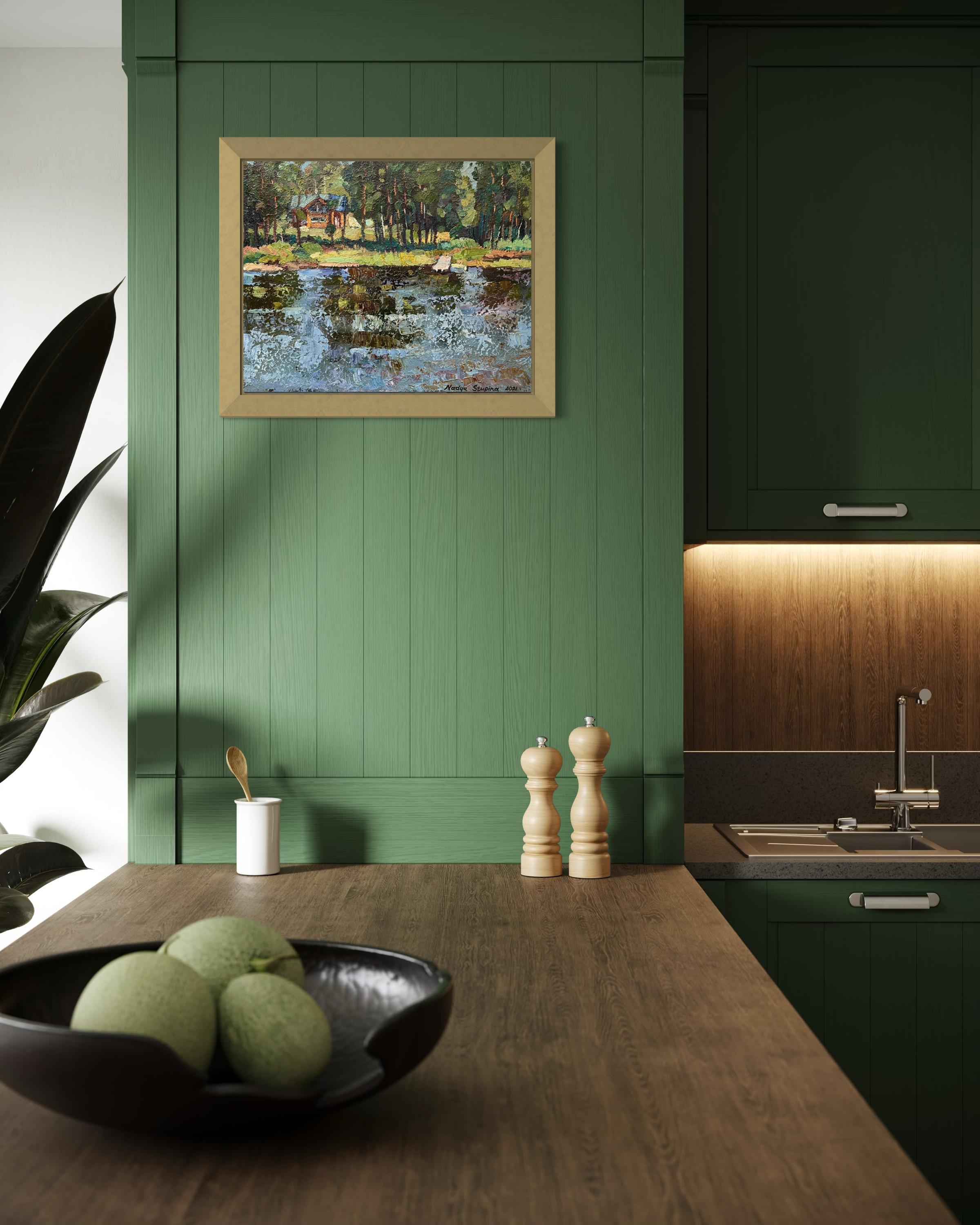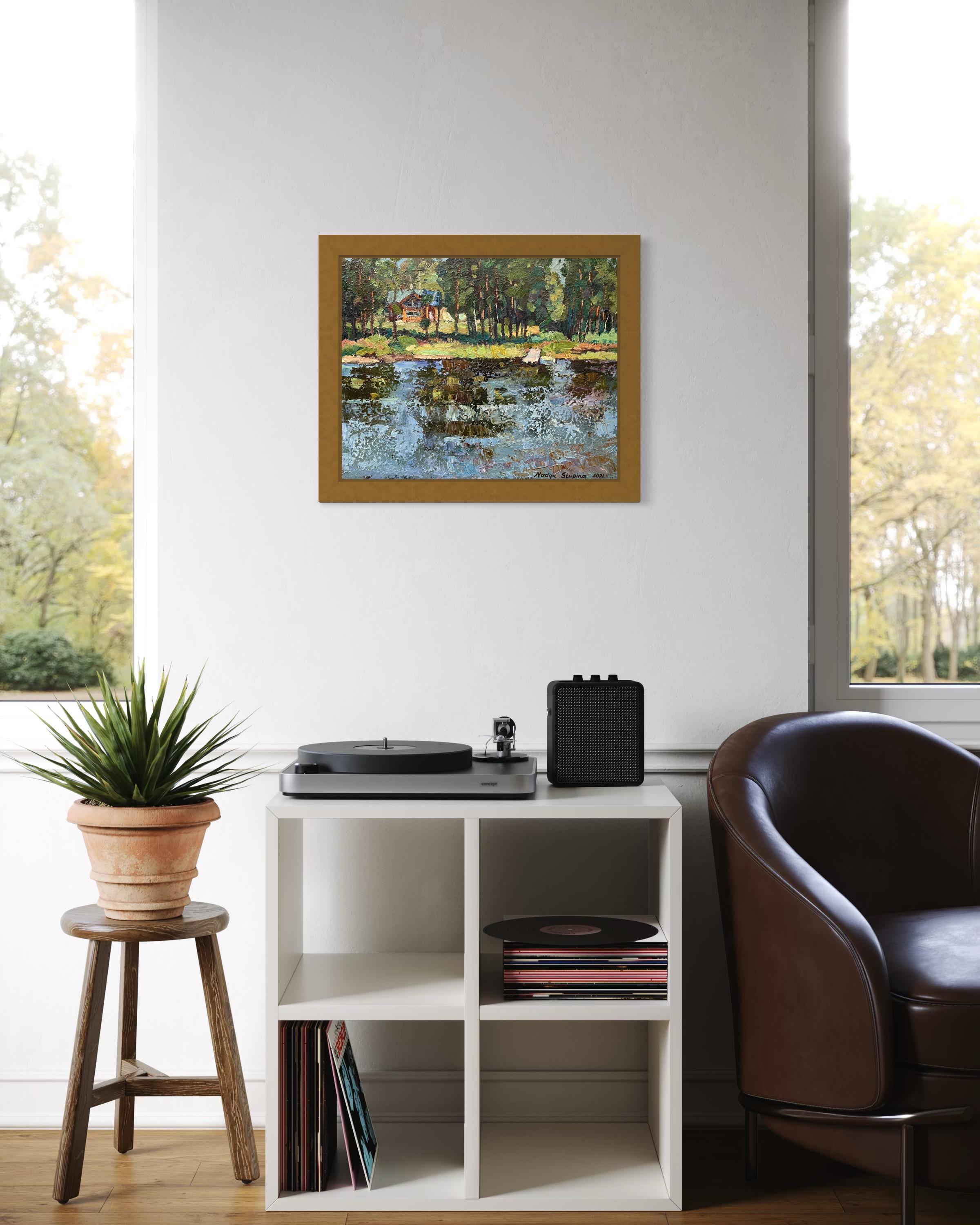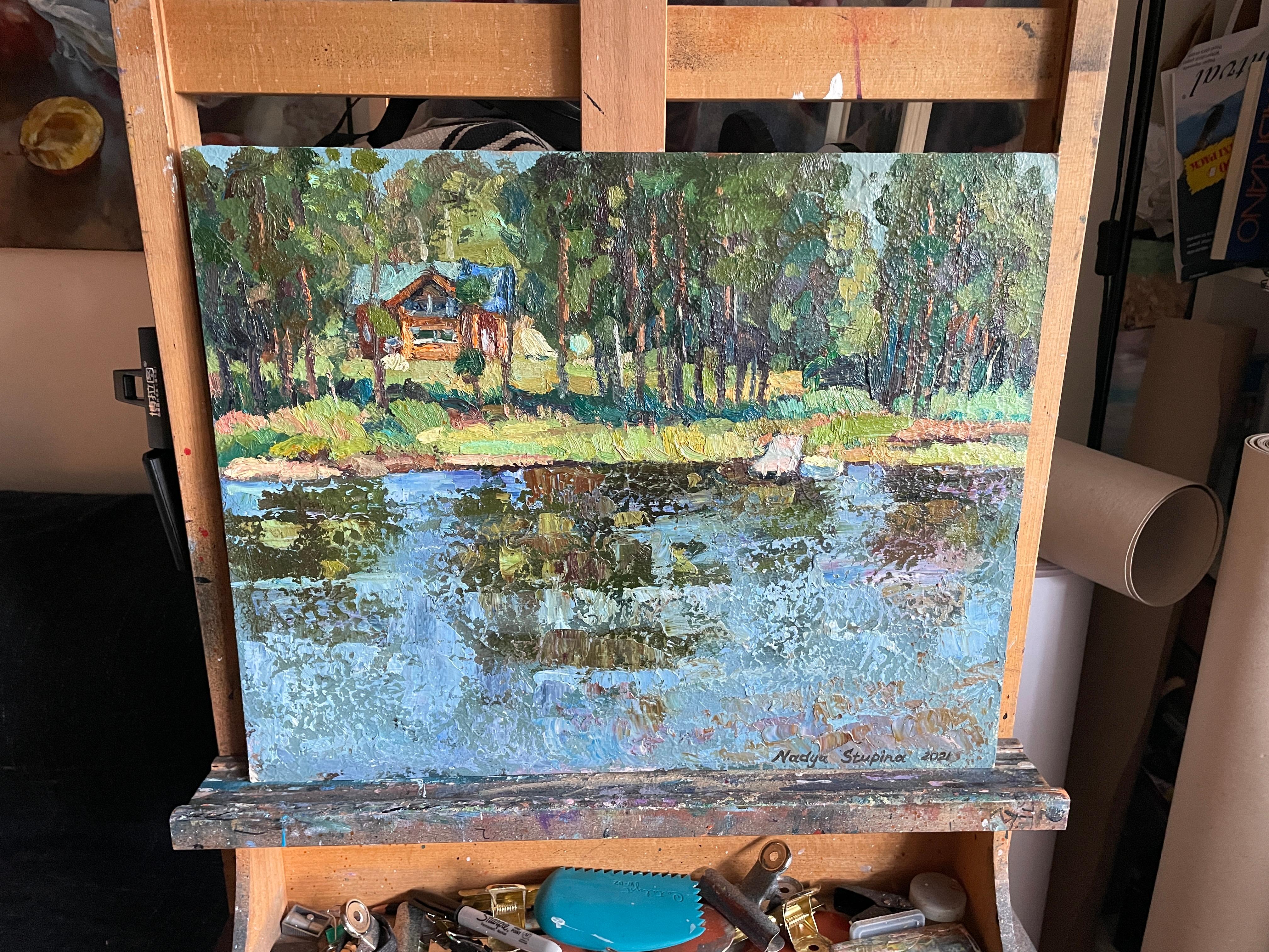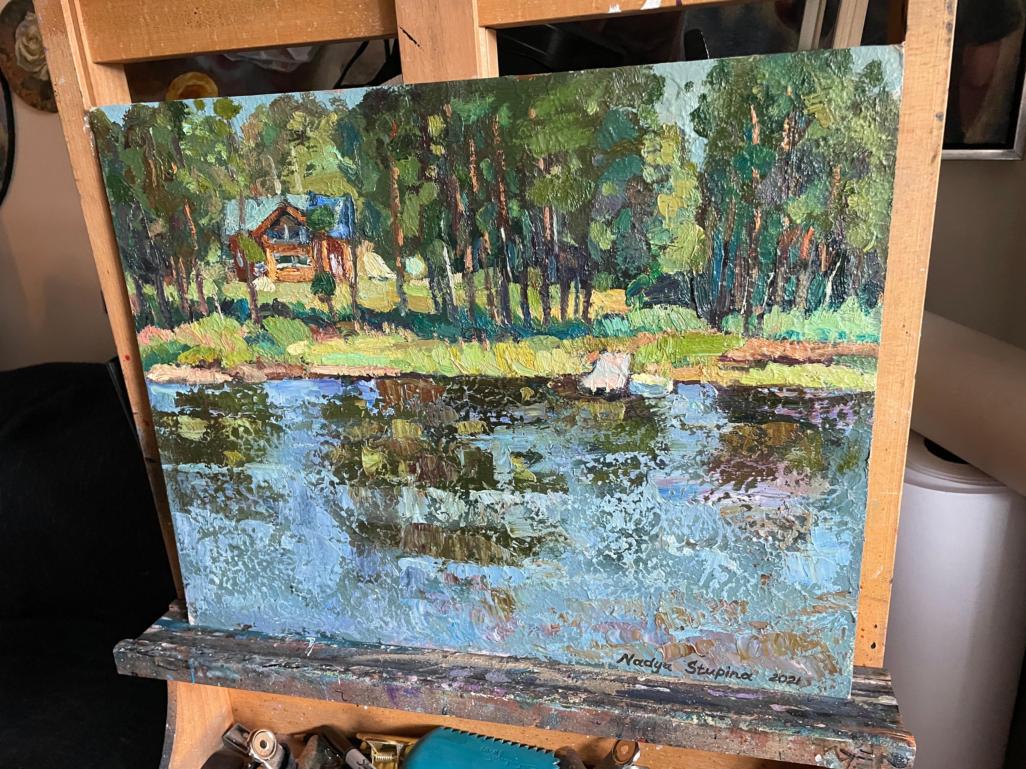 Nadezda Stupina"Das Haus am See" Original impressionistisches Landschaftsgemälde.2021