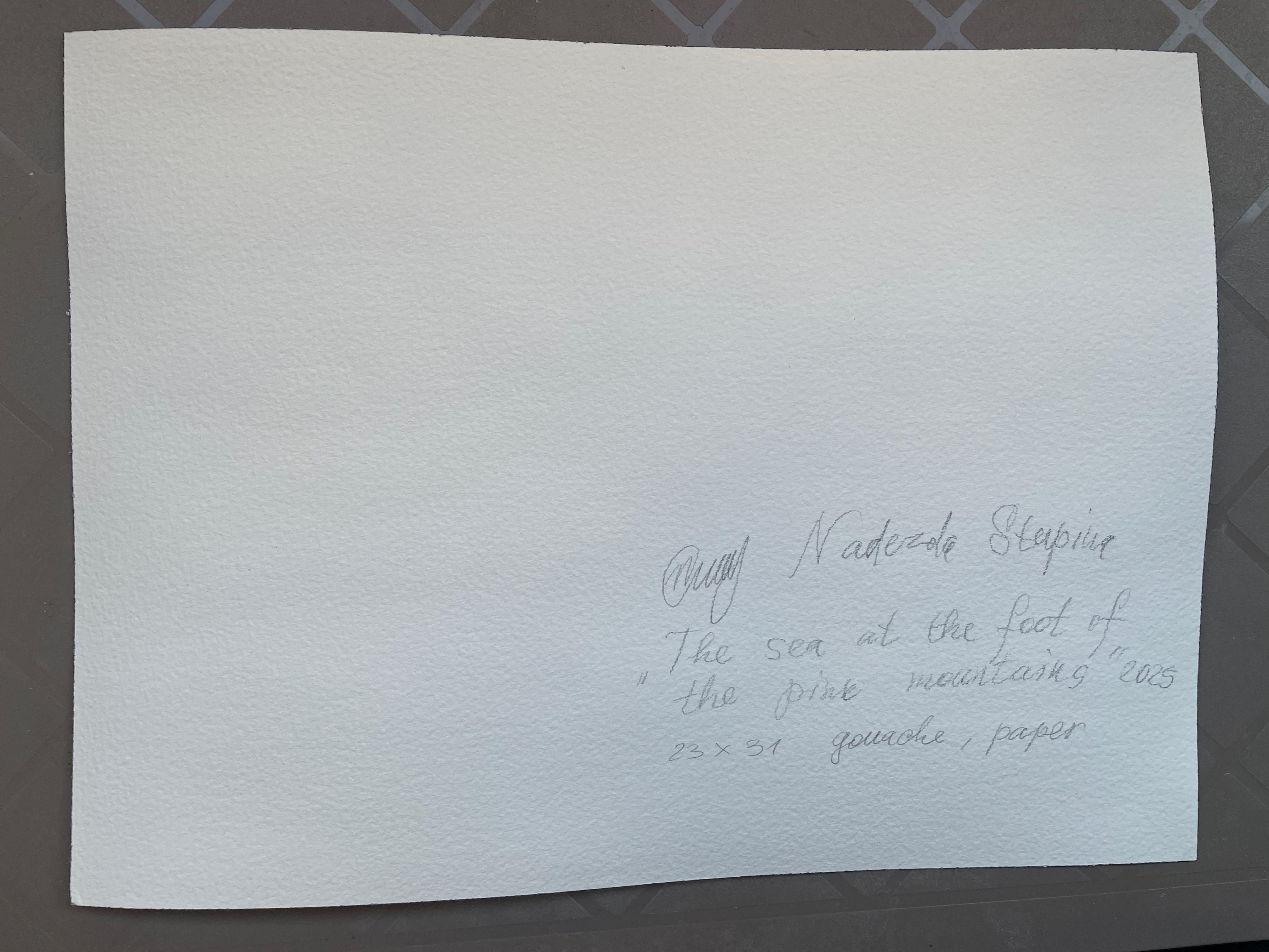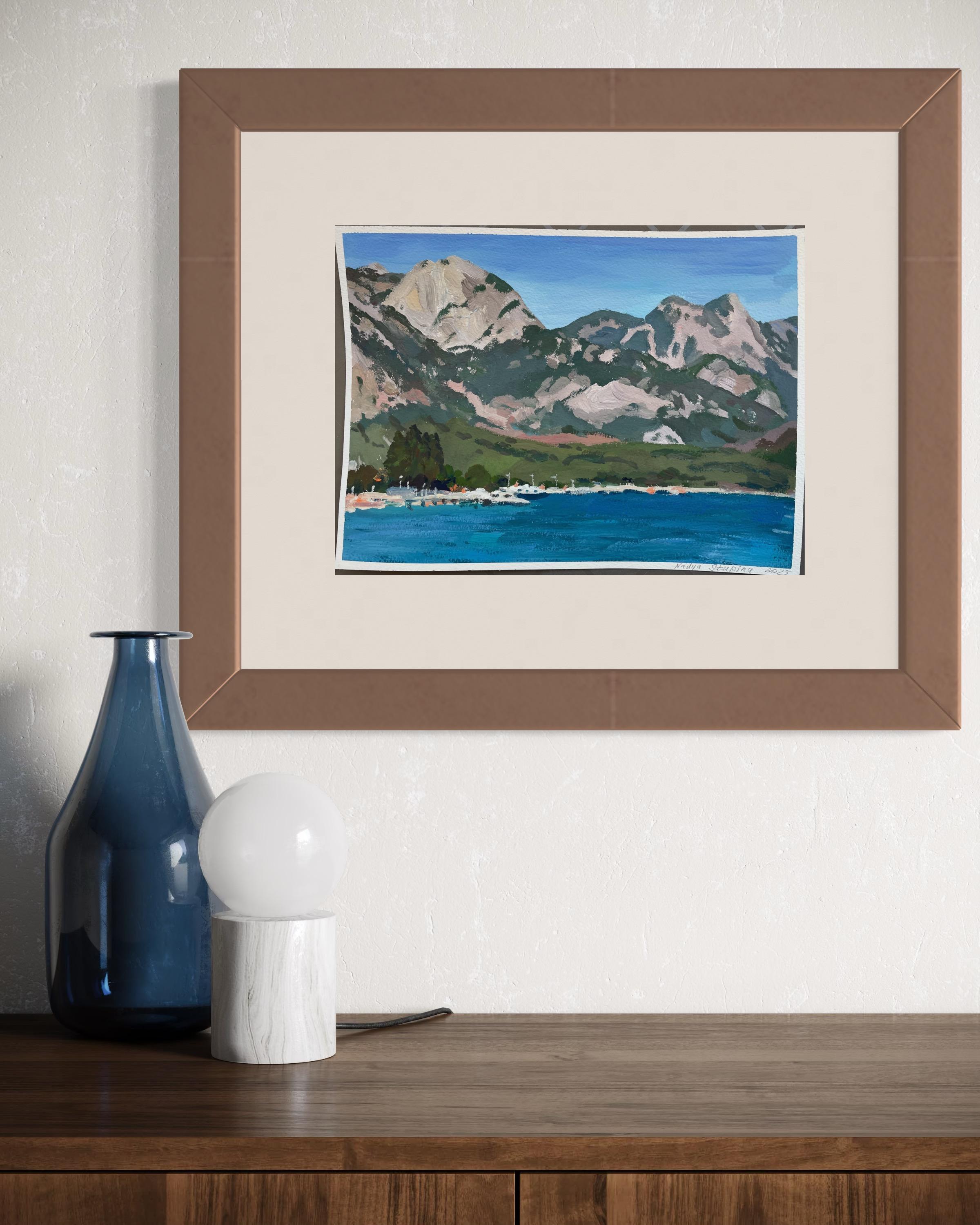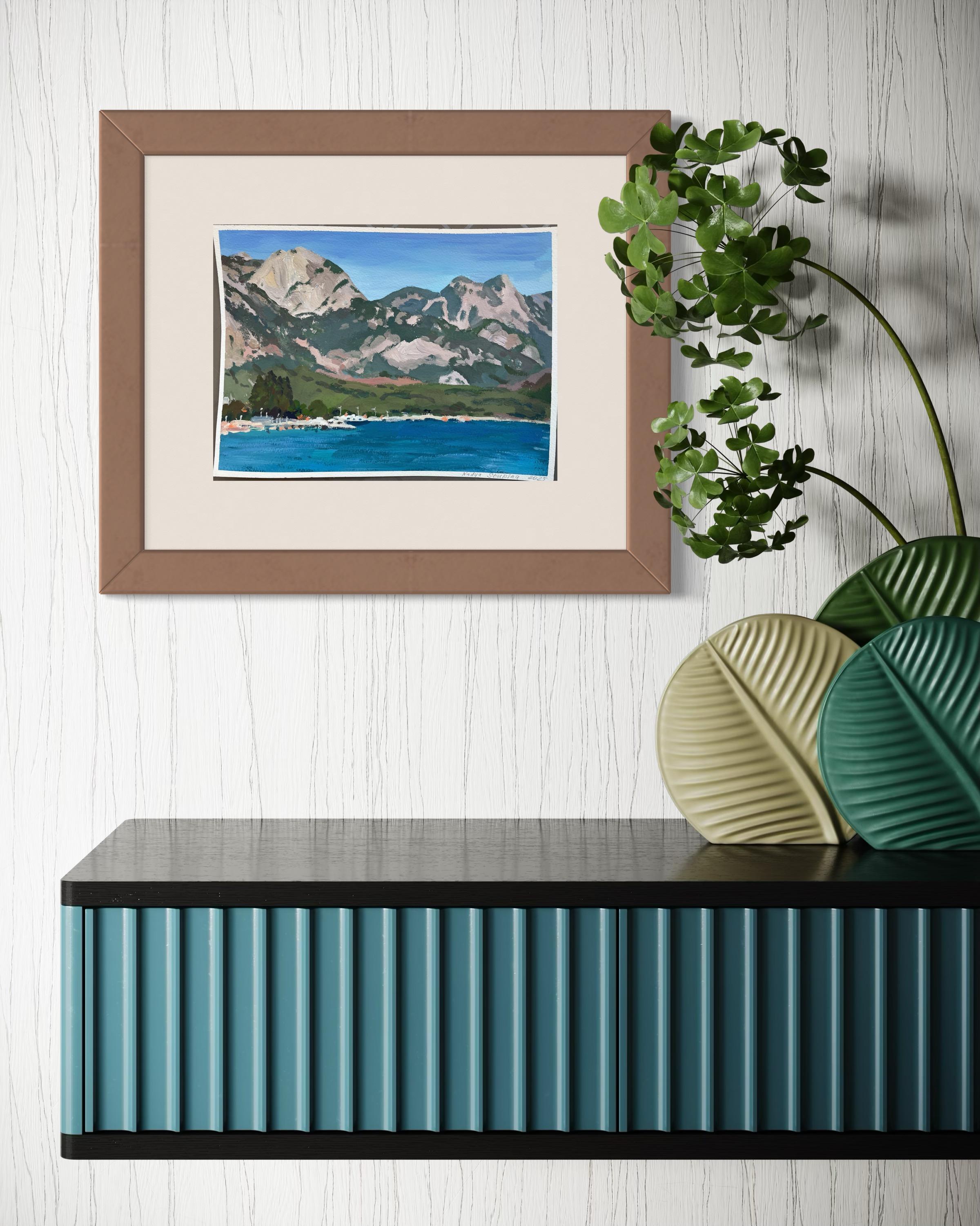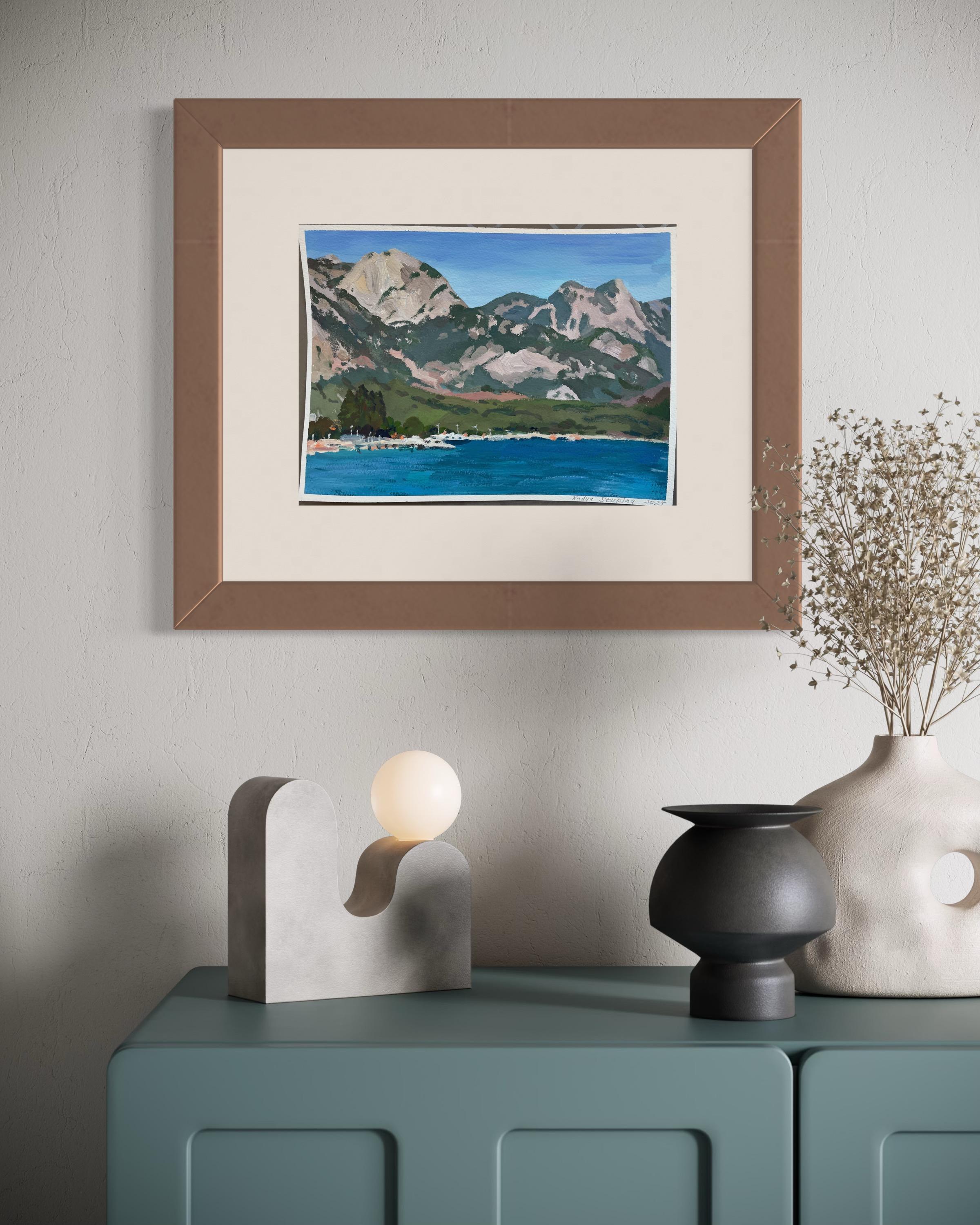Nadezda Stupina"Das Meer am Fuße der rosa Berge" Original Landschaftsgemälde, klein .2025